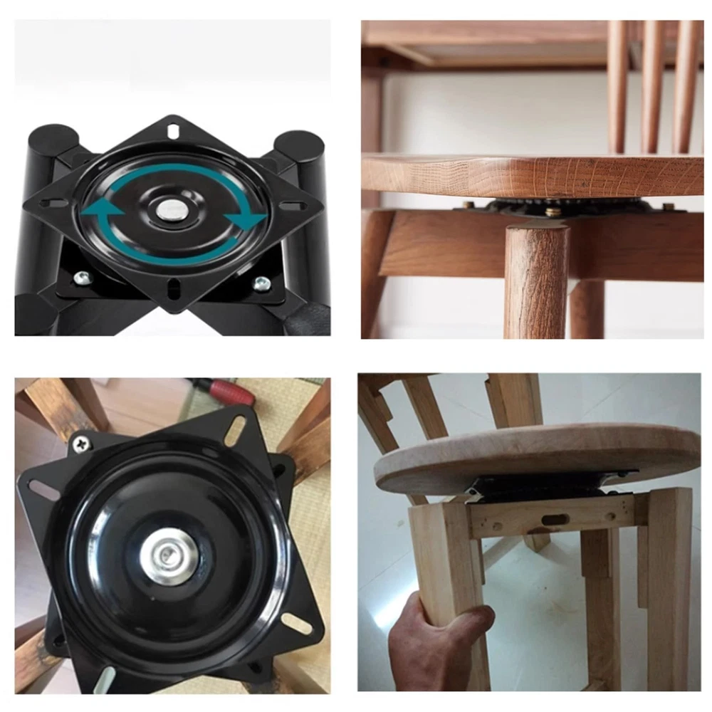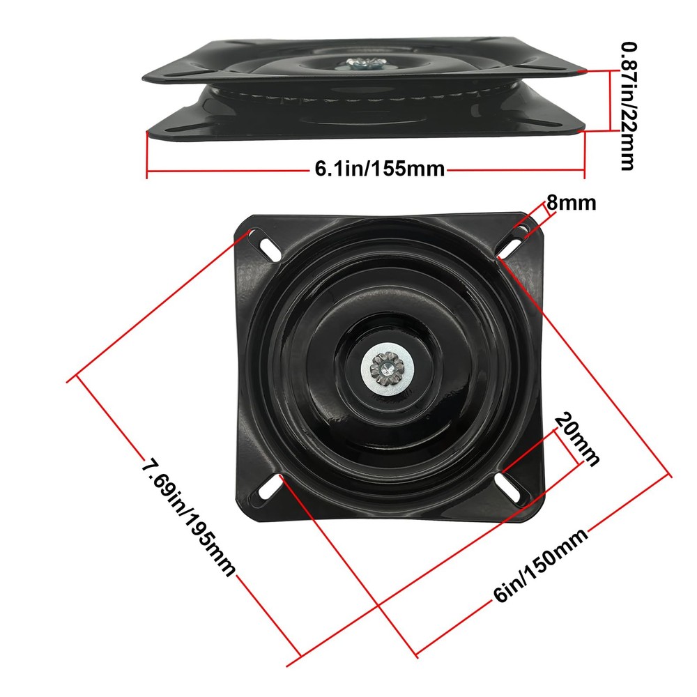 SPECIFICATION Material: Heavy Duty Steel Shape: Square Color: Black Size: 6.25" x 1" Steel plate thickness: 2.0mm Load capacity: 130-175 lbs Rotation angle: 360°continuous rotation Ball bearing: Full ball bearing all the way around Package Include: 1 Pack 6.25” Heavy Duty Bar Stool Swivel Plate Notes: 1.Please allow a slight size error due to manual measurement. 2.Please allow a slight color error due to different displays HEAVY DUTY SWIVEL PLATE Heavy Duty Bar Stool Swivel Plate, 360°Rotating Square Rotating Swivel Plate, Bar Stool Seat Turntable, Mount Plate for Bar Stool and Chair Ball Bearing Swivel Seat Table STURDY & WELL-CONSTRUCTIVE:Bar stool swivel plate is made of high quality solid stee with black coating finishedl, which is thicker than regular swivel plate, so it is more solid and reliable EFFICIENT OPERATION & STABILITY:Smooth seat swivel base mount plate with hidden interior ball bearing track, allowing for efficient operation and maximum stability; Long-time service life, which difficult to deform and crush with low noise. 360 FREE & SMOOTHLY ROTATION:The swivel plate is full 360 degree rotation on pre-lubricated ball-bearings in full round track and full ball bearings makes this swivel plate more durable BAR STOOL SWIVEL :Size: 6.25" x 1", steel plate thickness: 2.0mm, load capacity: 130-175lb (Mounting hardware not included) WIDE APPLICATION:Swivel plate mechanism is perfect for bar stools, chairs, boat seat, kayak seat, display stand, TV stand, murphy bed, swivel stand, desk swivel, swivel stand, ect.