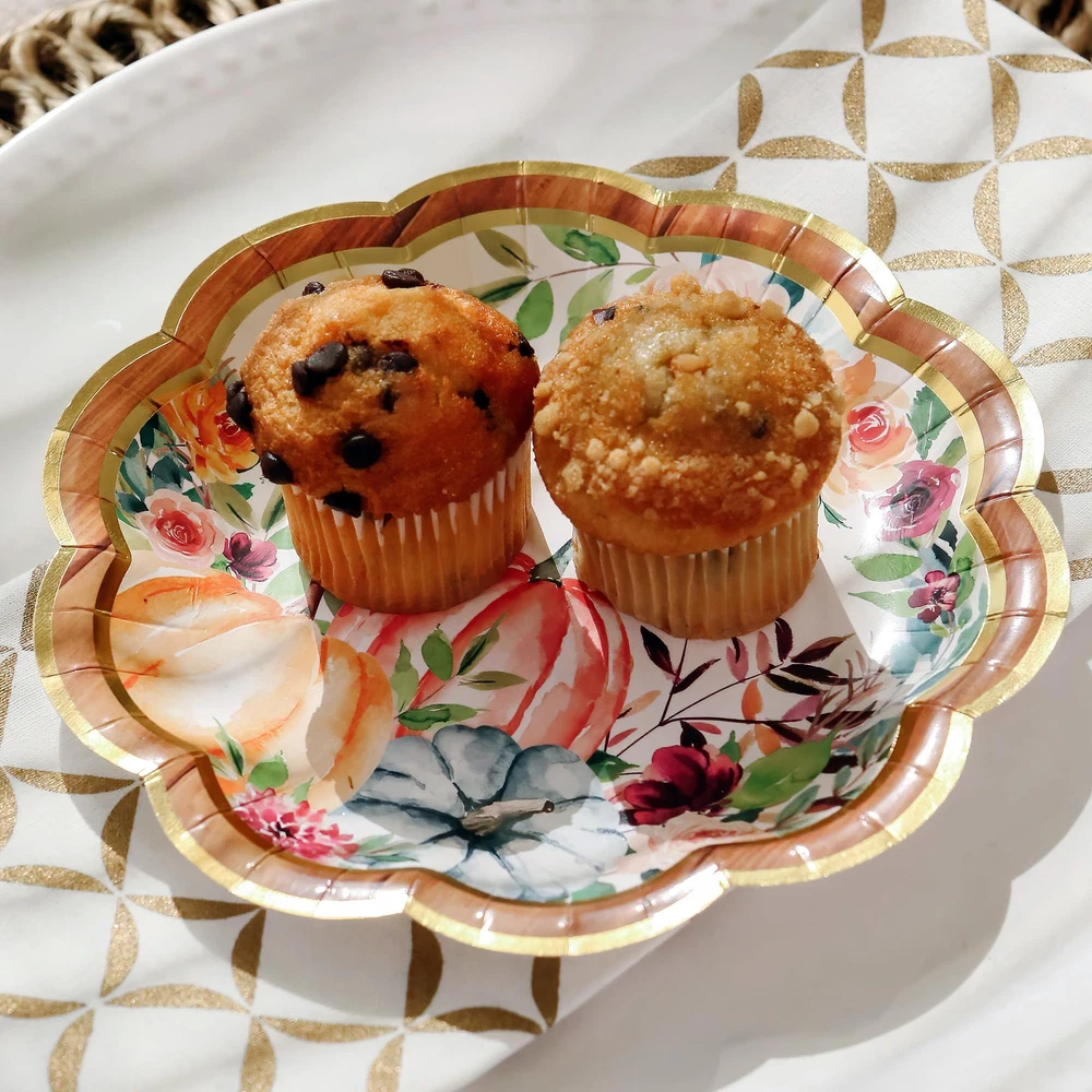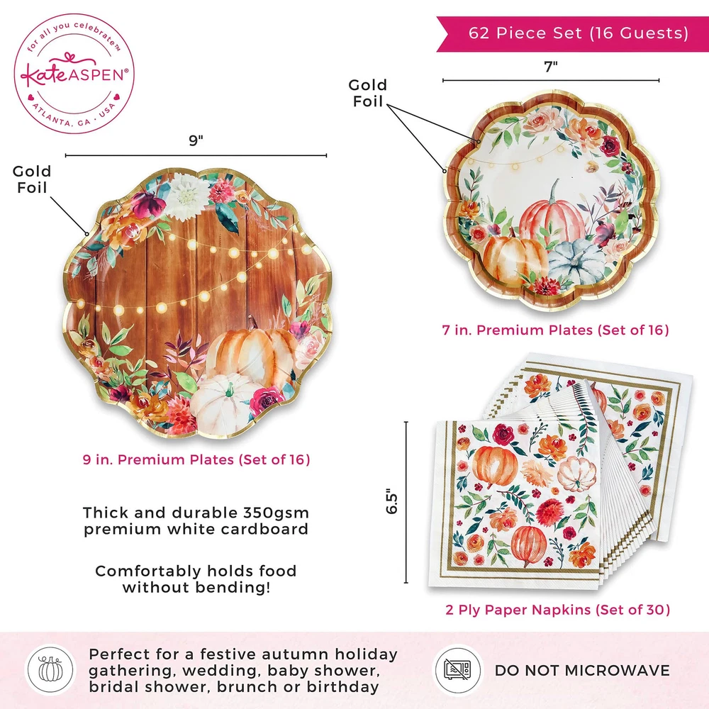 We love Fall: the falling leaves, the crisp air, and all the fun fall decorations. We designed our 62-piece Fall/Thanksgiving Tableware set for all your fall gatherings. Our favorite holiday of all is Thanksgiving; all our loved ones gather to give thanks for each other. We want everyone to enjoy those times, not stuck in the kitchen doing dishes. We include a set of 16 9" plates, a set of 16, 7" plates, and a set of 30 napkins. To add interest and beauty to your table we designed each plate and napkin to have a complimenting watercolor design with pumpkins, greenery, and the perfect amount of flowers with a touch of string lights that make a huge impact when placed together on the table or adds depth to a buffet style serving. The 9" plates are perfect for Thanksgiving dinner while we love the 7" plates for dessert or appetizers. There are enough napkins for all those double-fisted eaters at the Thanksgiving table. We design all of our disposable ware to be durable and ready to take the weight of all the best fixings. We ensure that those gold scalloped edges get to your home in perfect condition by plastic shrink wrapping and then placed in a cellophane bag to be ready to use as soon as you receive them. Whether you are hosting Thanksgiving or Friendsgiving or just having friends over for some football, this 62-piece fall tableware set will fit the bill perfectly. Beautiful & Functional -Fall/Thanksgiving Tableware Set (16 guests) pairs with many of the other complimenting items from 's Fall collection for a festive autumn holiday gathering. The plates feature brightly colored fall watercolor flowers, greenery, pumpkins, and string lights with a scalloped edge gold foil border. The Fall/Thanksgiving paper napkins feature a vibrant fall print with a gold border along the outside. Our Fall/Thanksgiving/Autumn Themed 62 Piece Party Tableware Set (16 Guests) is the perfect table setting for a sit down luncheon or spread out on your dessert table or buffet table. No matter how you use them your guests will be wowed by their high end quality and the beautiful design. You will love the fact that you don't have to wash 16 place settings. does a great job of designing high-quality paper plates to be more like a fine china place setting than just a means to be a disposable plate. designed the Fall/Thanksgiving collection to be adorable and fun, perfect for Thanksgiving dinner, pumpkin themed baby showers, even weddings and birthdays! No Hassle Cleanup - Simply recycle or dispose of after celebration, making cleanup effortless. STRONG - High quality heavyweight paper plates are strong and durable, holds up throughout dinner and dessert. High quality heavyweight paper plates and napkins are strong and durable, perfect for any celebration and holds up throughout dinner and dessert. Measurements - 9 inch Paper plate measures: 9" w x 9" d x 0. 6" h, 7 inch Paper plate measures: 7" w x 7" d x 0. 6" h, Paper napkins measure: 6. 5" w x 6. 5" d x 0. 01" h. Each part of this kit is shrink wrapped then placed in a cellophane bag. Food safe, do not microwave.