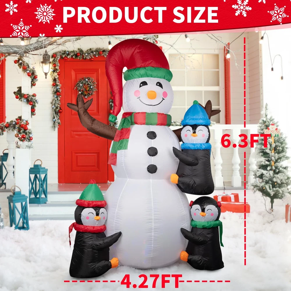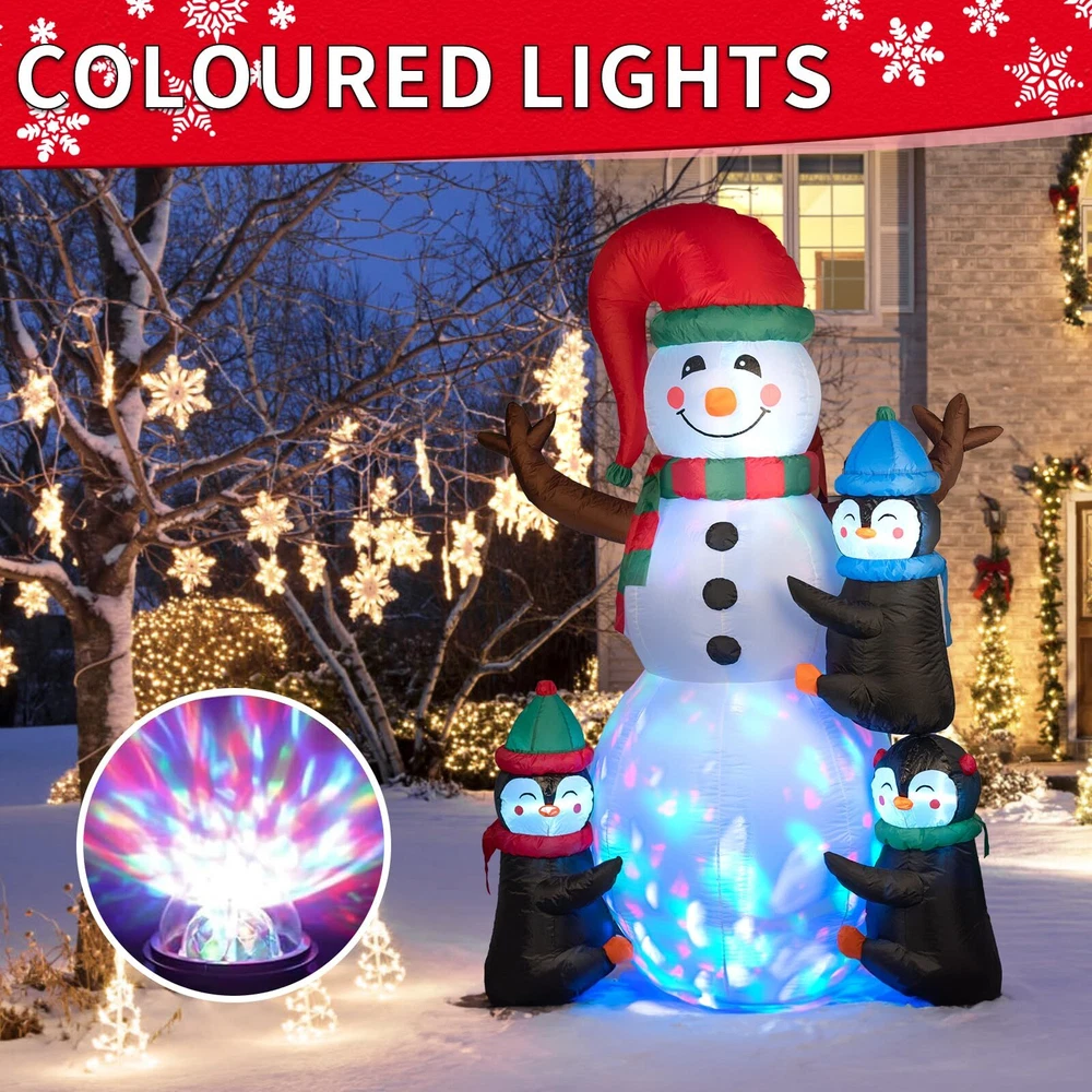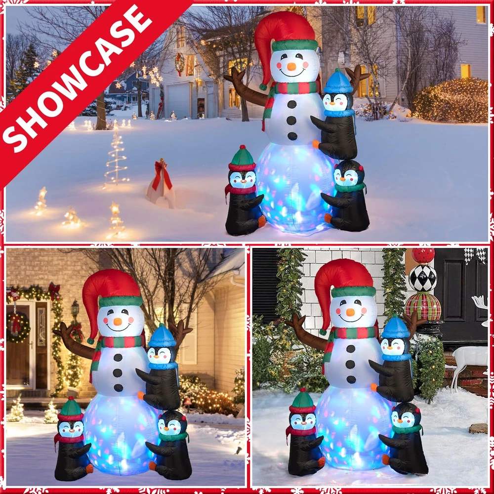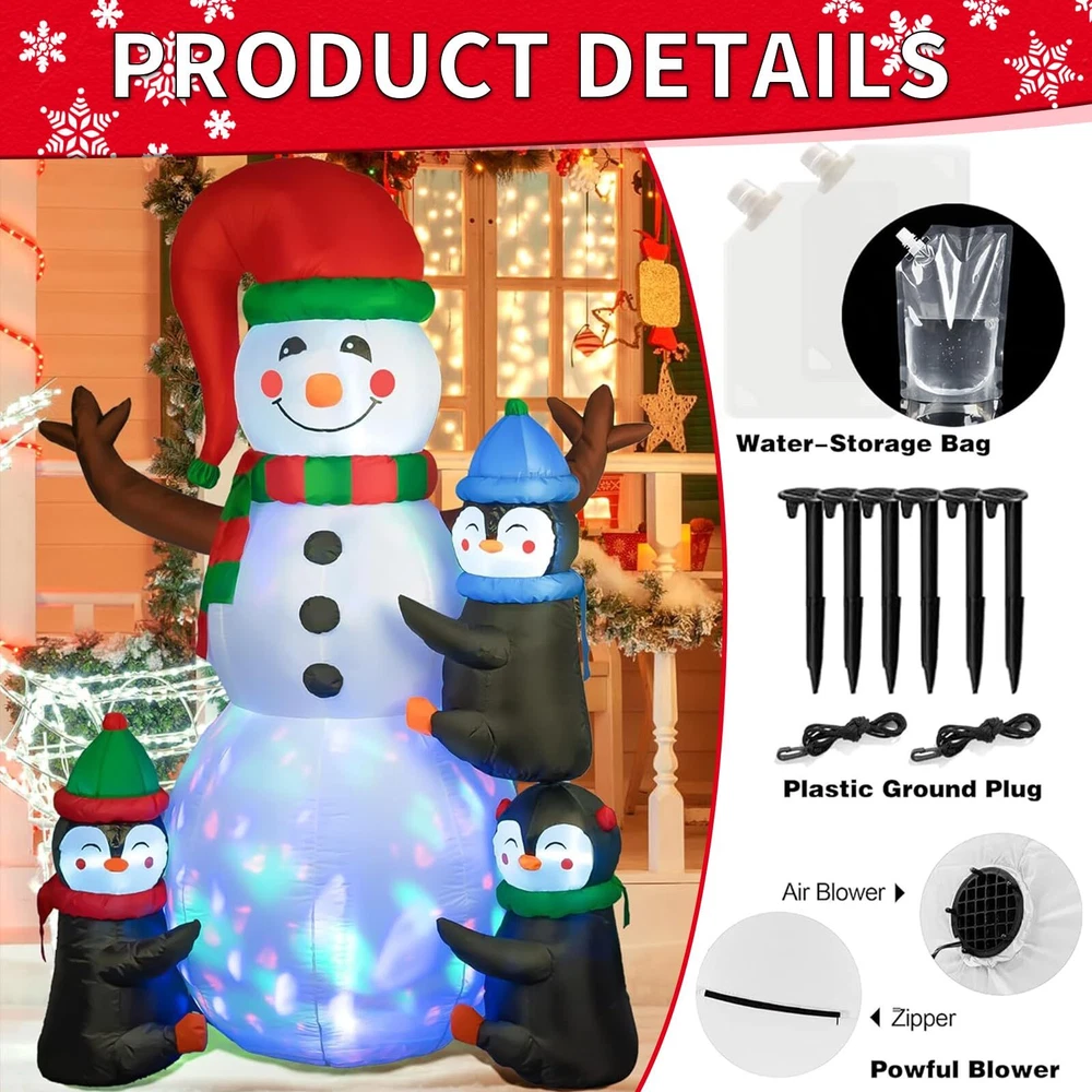 Festive Decor: Inflatable outdoor decoration featuring 3 penguins and a snowman, perfect for adding holiday cheer to your yard or garden. Illuminating Display: Equipped with LED colorful lights that create a vibrant and eye-catching display during the night. Easy Setup: Designed for hassle-free installation, simply inflate and stake into the ground for a quick and impressive holiday display. Durable Construction: Made from weather-resistant materials to withstand outdoor conditions during the Christmas season. Dimensions: Suitable size for most outdoor spaces, providing a delightful focal point for your holiday decorations.