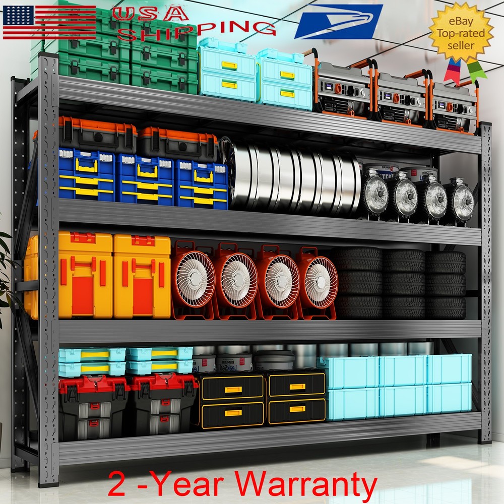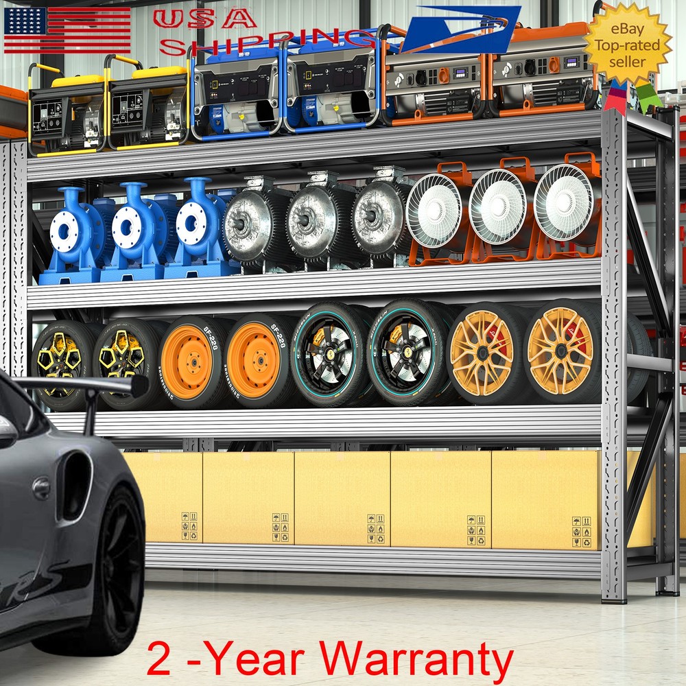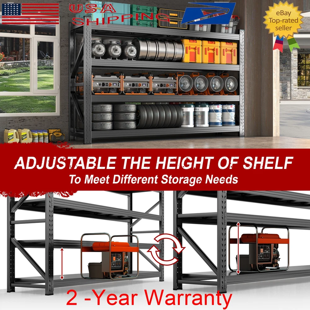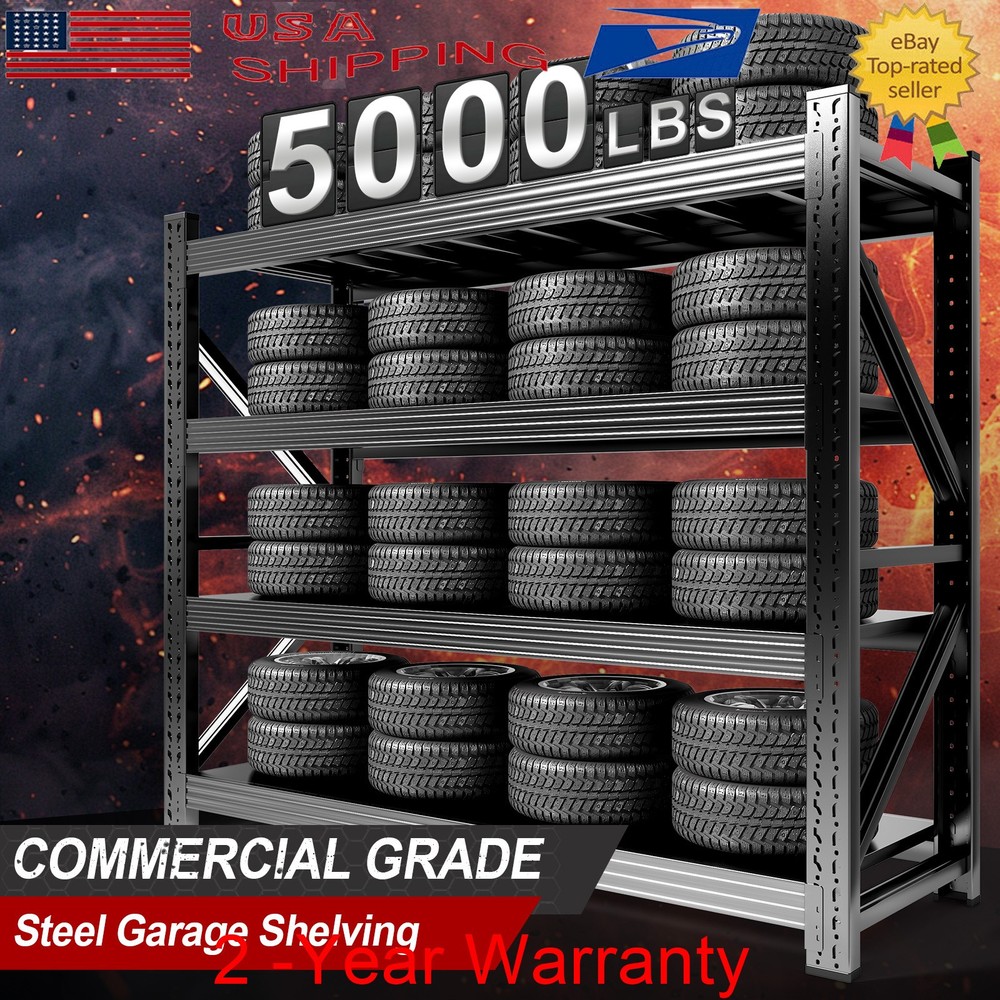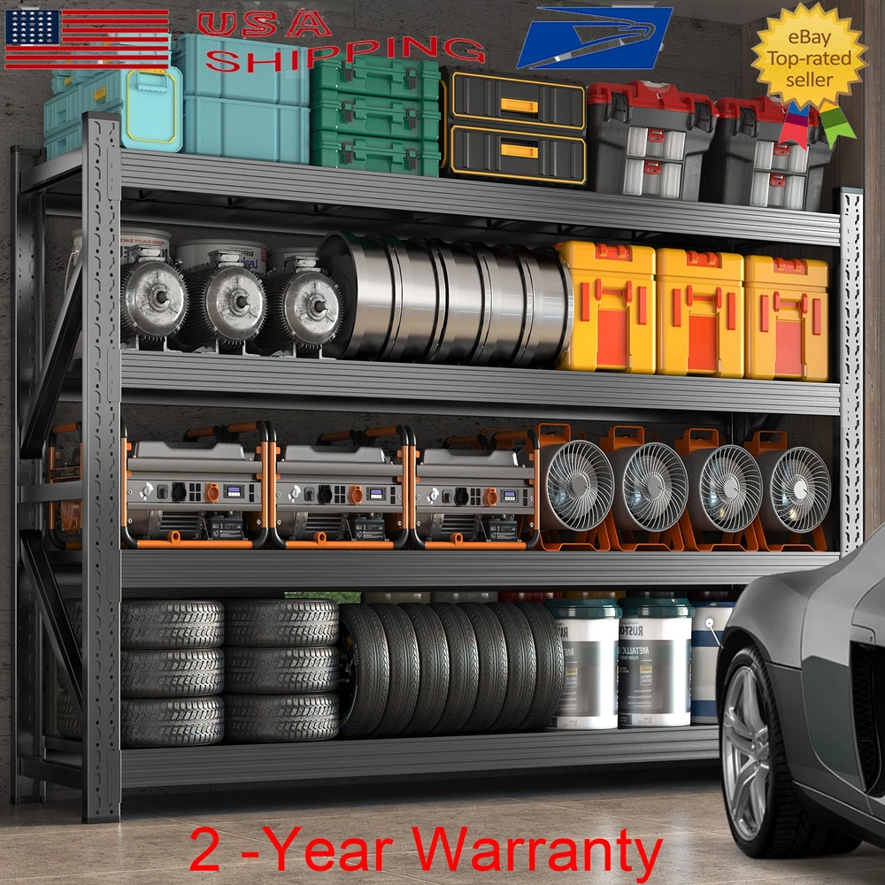 63" Garage Shelving Heavy Duty 4 Tier Storage Shelves Metal Organizer Rack USA Product Description Say goodbye to wobbling shelves and weak joints. Our Garage Shelving features four one-piece steel columns, thick steel shelves reinforced with ribs, and extra-wide beams for superior durability and strength. It’s perfect for storing tires, generators, tools, and more. Adjustable shelf heights let you create the setup you need, while the quick, 10-minute installation makes organization effortless. About this item 【Heavy Duty Garage Shelving Load 6000LBS 】Designed to handle even the toughest storage challenges. With a total weight capacity of 6000 lbs and 1500 lbs per shelf, this shelving unit is built to withstand heavy-duty use. Featuring one-piece columns, dual Reinforcing Diagonal Supports, reinforced Steel shelves with three support ribs, and extra-wide beams, it offers unparalleled strength and durability. 【One-Piece Columns with Diagonal Supports 】No seams, no weak spots. Our four one-piece columns, reinforced with diagonal supports, are the key to a sturdier, more reliable garage shelves. The seamless design, combined with the diagonal braces, eliminates wobbling and sagging, offering enhanced stability and durability for heavy-duty storage., unlike split column garage shelf that can suffer from weak joints and instability. 【Thick Steel Shelving with Reinforcement Rib】Our shelf’s thick steel shelves, reinforced with ribs and supported by extra-wide beams, provide unmatched durability for all your storage needs. The reinforced ribs help spread the weight evenly across each shelf, while the extra-wide beams ensure maximum load-bearing capacity, preventing any bending or sagging over time. 【Adjustable Metal Shelf】Our heavy duty shelving features adjustable shelves, allowing you to create the perfect storage system for your unique needs. Adjust the height of each shelf to fit everything from large appliances to smaller tools, and enjoy a customizable storage experience. Whether it’s for home or commercial use, this shelving unit is versatile and practical. 【Garage Shevleing with Monster Storage Space】This extra-wide garage shelving is perfect for garages, warehouses, basements, and shops. It’s not just for home use – this shelving unit is also ideal for industrial and commercial applications. Perfect for storing heavy-duty items like tires, generators, and motor oil crates, it's built for mechanics, warehouse professionals, and anyone who needs reliable, heavy-duty storage. 【10-Minute Solo Assembly】We’ve simplified assembly with a comprehensive installation guide and clearly labeled parts for each step. And if you run into any issues, our professional customer service is always ready to offer guidance and support, ensuring a flawless experience. Product Sizes 1PCS --- 4 Tier - 63" W x 24" D x 63" H