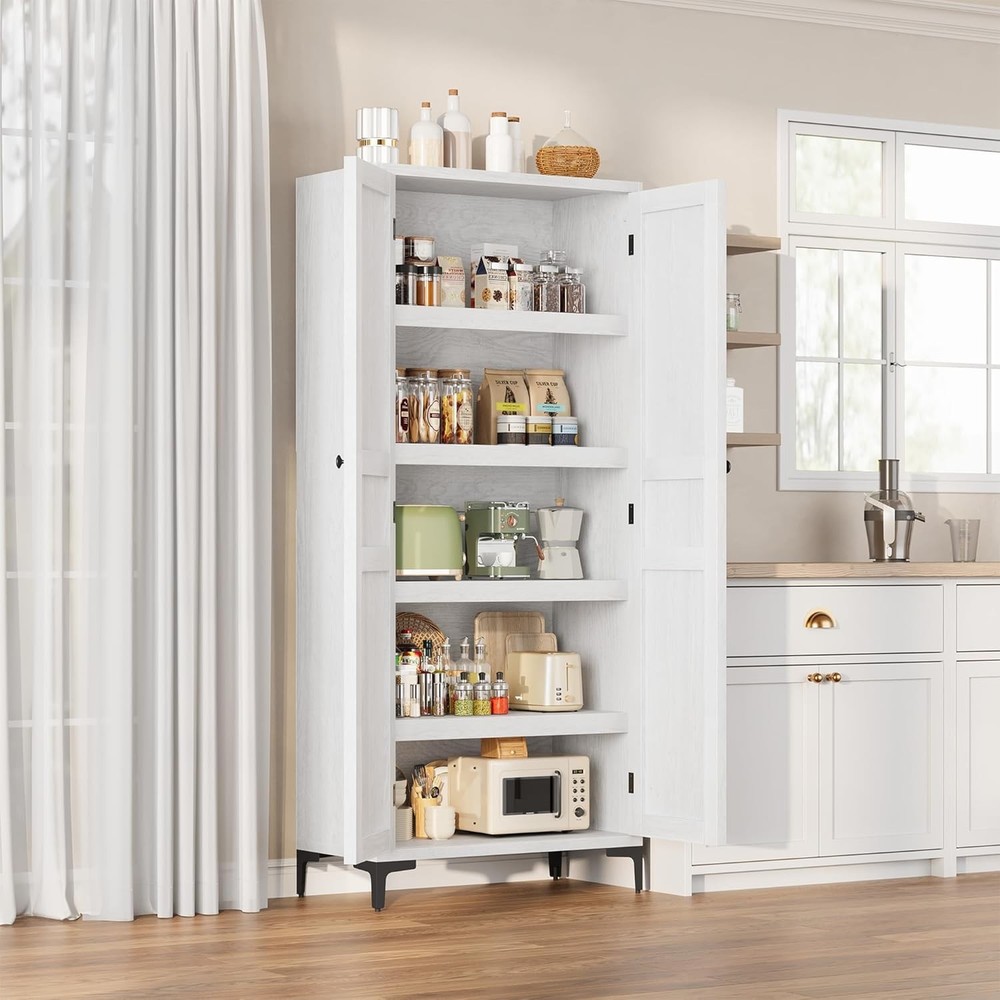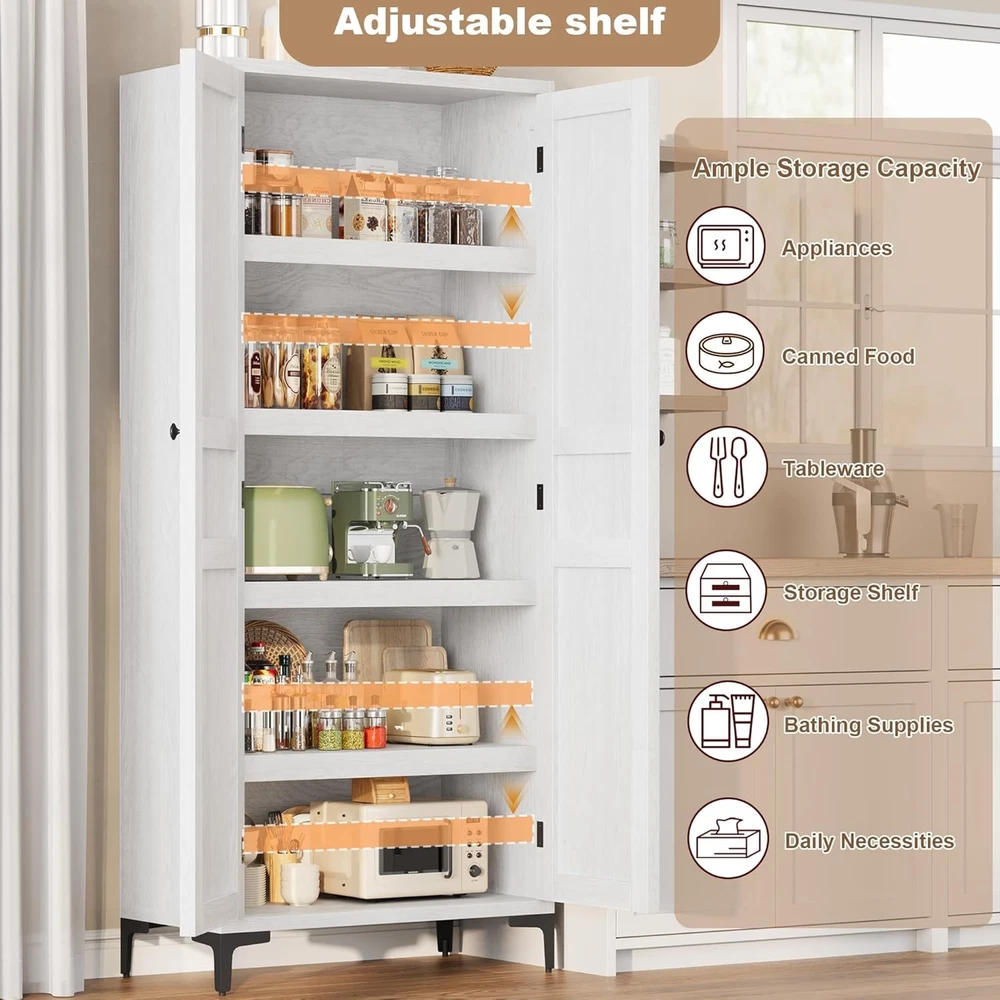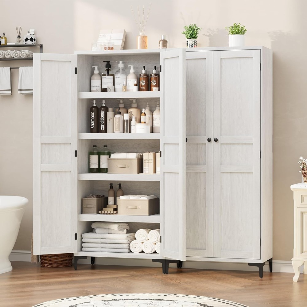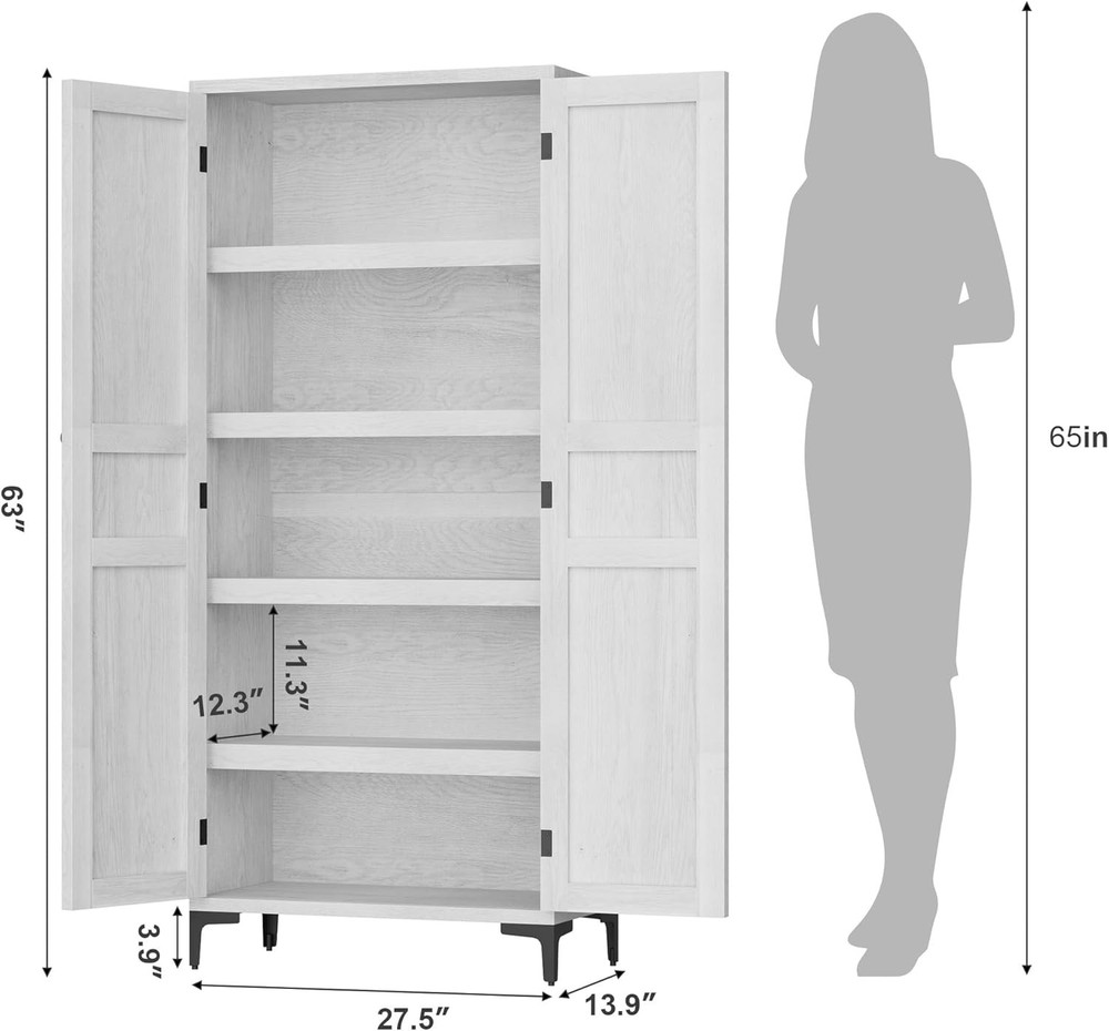 63 Inch Tall Storage Cabinet, Kitchen Pantry Cabinet 5 Tier Bathroom Cabinet with 4 Doors Adjustable Shelves for Kitchen, Dining Room, Bathroom (Antique White, 2 Door with MDF) Product Description About this item Vertical Elegance: Standing at 63 inches tall and measuring 27.56 x 13.78 inches, this tall storage cabinet features five tiers and four doors, providing ample space for organizing items. Its narrow design makes it ideal for tight spaces in your home Tailored Storage: This narrow wooden cabinet features one adjustable shelf for customized storage solutions. Modify shelf heights to accommodate items from pantry goods to bathroom essentials, ensuring everything has its place Built to Endure: Made from thick engineered wood and sturdy metal hardware, this bathroom cabinet offers stability and longevity. The magnetic closure secures the doors, and the elevated bottom guards against damage for added durability Multi-Purpose Use: This farmhouse storage organizer serves as a bathroom cabinet, pantry storage, accent cabinet, or garage and office cabinet. Its versatile design enhances organization throughout your home, making it a practical addition to any room Effortless Assembly: With clear instructions and labeled parts, assembly is simple. For best results, having two people assist is recommended, ensuring a smooth and efficient experience while you enjoy your new pantry cabinet Kitchen Pantry with Doors Not just for the kitchen, this storage cabinet is suitable for Bathroom, Dining and Study spaces, and more, catering to a variety of storage needs. With its dual-door design, this cabinet provides ample storage for towels, toiletries, and bathroom essentials, keeping your bathroom organized and clutter-free. Previous page Next page Previous page MDF Board Showcasing exquisite textures, combines elegance with durable storage, enhancing your space's style. Metal Leg The cabinet features sturdy metal legs, ensuring stability and adding a modern touch to your decor. Next page Sturdy and Modern Design Features robust metal legs that ensure exceptional stability and durability, adding a contemporary touch to decor while providing practical support. Anti-Tip Design Equipped with an anti-tip design, this cabinet stability during use, offering additional safety, especially for homes with children or pet. Classic Charm Handles add a unique character and charm to the cabinet, seamlessly blending modern aesthetics with traditional elegance to enhance your space. Convenient Setup Designed with easy-install hinges, simplifies the assembly process, allowing users to set it up quickly Storage Cabinet