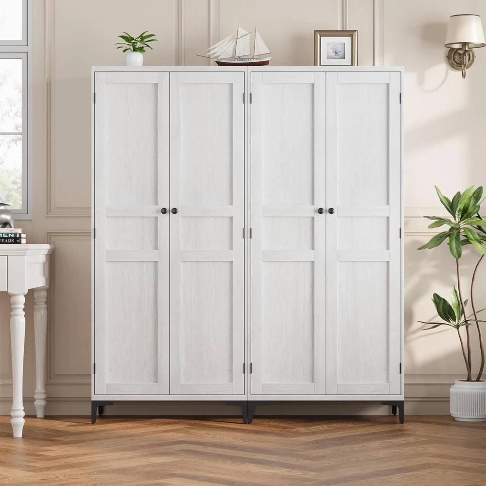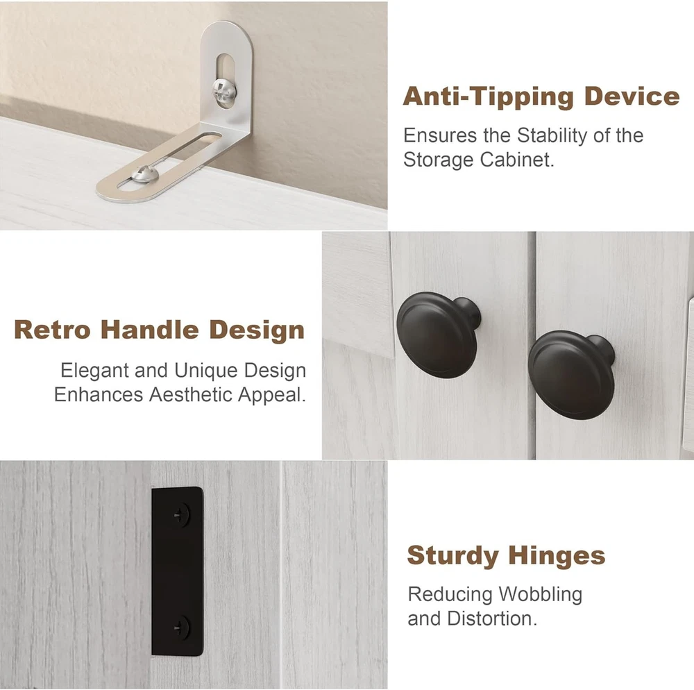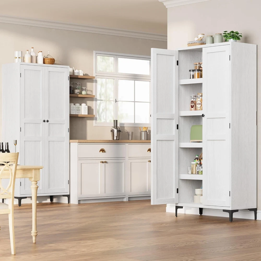 63 Inch Tall Storage Cabinet, Kitchen Pantry Cabinet 5 Tier Bathroom Cabinet with 4 Doors Adjustable Shelves for Kitchen, Dining Room, Bathroom (Antique White, 2 Door with MDF) Product Description About this item Vertical Elegance: Standing at 63 inches tall and measuring 27.56 x 13.78 inches, this tall storage cabinet features five tiers and four doors, providing ample space for organizing items. Its narrow design makes it ideal for tight spaces in your home Tailored Storage: This narrow wooden cabinet features one adjustable shelf for customized storage solutions. Modify shelf heights to accommodate items from pantry goods to bathroom essentials, ensuring everything has its place Built to Endure: Made from thick engineered wood and sturdy metal hardware, this bathroom cabinet offers stability and longevity. The magnetic closure secures the doors, and the elevated bottom guards against damage for added durability Multi-Purpose Use: This farmhouse storage organizer serves as a bathroom cabinet, pantry storage, accent cabinet, or garage and office cabinet. Its versatile design enhances organization throughout your home, making it a practical addition to any room Effortless Assembly: With clear instructions and labeled parts, assembly is simple. For best results, having two people assist is recommended, ensuring a smooth and efficient experience while you enjoy your new pantry cabinet Kitchen Pantry with Doors Not just for the kitchen, this storage cabinet is suitable for Bathroom, Dining and Study spaces, and more, catering to a variety of storage needs. With its dual-door design, this cabinet provides ample storage for towels, toiletries, and bathroom essentials, keeping your bathroom organized and clutter-free. Previous page Next page Previous page MDF Board Showcasing exquisite textures, combines elegance with durable storage, enhancing your space's style. Metal Leg The cabinet features sturdy metal legs, ensuring stability and adding a modern touch to your decor. Next page Sturdy and Modern Design Features robust metal legs that ensure exceptional stability and durability, adding a contemporary touch to decor while providing practical support. Anti-Tip Design Equipped with an anti-tip design, this cabinet stability during use, offering additional safety, especially for homes with children or pet. Classic Charm Handles add a unique character and charm to the cabinet, seamlessly blending modern aesthetics with traditional elegance to enhance your space. Convenient Setup Designed with easy-install hinges, simplifies the assembly process, allowing users to set it up quickly Storage Cabinet