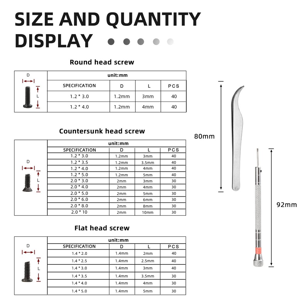 630 Pcs Tiny Micro Repair Screw Kit Eyeglass Sunglass Small, Black Description Features: Package: 630 Pcs 18 sizes of micro screws, and 1 micro screwdriver and 1 tweezers. Wide Used: wide used for repairing eyeglasses, sunglasses, computers, cellphones, small electronics, clocks, watches and any other device with small screws. Size Chart: organized plastic case means you can always find the size you are looking for and with the included size chart on the lid you can find what you need quickly. High-quality Materials: made of premium composite stainless steel, they have good rust resistance and the excellent performance of oxidation resistance, which can ensure a long using time, no other screws needed. Note: please open the lid from the attached size table facing upward, open the cover carefully to avoid screws falling or mixing up. If you purchase the desired size, please refer to the product description. Product Details: Handling We will ship all orders within 3 business day of payment. Delivery We Do Not Ship Outside of the Continental US. Return Policy All items qualify for returns within 30 days of receipt. Buyer is responsible for return shipping on any item that is not damaged. Feedback We take our reputation seriously, we buy and sell online, so we understand the value of trust. If you are unsatisfied with your order, please contact us and we will work with you to resolve it to your satisfaction.