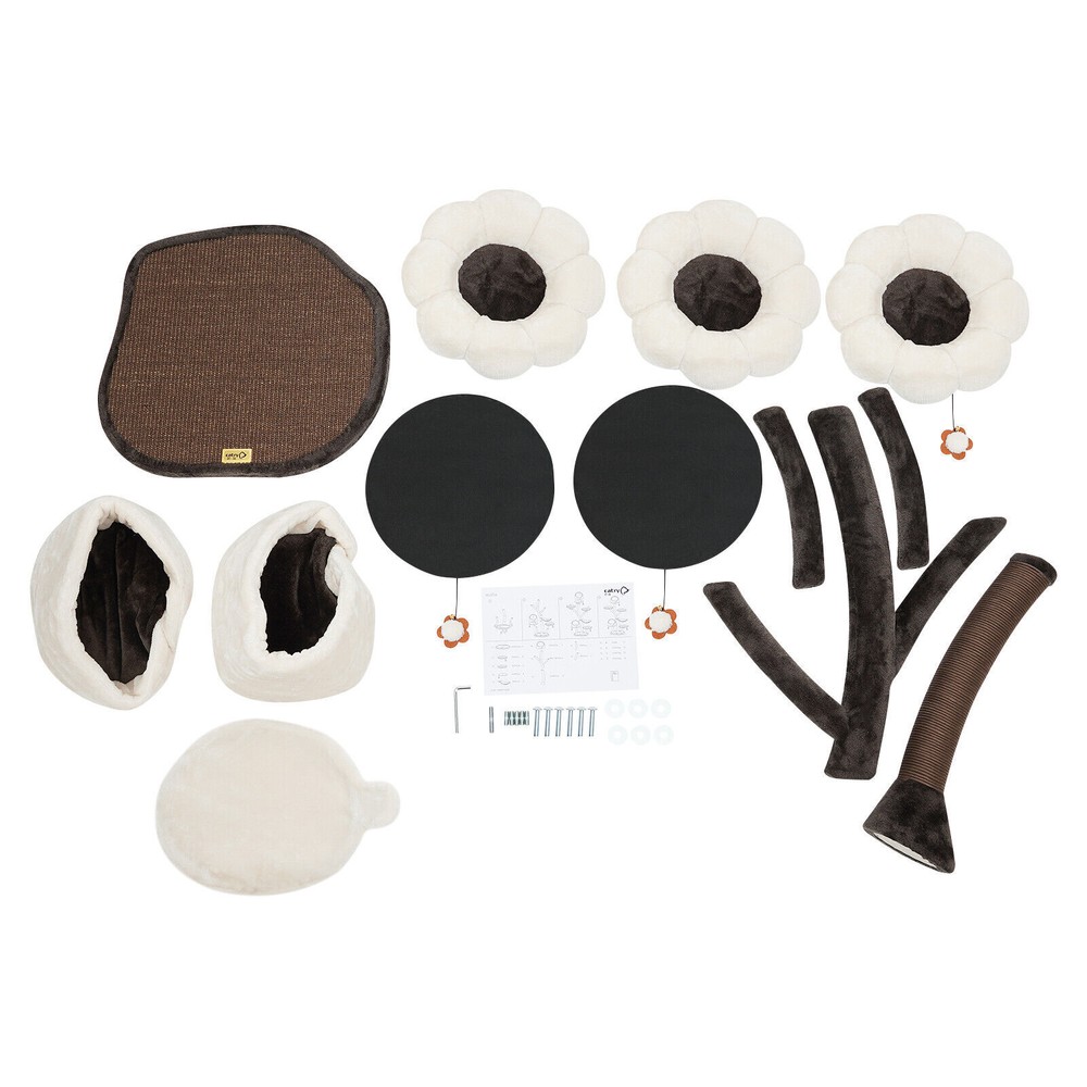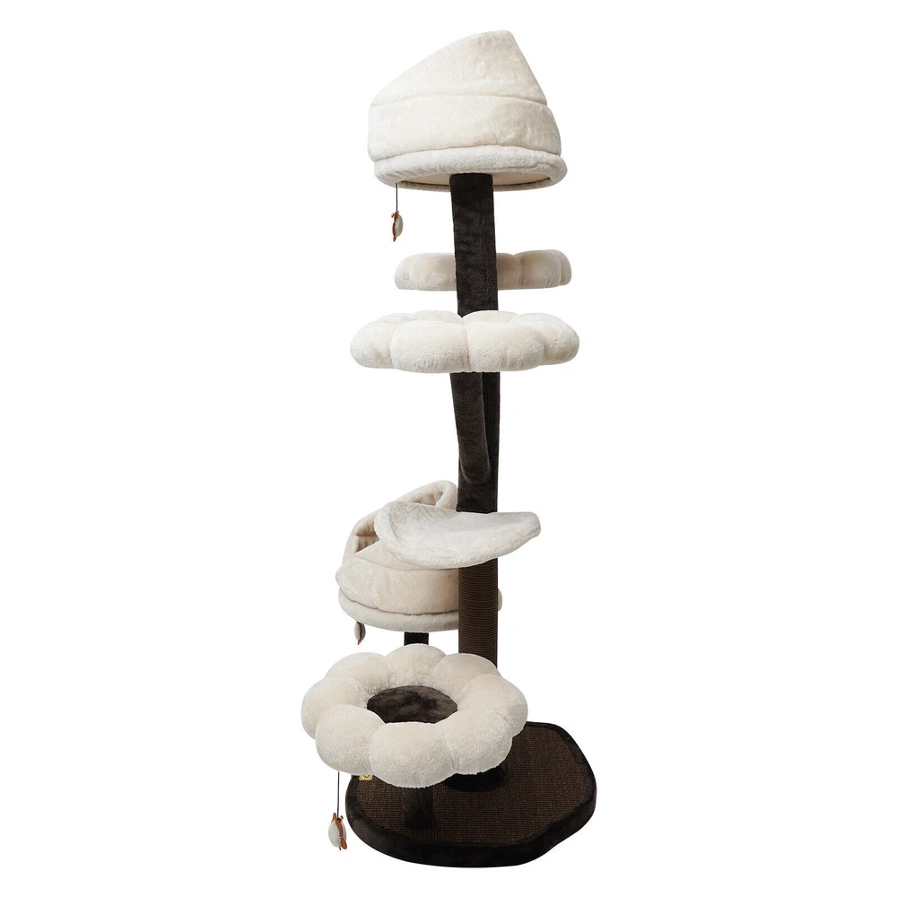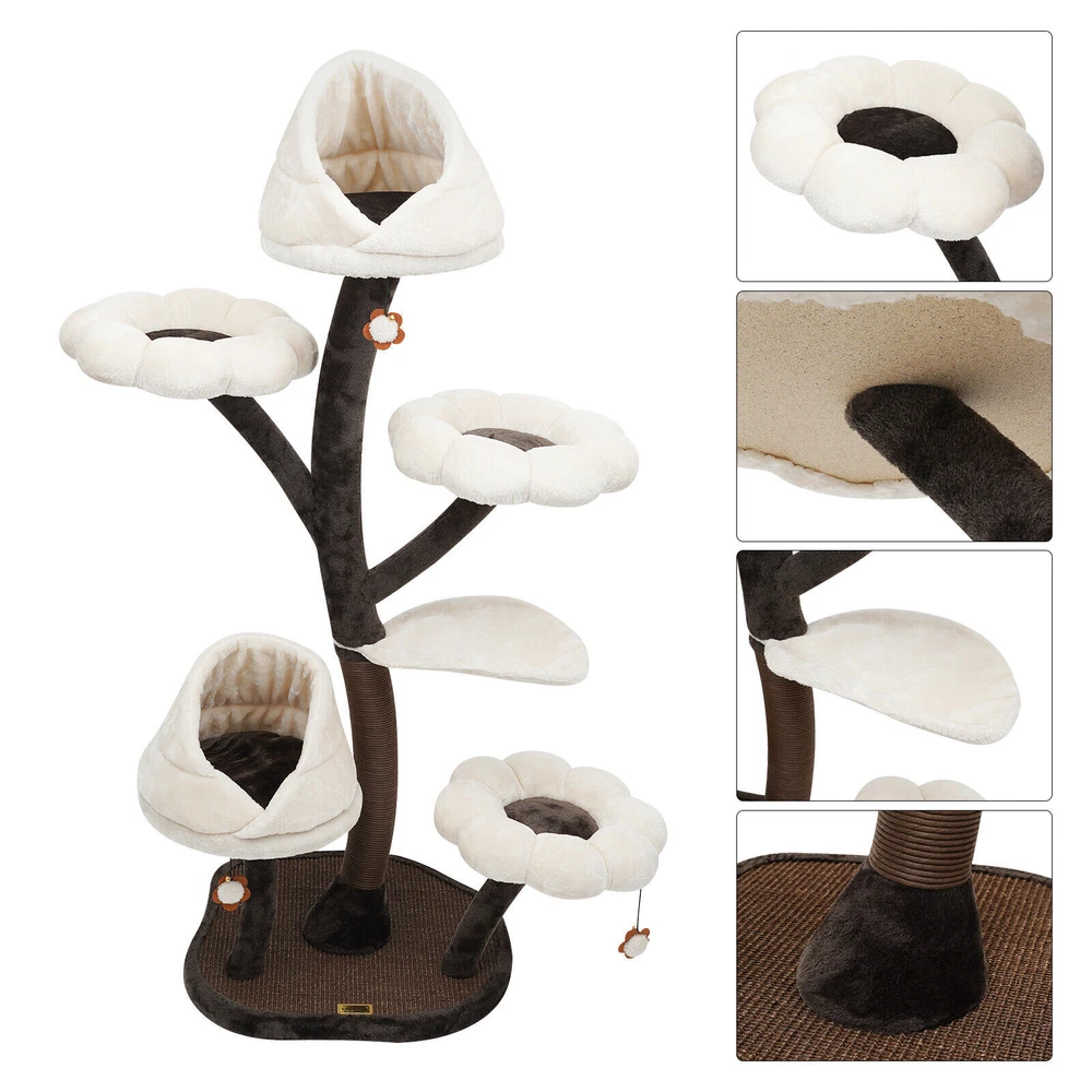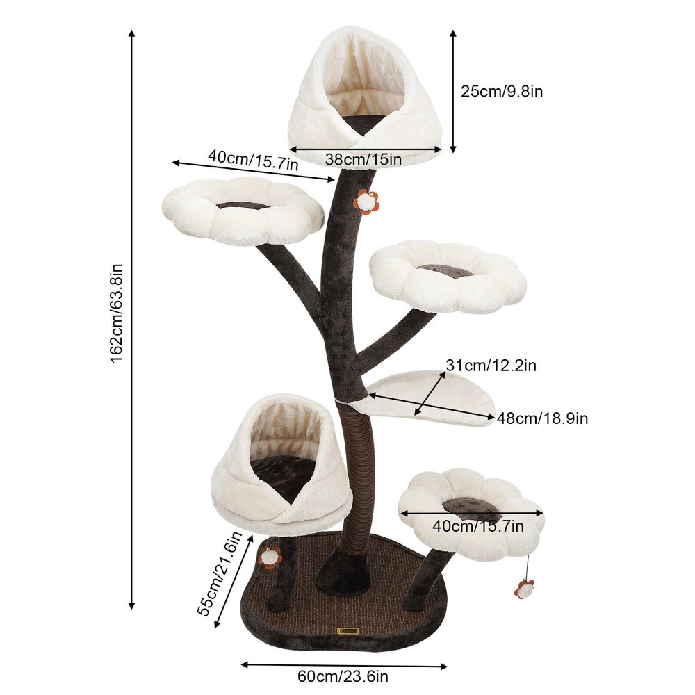 Specification Material: Particleboard, Paper String, Sisal, Iron, and Plush Fabrics Color: Brown and White Resting Platform Shape: Flower Style: Modern Target Species: Cat Wash Style: Hand Wash Assembly Required: Yes Mounting Type: Freestanding Specific Uses For Product: Indoor Number of Tiers: 6 Load Capacity: About 10kg/22 lbs Base Size: 60*55cm/23.6*21.6inch Total Height: 162cm/63.8inch Each Cat Nest Size(D*H): 38*25 cm/15*9.8inch Each Cat Resting Platform Diameter: 40 cm/15.7inch Leaf-type Hammock Size: 48*31cm/18.9*15inch Package Included 1* Cat Tree 1* Allen Key 1* Assembly Diagram Other Accessories for Use welcome Description Are you still worried that your cat has nowhere to sharpen its claws thus scratching the sofa, or are you still worried about your cat not having a suitable place to live? Then come to see our cat tree. The wide springboard, comfortable cat nest, durable scratching board, sturdy columns, and scratching post give your cat an ideal place to play and rest. The beautiful shape and coordinated color scheme can fit well into your furniture decor. Key Features Build to Last: It is made of high-quality particleboard, paper string, sisal, iron, and plush fabrics, making it robust, wear-resistant, impact-resistant , environmentally friendly, and safe, and has a long service life. Family Playground: This cat tree has resting platforms(also can be used as springboards), scratching posts, cat nests, and more, making it a family playground for cats to play, scratch, rest, and climb. You can take photos to document your cat's life and add to the fun. Thoughtful Design: Its structure is designed according to the climbing habits of cats, so both old cats and kittens can climb up and down easily. Kittens can lean on the padded upper platform to rest or observe the environment or sleep comfortably in the narrow upper and wide lower litter. Good Load-bearing: The sturdy material, thick columns, and stable base endow the product with a bearing capacity of approximately 22 lbs, so you don't have to worry about collapsing when your cat is playing or resting on it. Nice Decoration: White with brown appearance makes the product look very simple and atmospheric, flowers and leaves type resting platforms make it rich in a kind of natural beauty, so it will be a beautiful scenery in your home! Space Saving: The upright structure makes full use of vertical space, saving you more space in the bedroom or living room. Easy to Install: With complete accessories, a simple structure, and an intuitive assembly diagram, you can install it yourself and enjoy the installation process. Effortless Cleaning: Because of its simple detachable structure and smooth surface, you can easily wash this product clean. Ideal Gift: Thanks to its powerful functions and beautiful novel appearance, you can give it as a Christmas, Thanksgiving, or housewarming gift to your friends who love cats! Details Leaf-shape Hammock: It not only is stylish in shape but also provides maximum comfort for cats, allowing them to experience the fun of hanging. Flower-shape Plush Balls: They can easily attract your cats' interest, unleash their nature, make them jump like wild animals, and make them play happier. Practical Column: Wrapped with paper string, it helps your cats climb or sharpen their claws, prevent them from destroying the sofa or bed in your home, and protect their nails. Application It applies to cats weighing up to 22 pounds and is suitable for homes, pet shops, living rooms, bedrooms, balconies, and other places where cats can interact and rest. Specification Material: Particleboard, Paper String, Sisal, Iron, and Plush Fabrics Color: Brown and White Resting Platform Shape: Flower Style: Modern Target Species: Cat Wash Style: Hand Wash Assembly Required: Yes Mounting Type: Freestanding Specific Uses For Product: Indoor Number of Tiers: 6 Load Capacity: About 10kg/22 lbs Base Size: 60*55cm/23.6*21.6inch Total Height: 162cm/63.8inch Each Cat Nest Size(D*H): 38*25 cm/15*9.8inch Each Cat Resting Platform Diameter: 40 cm/15.7inch Leaf-type Hammock Size: 48*31cm/18.9*15inch Package Included 1* Cat Tree 1* Allen Key 1* Assembly Diagram Other Accessories for Use Notes If your pet chews the pompom, please remove it and keep it away from your pet for a while. It is recommended to place the cat tree against the wall and use the anti-tip kit(not included) to ensure the safety of your family members. Additionally, try not to place the cat tree in a humid environment, considering the material. Please check the tightness of the screws and tighten them regularly. Please allow the slight color difference caused by the shooting light and 1-3 cm error due to manual measurement, and make sure you do not mind before ordering. Payment Delivery details Terms of sales About us Contact us Payment We accept ebay payment 。 Fees such as import duties, taxes are not included in the item price or shipping costs. These charges are the buyer's responsibility. Delivery details Shipping: 2-9 working days to: USA Terms of sales We maintain high standards of excellence and strive for hundred percent customer satisfaction. Feedback is very important to us. We hope that you contact us immediately before you give neutral or negative feedback, so that we can address your concerns. It is impossible to address issues if we do not know about them! About us Your satis faction is our ultimate goal. We work hard to earn your trust and future business. Our certified technicians have tested each item before shipping. The unit comes with 1 year limited warranty on all manufacturing defects. a) If you receive a defective item, you may return it or ask for a discount. Please contact us within 14 days after you receive the package. b) What you returned must be intact and in its original packaging as re? u. Customer is responsible for shipping costs of the returned item. c) We will cover the cost of shipping back t with the shipping rate indicated in the registra