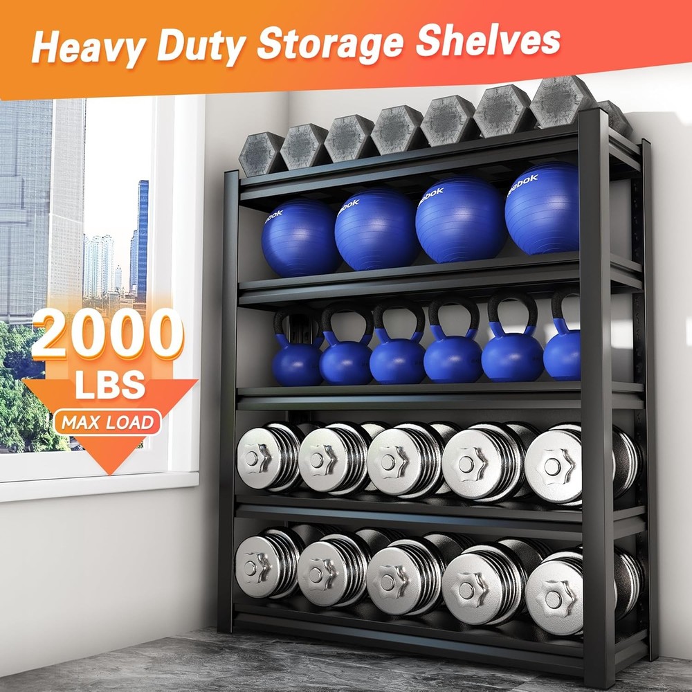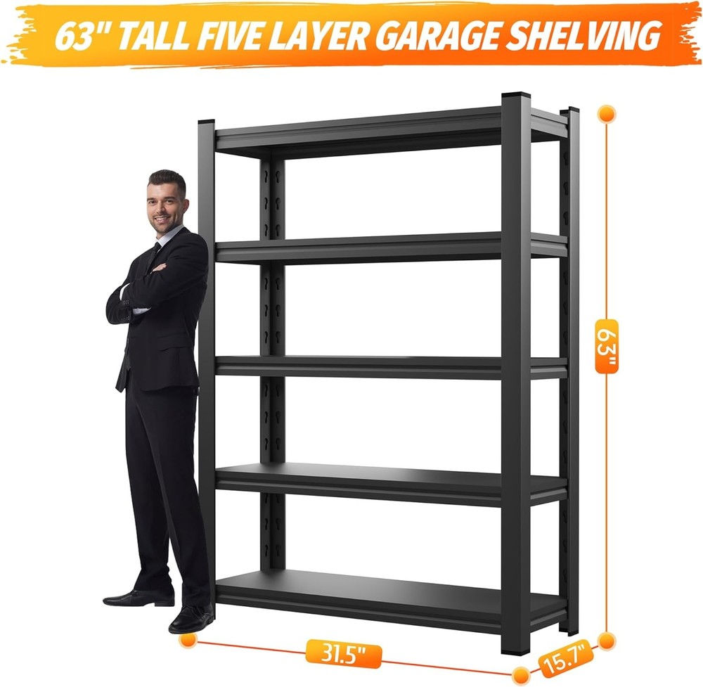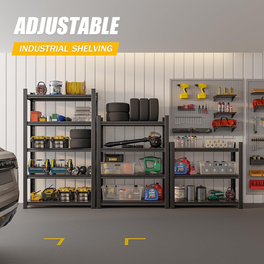 Product Description About this item Multipurpose Adjustable Garage Metal Shelving: The industrial shelving features adjustable shelves, allowing you to customize the height of each shelf to accommodate items of various sizes. It can also be assembled into 2 small storage shelving units and placed side by side as a long table with storage underneath, or as a workbench. You can build a Free Combination sturdy shelves any way you want it 2000 lbs Capacity Heavy Duty Shelving: Designed for heavy-duty use, each solid, thickened metal shelving unit features large ribs beneath and double-thickened legs. This basement storage shelves can hold substantial weight. Each shelf can support up to 400 lbs, with a total bearing capacity of 2000 lbs. It ensures durability and stability, making it perfect for storing a variety of items in your garage or workspace Premium Quality Material and Craftsmanship: The specially treated rust-resistant coating ensures that the rack remains shiny and new even in humid environments. The entire all-metal shelving uses anti-rust painting technology, making it easy to clean, moisture-proof, and rust-proof. The expert craftsmanship guarantees that this garage shelving unit is built to last, making it a reliable addition to any storage space Safe Design: Our pantry shelves unit comes with free wall-mounting brackets, allowing you to secure it to the wall for added safety and stability. The thoughtful design of the standing shelf prevents tilting and falling, while eight foot pads protect your floors and minimize noise during movement. This steel shelving solution is perfect for keeping your garage or workspace organized and secure 10 Minutes Easy Assembly: The shelving rack adopts a special interlocking design for ease of assembly. To help you quickly assemble the garage storage shelves, we provide a rubber mallet, a pair of gloves, and clear instructions, making it easy to understand and assemble each shelving unit within 10 minutes Anti-scratch foot mats When moving the shelves, the feet can avoid scratching the floor and generating large noise Adjustable dividers You can freely adjust the height of the shelves according to your needs, and can be disassembled into multiple shelves Double-Thickness Design Double-layer column design enhances the loading capacity of the shelves and strengthens the stability of the shelves Load-Bearing Reinforcemen The load-bearing capacity of the laminate with reinforcing bars is greatly improved