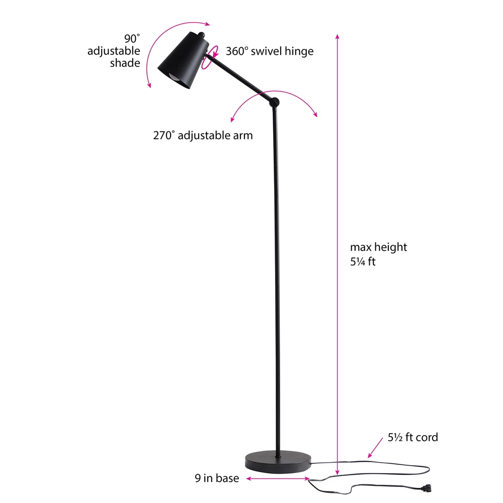 Instantly brighten up any room in your home with the 64 Inch Architect Floor Lamp. This standing floor lamp has a matte black metal finish and a classic, low-profile shape that can seamlessly blend into any style of décor. A timeless lighting accent for your living room, bedroom, kids’ room, office, dorm room, reading nook, and more, the floor lamp is 64 inches tall with a sturdy base. The flexible lamp head easily adjusts so you can direct the light where you need it the most. Pair the 64 Inch Architect Floor Lamp with your favorite light bulb (not included). 64-inch standing floor lamp with adjustable head Classic, low-profile shape with black matte metal finish Flexible lamp head adjusts to control the direction of light Ideal lighting accent for living rooms, bedrooms, offices, dorm rooms, and more Light bulb not included