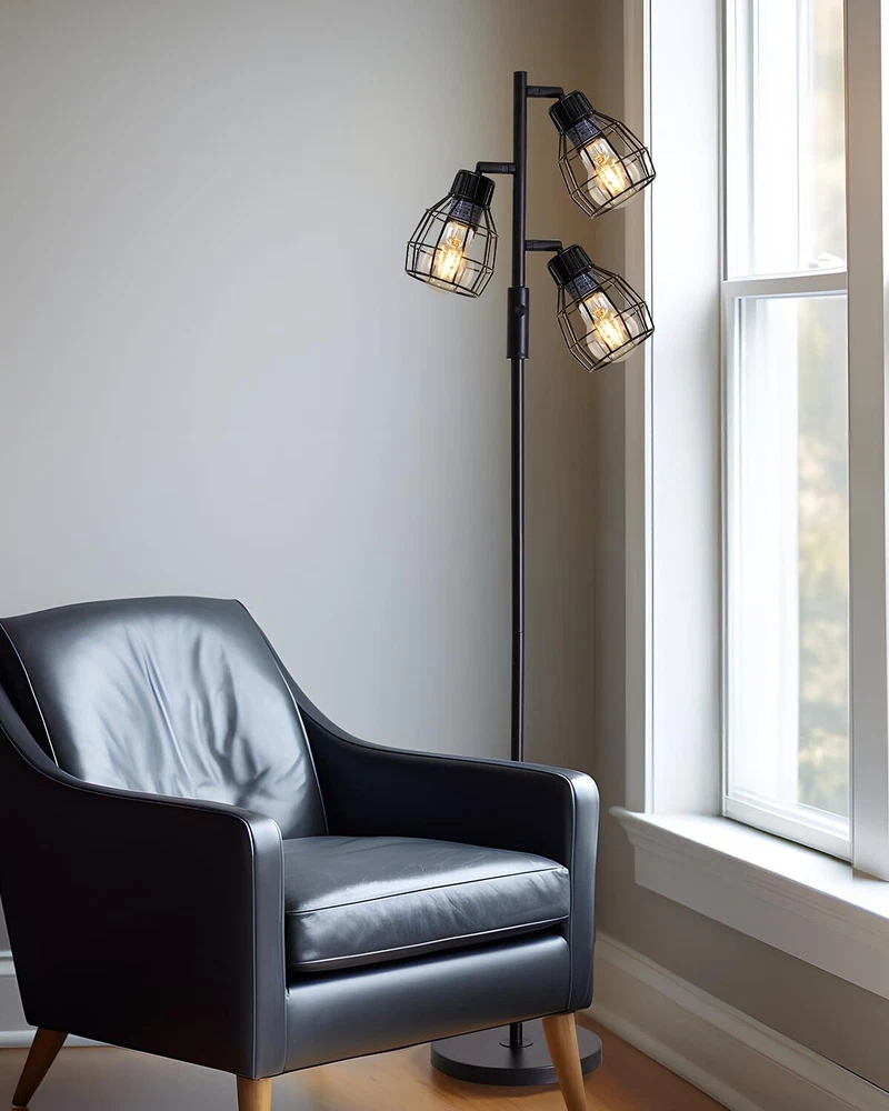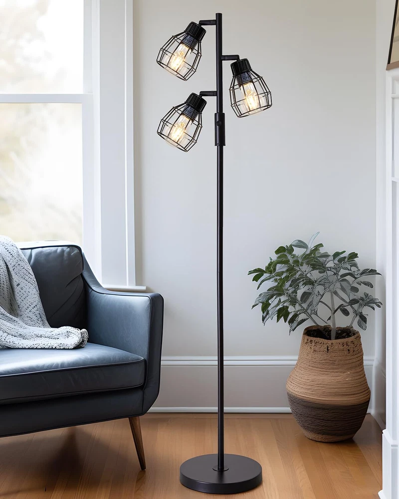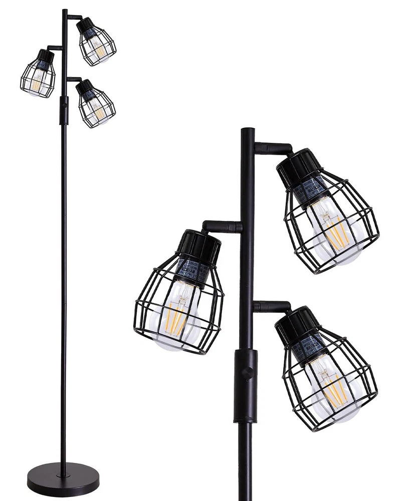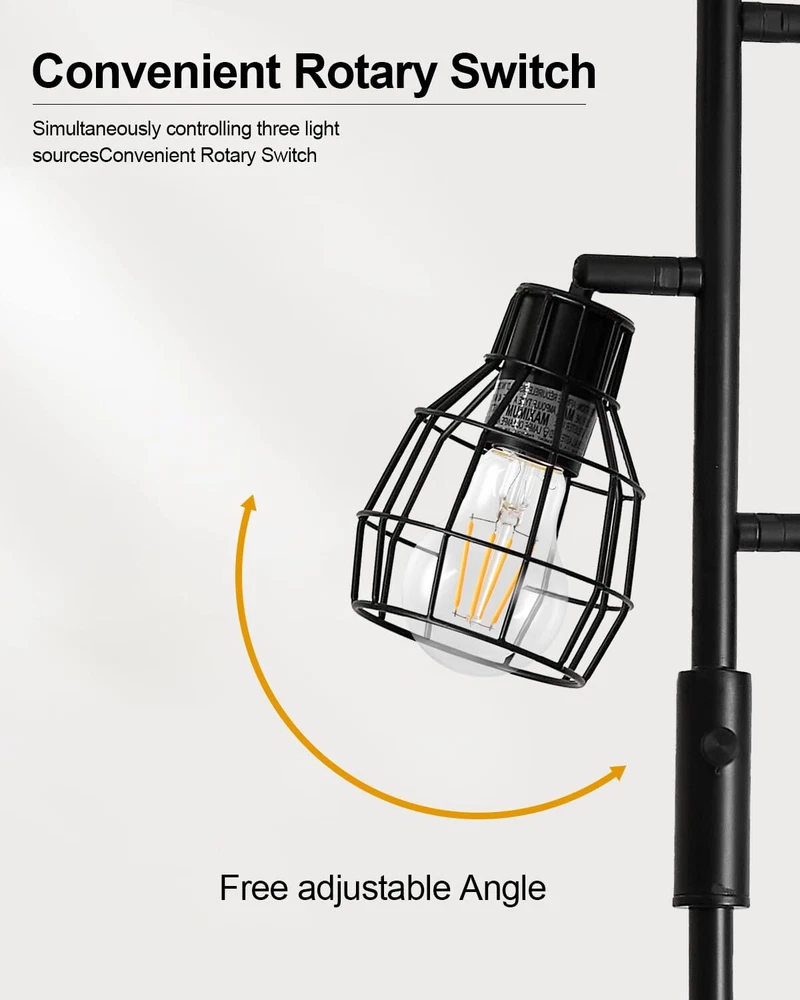 Tree Standing Lamp: The Reading light With design of the elegant, simple black metallic construction make the modern floor lamp well matched to styles of industrial, vintage and farmhouse furnitute. The special birdcage lampshade makes it ideal for multiple styles of decoration, such as minimalist, industrial and mid-century. The multi-head design cage shade lampshade brings soft warm light you need and adds decorative effect to your room Tall Lamp with 4W LED Bulb: Our Standing lamp are designed with 3 E26 lamp holders. Compatible with a variety of normal E26 LED, CFL, incandescent and halogen bulbs etc This set comes with an E26 base bulb, 4W(60W equivalent), No flicker or buzzing.This living room lamps standing is ideal and perfect gift for new house. Metal Floor Lamp: The black floor lamp is well made with premium metal, quite durable and sturdy for long-term use. The farmhouse floor lamp is specially built with a heavy, stable base and lamp pole to ensure it keep standing steadily even on the carpet. Strong holding pole, No Bending No Leaning. Sturdy Pole Heavy Base Stable & Firm. Easy to Use: The heavy floor lamp base offers high stability and prevents the pole light from wobbling or being tipped over by children or pets.There is a knob switch on the lamp body to switch on/off the light with a simple step. Super convenient to operate for all, even for elders and kids. always focuses on the needs of our customers, that's why we're constantly upgrading our products. We want to ensure that every one of our customers has a pleasant shopping experience.