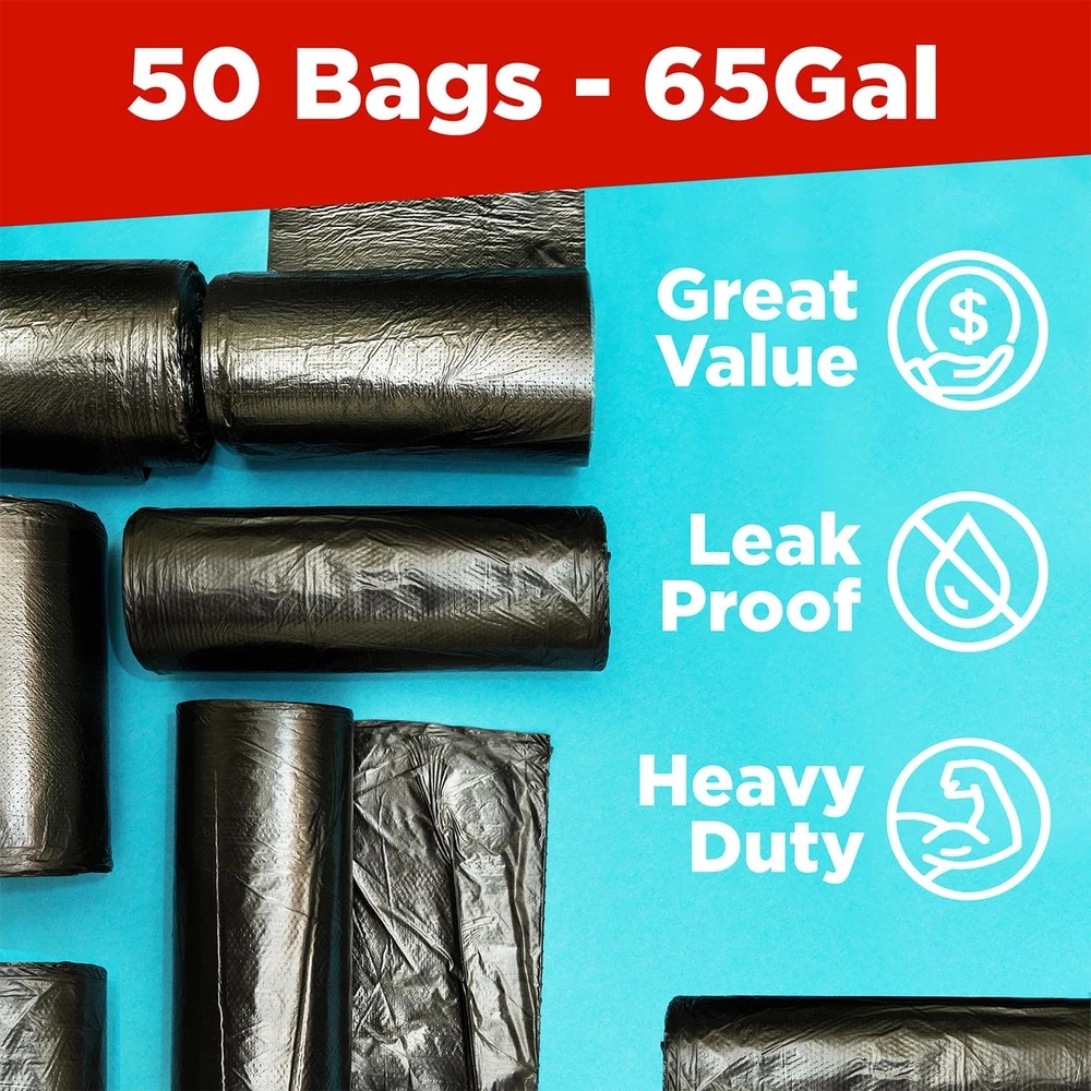 Multipurpose Extra Large Trash Bags - These 65 gallon trash bags heavy duty can hold or store large volumes of construction, residential, or industrial waste. These 50x60" big trash bags come in 50-packs. Thick Contractor Bags - These industrial-grade drum liners are tough with a 1.2 mil thickness. The heavy duty material makes these bags strong against accidental rips, punctures, and tears. No More Ill-Fitting Bags In Trash Cans - Lining your garbage can with these 64-65 gallon heavy duty garbage bags is easy because the gusseted design makes for a better fit. This also helps keep nasty leaks at bay. An Eco-Conscious Choice - Each polyethylene heavy duty trash bag is made of partially recycled materials, making these lawn bags a good choice for those who wish to reduce their carbon footprint. Locally Made - These large contractor garbage bags are made in the USA.