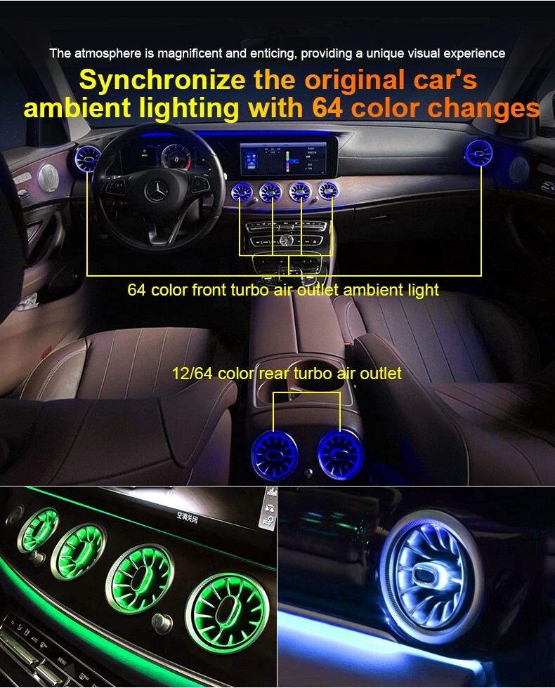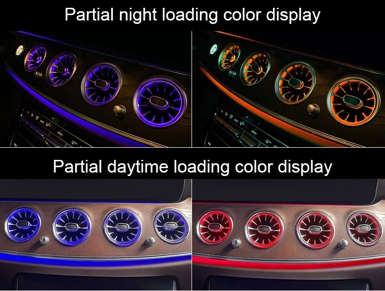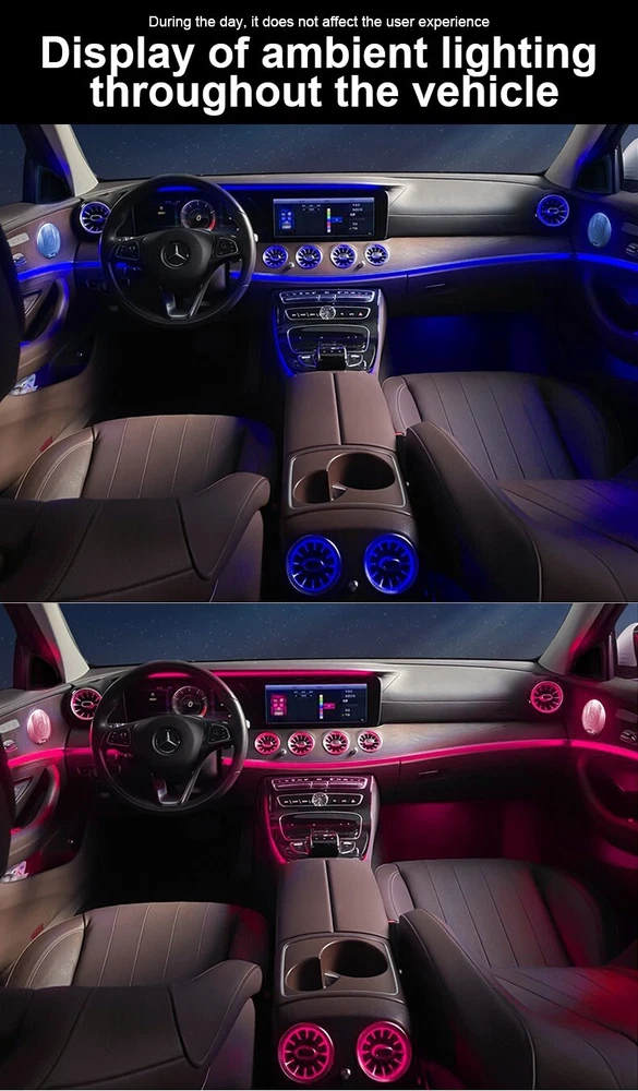 Features: 100% Brand New in Box W213 8PCS/Set 64 Colors NEW Version High Quality Plug and Play Interior Front and Rear Dashboard Air Vent with Ambient Light 1:1 Replacement; NO Modification Required Fitment: For Mercedes Benz E-Class W213 2017 2018 2019 2020 2021( 64 Colors ) - OEM design, fit original air vent position perfectly - Light color is synchronized with original ambient light - Light color and brightness can be controlled by original Command knob Package included: 8 PCS/Set Front and Rear Air Vents with Ambient Light NOTE: NOT Including Installation Guide or Manual. Professional installation is highly recommended .