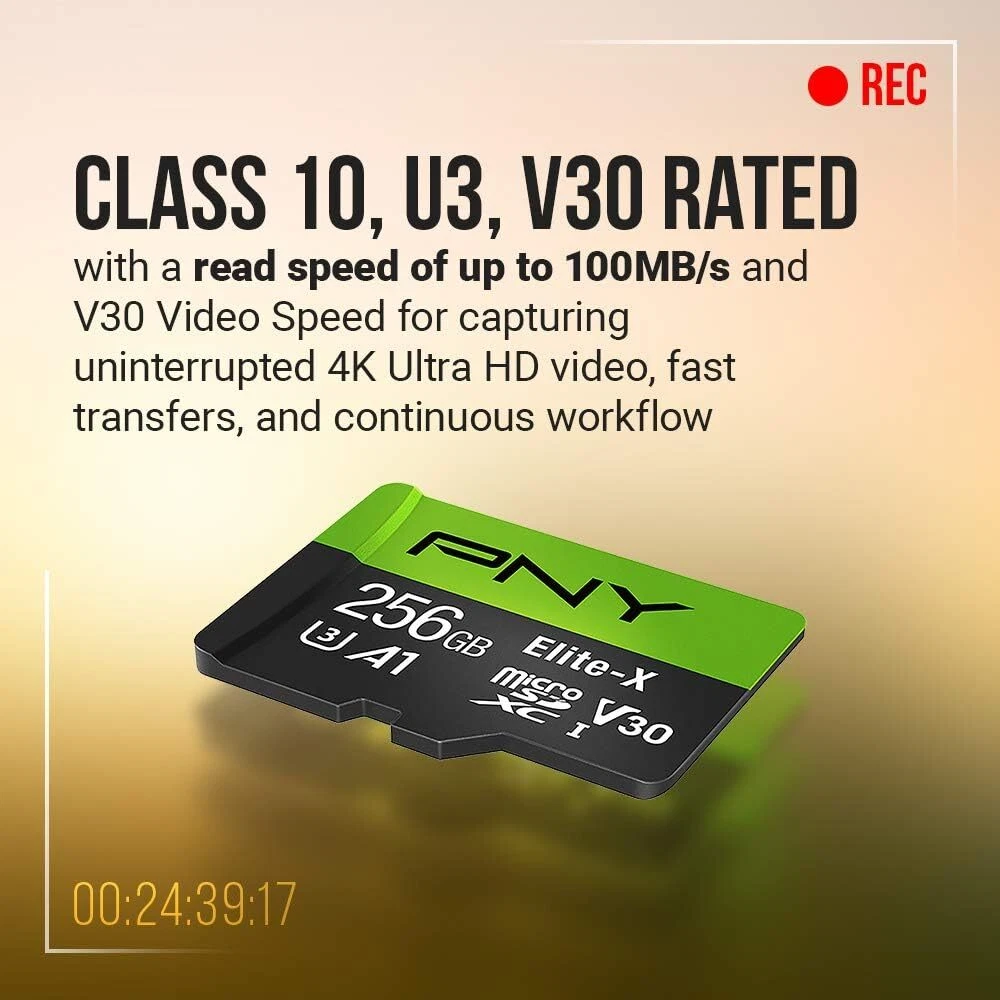 Class 10, U3, V30 speed class performance with read speeds up to 100MB/s for fast and smooth burst mode HD Photography and 4K Ultra HD Videography A1 App Performance enables apps to run directly from the microSD card, delivering faster app launch and performance. A1 provides minimally 1500 IOPS (Read) and 500 IOPS (Write) Record and transfer videos, photos, music, files and more from microSD enabled host devices such as Android smartphones and tablets, action and surveillance cameras, drones, computers and more Included SD adapter for compatibility with SD enabled host devices including DSLR cameras, video cameras, desktops, and laptops Reliable & Durable: Magnet Proof, Shock Proof, Temperature Proof, Waterproof The PNY Elite-X Class 10 U3 V30 microSD Flash Memory Cards are the perfect solution by which to expand on-board memory of mobile devices such as smartphones, tablets, action cameras, drones, and more, allowing users to free up space to enjoy more digital content. The Elite-X microSD Flash Memory Cards are rated Class 10, U3, V30, with read speeds of up to 100MB/s, guaranteeing that users can not only quickly and easily store and share content between devices, but also engage in HD photography and 4K Ultra HD Videography by leveraging the U3 technology. What’s more, the Elite-X microSD Flash Memory Cards feature V30 Video Speed Class, ideal for 4K Ultra HD video at 4096x3072 format, allowing users to capture high quality content on their mobile devices. Rated A1, the PNY Elite-X is optimized for app performance, allows users to run apps directly from the microSD card, delivering faster app launch and performance than ever before.