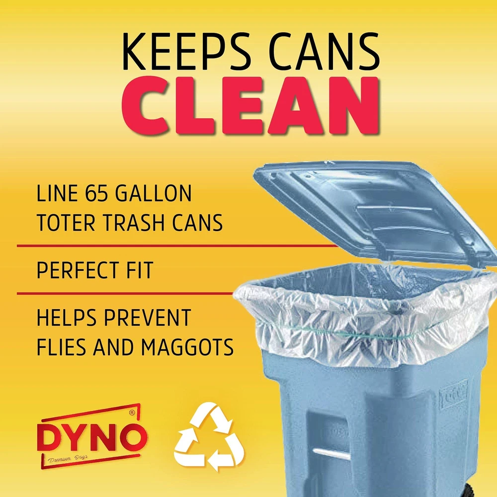 65 GALLON TRASH BAGS – These large trash bags are designed to fit a 64 gallon trash can with wheels, with enough excess to overlap the side and tie the bag off when full. Suitable for residential household garbage and commercial waste. Keeps cans from getting dirty. INDIVIDUALLY FOLDED – 1.5 mil thickness for tear resistance and durability. Unlike most heavy duty trash bags, ours come individually folded so you can take at a time without bringing the whole roll with you. The trash bags remain uncrumpled and easy to open. HEAVY DUTY INDUSTRIAL STRENGTH – Made from industrial strength low density resin with a thick gauge that makes these trash can bags resistant to tears and leaks. Will not break or lose structural integrity even when punctured by thorns, sticks and pointy objects. PROUDLY MADE IN USA – Our bulk garbage bags are proudly Made in the USA under strict environmental guidelines and quality assurance standards. Ideal for use as heavy duty contractor bags, lawn bags and trash can liners for large commercial garbage or recycling. KEEP LARGE TRASH CANS CLEAN – Use these trash compactor bags to keep the trash can clean and free from foul odors. Keep everything contained before trash day pickup and avoid rotten spills that attract flies and maggots. A perfect fit without being too tight or slipping down.