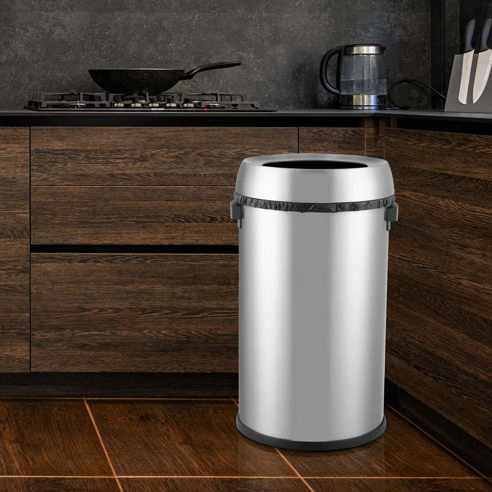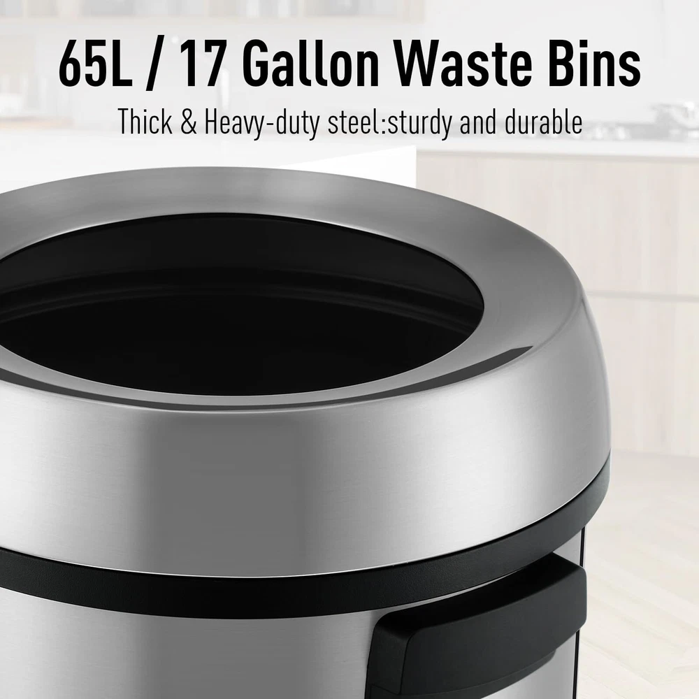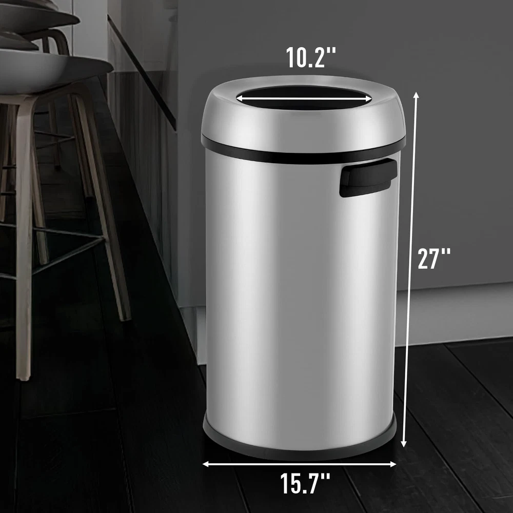 【Wide Open Lid & No Touch】 Lidless design makes throwing out the trash easier than ever, no more worry about using the pedal or touching the lid of the trash can, great for preventing exposure to germs, wide mouth design allows larger items to be thrown out. 【Non-Slip Base】The non-slip base features TPR-Material rubberpads for a gentle tread on the floor and keeps the trash jar stable. 【Dual Side Handle Design】Just grab the side handles to move the jar. There are handles on both sides for easier movement. 【Lift-Up Lid】Changing trash bags is even easier with the easy-lift-off lid. 【Product size】16.5*15.7*27.1 in Product weight: 9.0 Lbs 【Package Size】18.3*18.3*29.9 in Package Weight: 14.3 Lbs