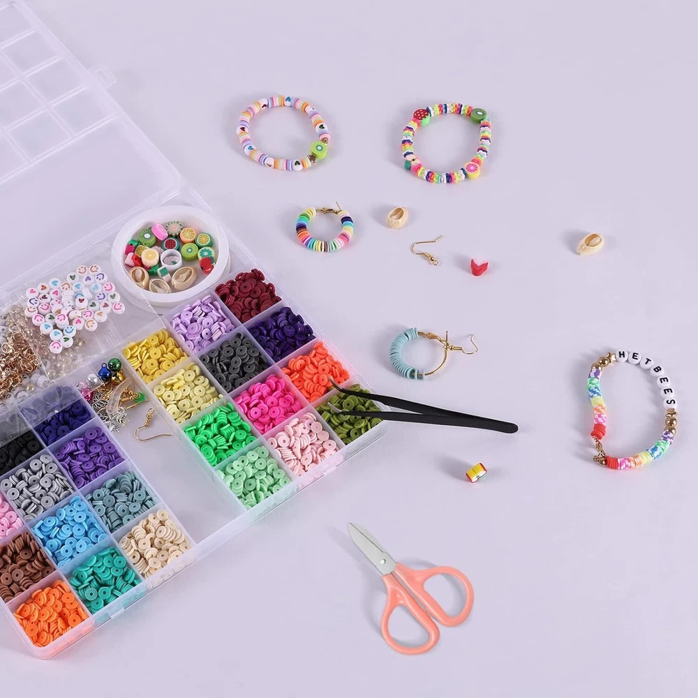 【Premium Clay Beads Kit】The clay beads for bracelet making kit include 6000pcs clay beads and 500pcs charms kit (contains random letter beads, smile beads, colorful heart beads, fruit beads, silver charm pendant, jump rings, lobster clasp, etc.), 1 elastic string cords(0.8mm), scissor, tweezers. Polymer clay beads are lightweight, comfortable to wear. 【Rich Colors】24 bright colors of 6mm polymer clay beads meet your requirements for colorful DIY items. You can create a bracelet using mixed polymer clay blackstone beads and your favorite pendant. 【Safe Material】The clay beads are made of polymer clay. Eco-friendly, non-toxic, comfortable to wear and waterproof. It can be worn every day, not easy to fade. 【Easy to Organize】Our jewelry making kit contains everything you need. All items are neatly placed in the box. There will be no messy desktop after use, convenient for your next use. A simple and fun kit. 【Wide Use】The flat beads for DIY crafts bracelets, such as necklaces, earrings, key pendants, anklets and many decorations. They are a great gift for children, family, friends, and yourself.