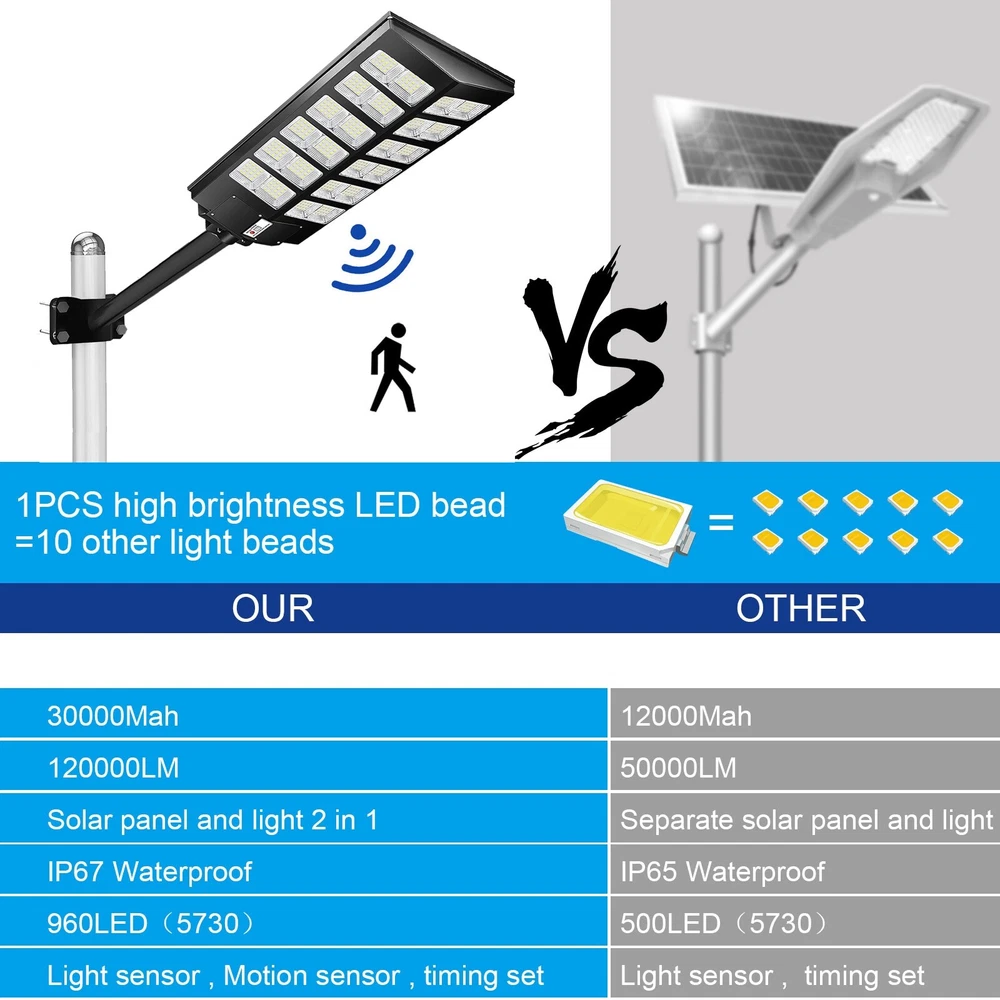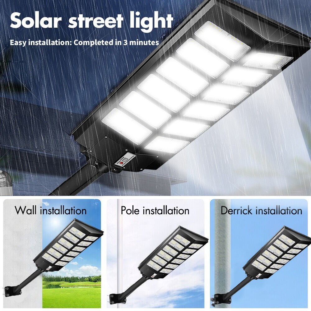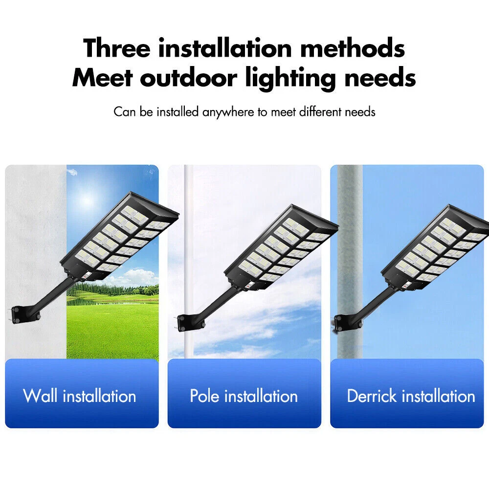 【Super Bright Solar Street Light】2600W solar street light uses high efficiency 960 pcs 5730 high bright long lifespan SMD lamp beads, 300000 Lumens are extremely bright and have low light decay. With a 240 degree wide-angle lighting design, which can provide lighting range up to 3800 square feet and brighter compared with ordinary street lights. 【NO Electricity Bill】This solar parking street light provides 6500K daylight white light and is equipped with 800 PCS super bright LED beads and a 3.2v-48000mAh battery (with a life of up to 50,000 hours). The IP67 waterproof commecial grade makes it work well even in bad weather all year round. It is solar powered street light, produces no electricity bill, automatically turns on at dusk and turns off during the day, and can provide continuous lighting for up to 30 hours (when fully charged). 【3 CONTROL MODES】1. Motion Sensor: keeps 30% power lighting until motion is detected, automatically adjusts to 100% power lighting, and then returns to 30% power brightness after the person leaves for 20 seconds; 2. Timed Lighting: Timed 100% power brightness Lighting for 2/3/5/6/8 hours; 3. Always Lighting: Always 100% power brightness lighting (in this mode, you can adjust the brightness of the street lights to 25%-100% brightness). 【Easy to Install, No Wiring】The package contains 2 kinds of mounting screws and accessories, as well as solar light arm poles. The LED street lights are easy to install, with screw fixing and dependable operation without the need for wiring or trench. You can install solar lights on walls, trees, light poles, etc., wherever you want to install them (support street light post diameter: 1.5 to 4 inches, suggest height 18-25ft). 【Reliable After-Sales Service】offers 24 months of after-sales service, ensuring a good purchasing experience for our customers. If you have any questions regarding our solar street lights outdoor, please don't hesitate to reach out to our customer service team. 200000LM Solar street light, 0 electricity bill, Remote control, Light sensing function, Motion sensor 1. solar street light provides super brighter daylight at full night, no electricity distribution, fast charging, energy saving. 2. IP67 waterproof, Can deal with -5°C-70°C temperature and bad weather in daily life. 3. Easy to installation for wall and lamp post, the package contains 2 kinds of mounting screws and accessories, as well as solar light arm poles, applicable lamp post diameter: 1.5~4 inches. 4. Light control + multi-function remote control, turn off and charging during the day, working lighting from down to dawn. 5. The remote control has a memory function, it can turn on and off light, be timed lighting, and adjust motion sensor mode. 6. Continuous working time: More than 12 hours in constant light mode, 20-24 hours in motion sensor mode. 7. 60000mAH large capacity battery, long battery life, can work continuously for 50000+ hours, more than 5 years. 8. Two ways to turn on the light: Button Control + Remote Control. Solar street lights automatically turn off the lights during the day to charge, and turn on the lights at night for work lighting; IP67 Waterproof, can work in all bad weather IP67 Waterproof, can work in all bad weather Make Sure The Solar Light Has Been Fully Charged and The Remote Control Has Battery Already: 2*AAA (Included) ON: Turn ON the light and Always lighting; OFF: Turn OFF the solar light; 25%-100%:Always Lighting 25%-100% brightness; 2H/3H/5H/6H/8H:Timed Light Up Lighting 2/3/5/6/8 hours; 'Radar': Motion sensor mode (When no one is there, 0% brightness lighting of solar lights; 100% brightness lighting when someone passes by; 30% brightness lighting after people leave for 20 seconds); Note:In Always/Timed Lighting mode, if the light is not adjusted for a long time, the brightness of the light will decrease some brightness every 3 hours in order to prolong the lighting time. Q: Can it work on cloudy days? A: Yes, it can work in all environments, but it needs sunlight when charging, otherwise it cannot be fully charged; Q: Why are the lights turned on at night? A: When the solar panel is in the dark (the solar panel cannot detect the light), at this time the green indicator light will be off, and the light can be turned on by the remote control and the button on the lamp; Q: How long can it work on a full charge? A: Always lighting mode can work for more than 12 hours; Motion sensor mode can work for more than 20 hours;
