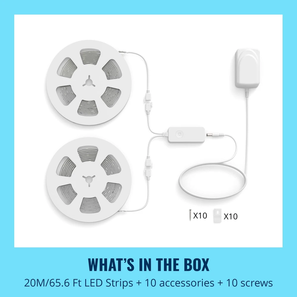 DISPLAY MULTIPLE COLORS AT ONCE: Bring on the dazzling effects like chasing rainbows, color fades, and sparkles. Go beyond solid colors with individually controllable full-color segments. LONG AND FLEXIBLE: Super long 65 ft length means you can bend WiZ light strips into any shape and fit them into any room size. RELIABLE AND EASY TO INSTALL: WiZ light strips feature a protective coating around the LEDs, so you can’t damage them. PLUG AND PLAY: Like all WiZ lights, our light strips work with your existing Wi-Fi. Control from anywhere with the WiZ app or go hands-free with voice control. SMART FEATURES: Schedule your lights to turn on or off to fit your routine and control them using Google Home, Amazon Alexa, and Apple HomeKit.