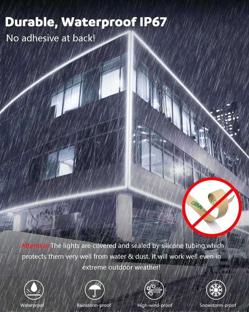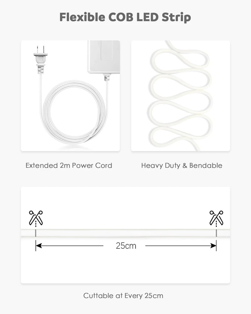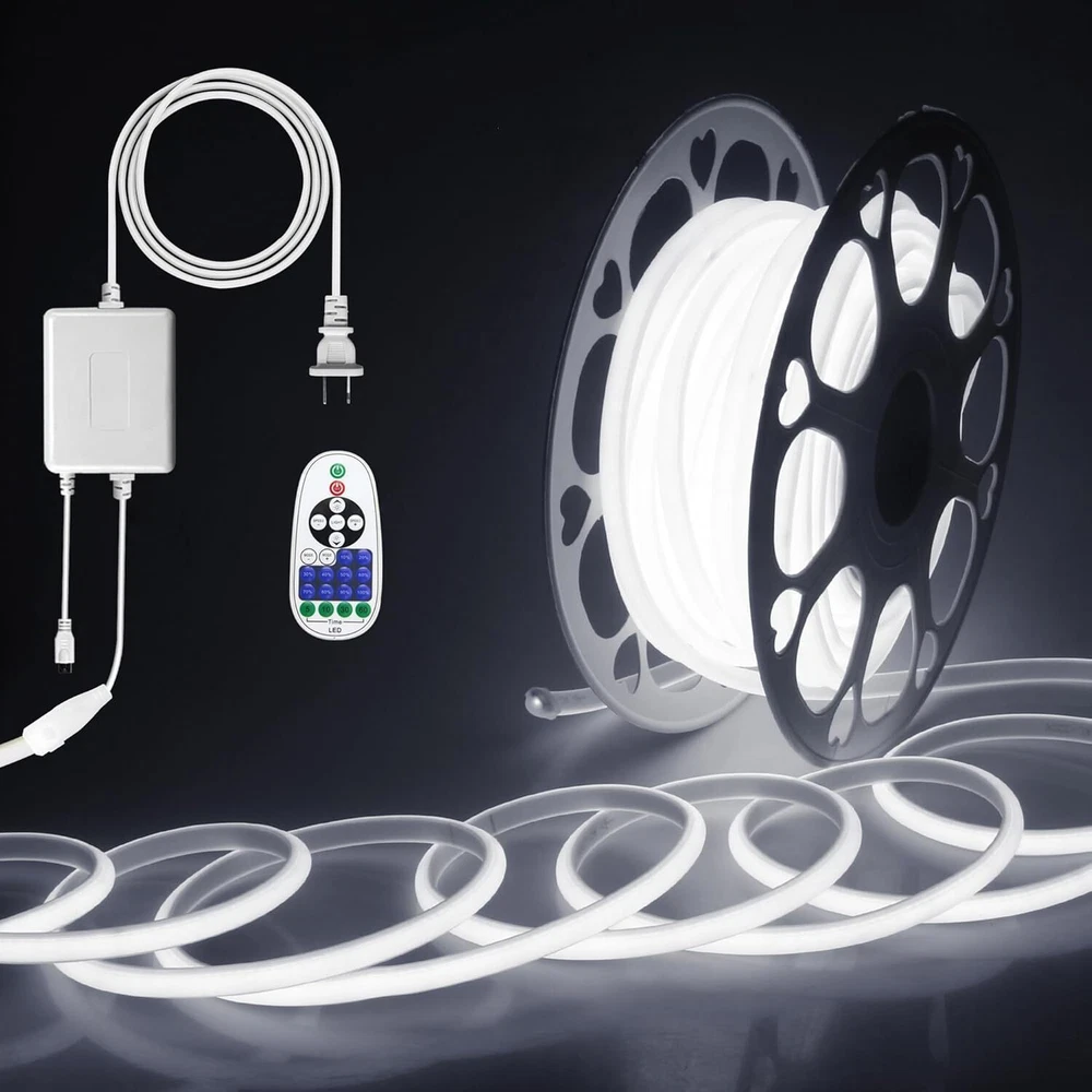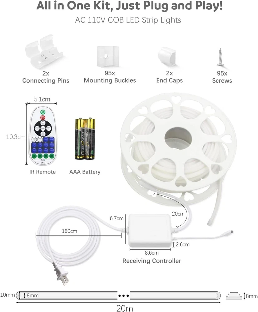 Product Description 65.6ft Outdoor COB LED Strip Lights Waterproof IP67 AC 110V 120V Dimmable LED Light Strip Daylight White 6000K 5760LEDs Uniform Glow Neon Light Strip with Remote for Patio Garden Pool Decor Plug and Play:AC 110V to 130V input, no power supply required. The extended 2-meter power cable spans a large area, allowing for great creativity. Using the controller, you can easily turn on and off the lights, adjust brightness and light modes.10-100% dimmable brightness, saving user settings. Dotless and Uniform Glow:288LED/M, 5760LED/20M, this high-density LED chip provides brighter, softer, and more uniform light than traditional SMD strip lights, without worrying about black spots. Daylight white 6000K, CRI>90. The continuous length of 20M is suitable for lighting projects that require long and high-quality LED strips. Flexible COB LED Strip: Made of flexible PCB, the LED strip is cuttable. It can also be bent freely to any shape. Along the cutting mark on the back, it can be cut once every 50 cm. The light strip is very suitable for indoor and outdoor DIY lighting projects. Such as ceilings, corridors, swimming pools, terraces, RVs, etc. All in One Kit:The kit includes 1 20-meter COB LED strip with AC 110V~130V input, 1 control, 95 mounting buckles, 95 screws, 2 AAA batteries, 2 end caps, and 2 connection pins.Easy installation without welding. Note:Please be careful when installing and using it!Do not roll it up when it is ligting! Widely used:LED strip is sealed with silicone hose, IP67 waterproof, which can beautify indoor and outdoor lighting scenes. It is very suitable for bedroom, kitchen, furniture lighting, living room, corridor, cabinet, wardrobe, TV wall, billboard backlight, bridge, parking lot, Christmas decoration and display cabinet, bar, hotel, KTV, nightclub, etc. About Us We are a reputable seller with many years of experience selling on eBay. Our goal is to provide high-quality products and excellent customer service. Payment 1.We accept PayPal only. 2.All major credit cards are accepted through secure payment processor PayPal. 3.Payment must be received within 7 business days of auction closing. 4.We ship to your eBay or Paypal address. Please make sure your eBay and Paypal address is correct before you pay. Feedback will be left automatically after we receive your feedback. Please contact us before leaving a Negative feedback or Neutral feedback. We would try our best to help you solving any problem. Shipping Items will be shipped within 1-3 business days when we received payment. (Orders are not processed on weekends & holidays) Tracking information will be sent once item is shipped. Delivery time depends on destination and other factors Item is shipped to ebay address. Leaving correct address can minimize delay. For international shipping and shipping to Guam, Hawaii and Alaska, Please contact us before placing the order. International buyers please note: Import duties, taxes and charges are not included in the item price or shipping charges. These charges are buyer’s responsibility. We will try our best to reduce the risk of the custom duties. Local pick-up is unavailable at the moment. Returns For any issues with Defects, Return, Item Exchange request, please contact us first and send us a message first before opening any type of case or request. We devote ourselves making EVERY CUSTOMER in 100% Satisfactory and resolve any problem. We highly value and appreciate your business. Thank you. No returns will be accepted without an RMA number. Please contact us for the RMA number. Return is acceptable within 30 days of delivery. Return for replacement or money back is optional. Returned items must be in the brand new, unaltered and resalable condition. Seller is not responsible for any labor cost, expense in a dealer store, or damage due to wrong installation. Contact Us We reply any email messages within 1 business / working days(off-duty at weekend). If you do not get a response from us, then please check your junk or spam mailbox. Our Business hours: Mon-Fri 9:00-18:00, UTC/GMT +8 hours. Please contact us either by clicking "contact seller" in the "purchase history" section or simply click "ask a question" at the bottom of this page. If you are unsatisfied with our item or service, please contact us before leaving any feedback. We are committed to resolve all issues in a friendly and satisfactory manner. powered by