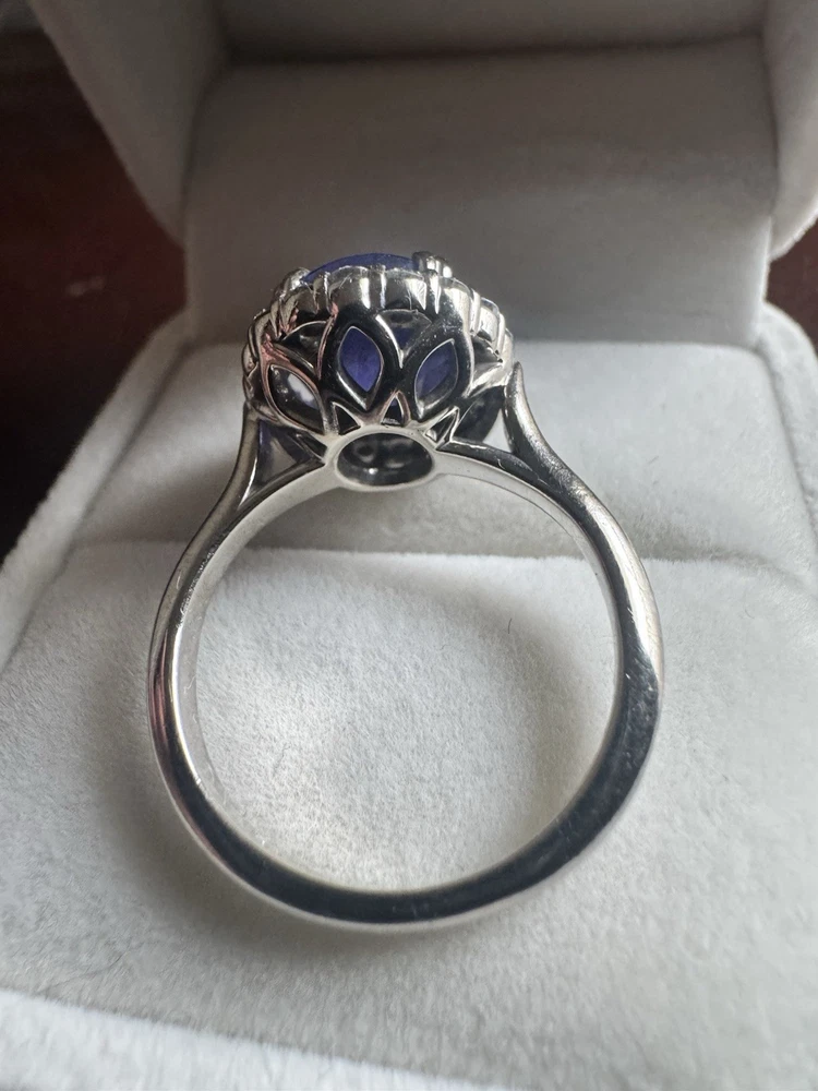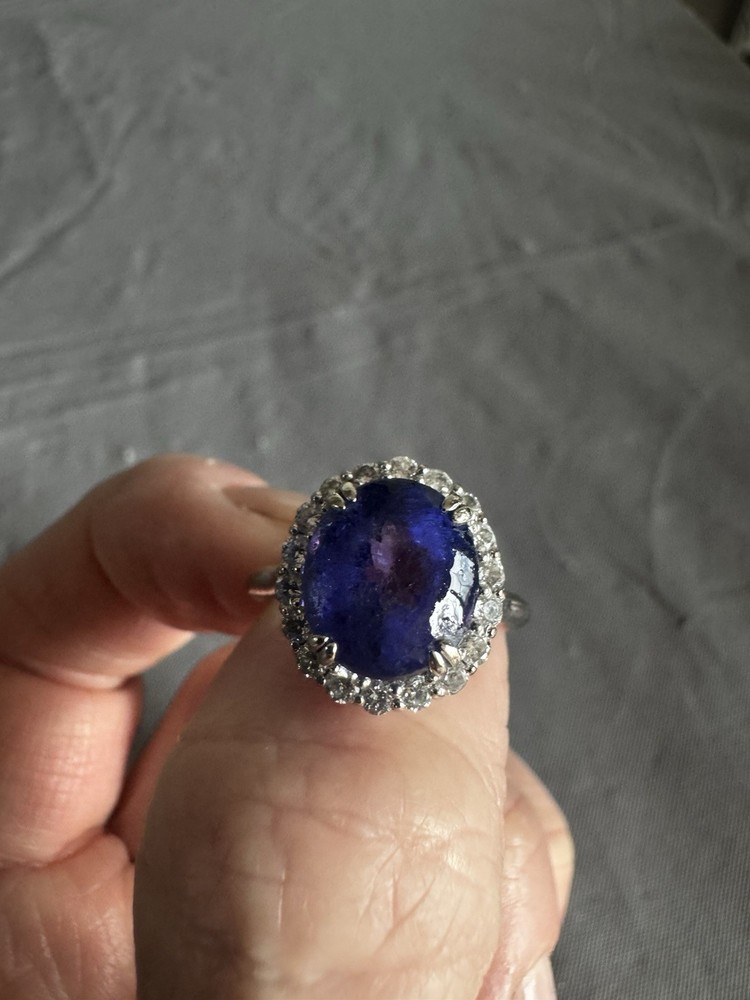 Stunning Custom Tanzanite & Diamond Halo Ring – 14K White Gold Offered for sale is an exceptional oval Tanzanite and diamond halo ring crafted in solid 14K white gold. This elegant statement piece features a vivid bluish-violet Tanzanite surrounded by sparkling natural diamonds in a classic halo setting. ✨ Center Stone: • Natural Tanzanite • Oval Modified Brilliant Cut • Weight: 6.57 carats • Color: Bluish Violet • Tone: Medium Dark • Saturation: Vivid • GIA Type I – Eye Clean • Approx. Measurements: 11.54mm x 10.07mm x 7.56mm ✨ Accent Stones: • 18 Round Brilliant Cut Diamonds • Approx. 0.03ct each • Total Diamond Weight: 0.54ct (estimated) • Color: I–J • Clarity: SI1 ✨ Ring Details: • Metal: Solid 14K White Gold • Total Gem Weight: Approx. 7.11ctw • Combined Gem & Metal Weight: 7.3 grams • Setting: Split 4-prong center with oval diamond halo • Condition: Pre-owned (please see photos for details) This ring carries a previous insurance appraisal value of $10,609 (2021). Please note that insurance appraisals reflect retail replacement value and not resale value. The tanzanite displays rich color with natural inclusions consistent with genuine gemstones. It is an eye-catching piece perfect for a statement ring, cocktail ring, or alternative engagement ring. 📦 Ships securely packaged and insured. 📄 Copy of appraisal available upon request.