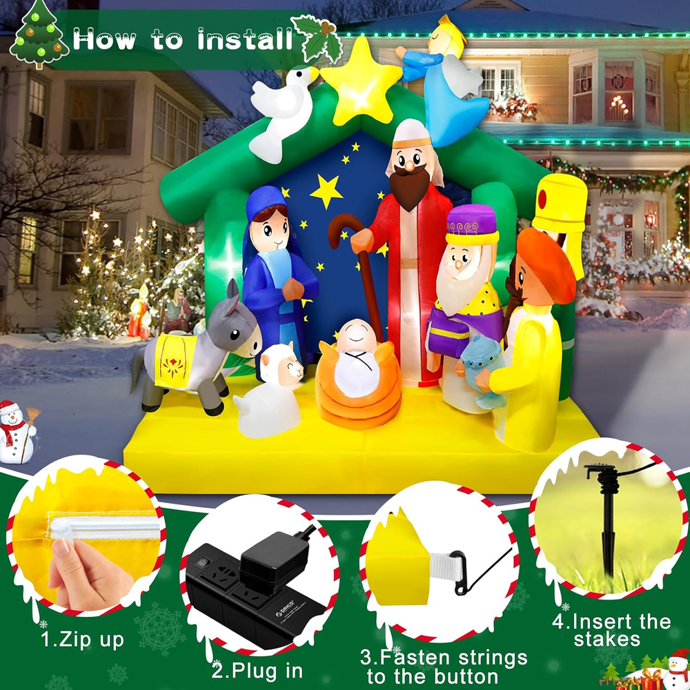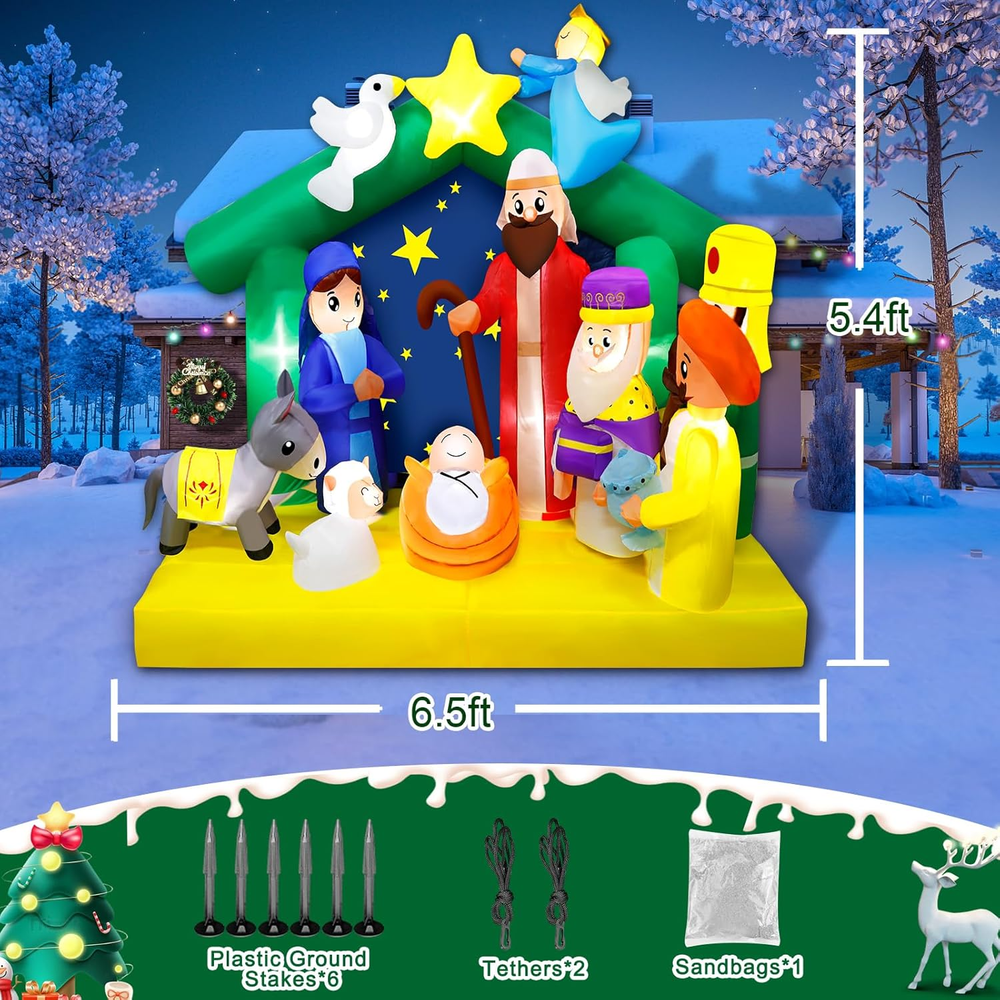CHRISTMAS NATIVITY SCENE - A 6.5ft Christmas inflatables nativity scene depicts Mary and Joseph welcoming the birth of Jesus, the lovely sheep and donkey surrounding baby Jesus, and three kings send their wishes to little Jesus. Beautiful and warmer nativity scene inflatable Christmas decorations, adding a strong Christmas. BUILT-IN LED LIGHTS - Christmas blow up decorations built in 14 LED lights inside the inflatable outdoor nativity scene, glowing on Christmas night and light up your garden, attracting everyone's attention and soaking in the joyful holiday, making your house a big point in the neighborhood. EASY TO SET UP - Christmas inflatable outdoor decorations size: 6.5ft wide x 5.4ft tall, just zip the zipper and plug in the adapter, powerful blower quickly inflates it in a few minutes. Equipped with 6 ground stakes and 2 ropes. After the holiday, only open the zipper and deflate it, you can easily store blows ups for next year's use. WEATHER RESISTANT - Christmas outdoor inflatables made of polyester, which is thickened and waterproof, weather-resistant, fade-resistant, fixed a sandbag into the inflatable bottom, add weight to prevent it from being blown over, Whether it's rain, snow, or strong winds, you can rest assured. NATIVITY INFLATABLE CHRISTMAS DECORATIONS- Outdoor Christmas nativity sets with 6 pcs ground stakes, 2 ropes(2m), and 2 hooks. Perfect outdoor nativity scenes for garden, lawn, porch, front door and holiday decor, bring a great Christmas holiday experience, blow up nativity scene create a for Christmas Day. Product description