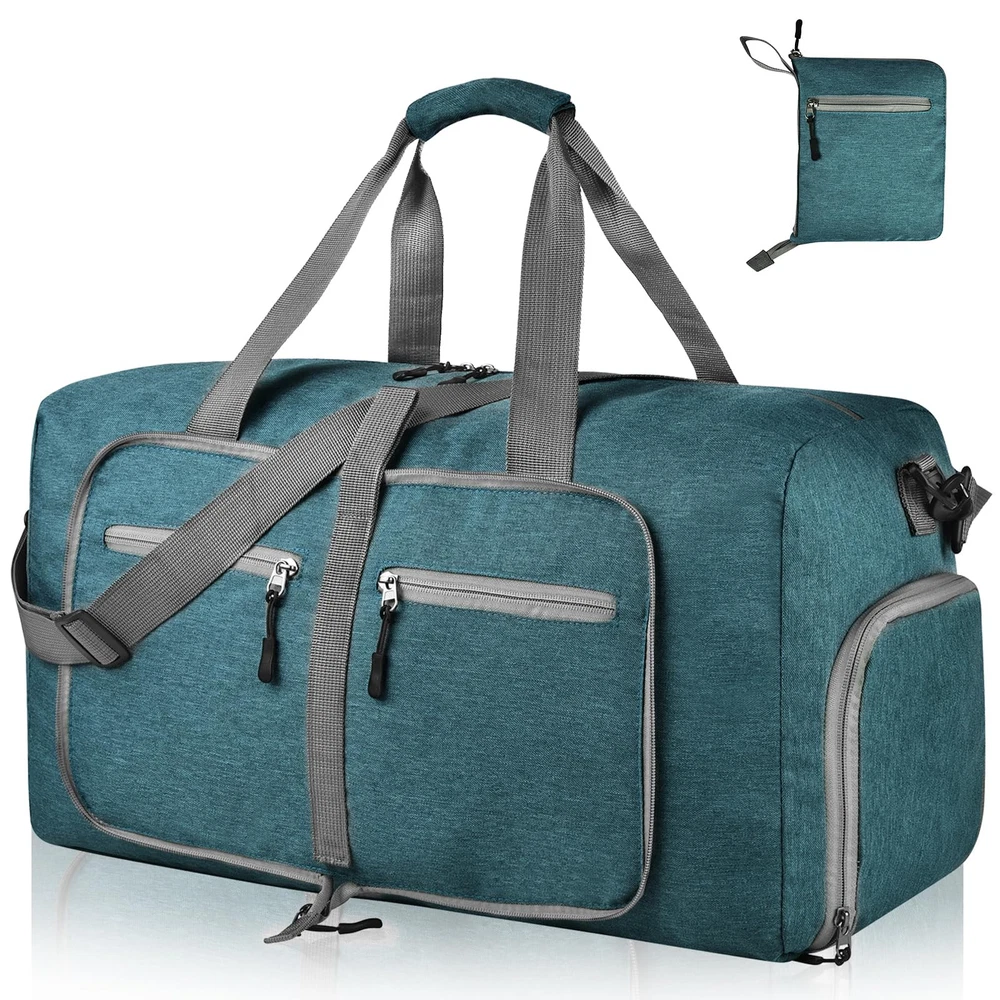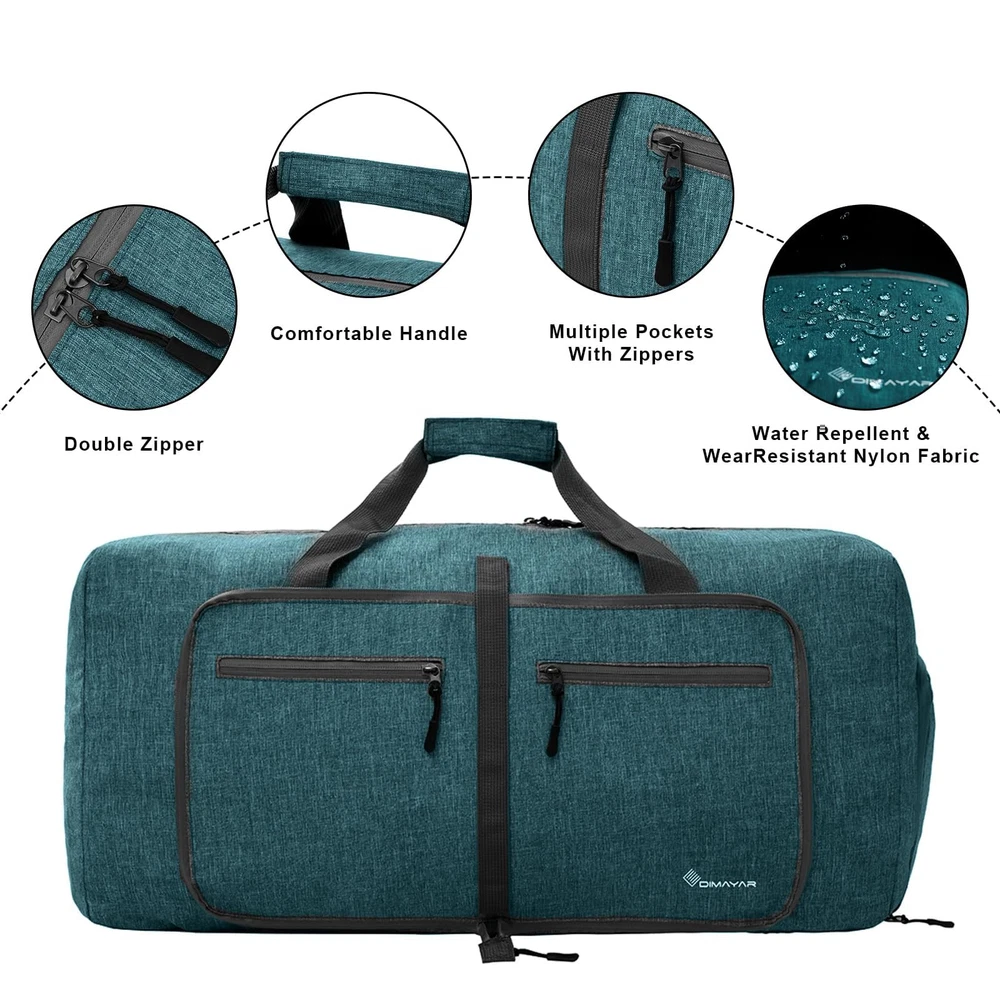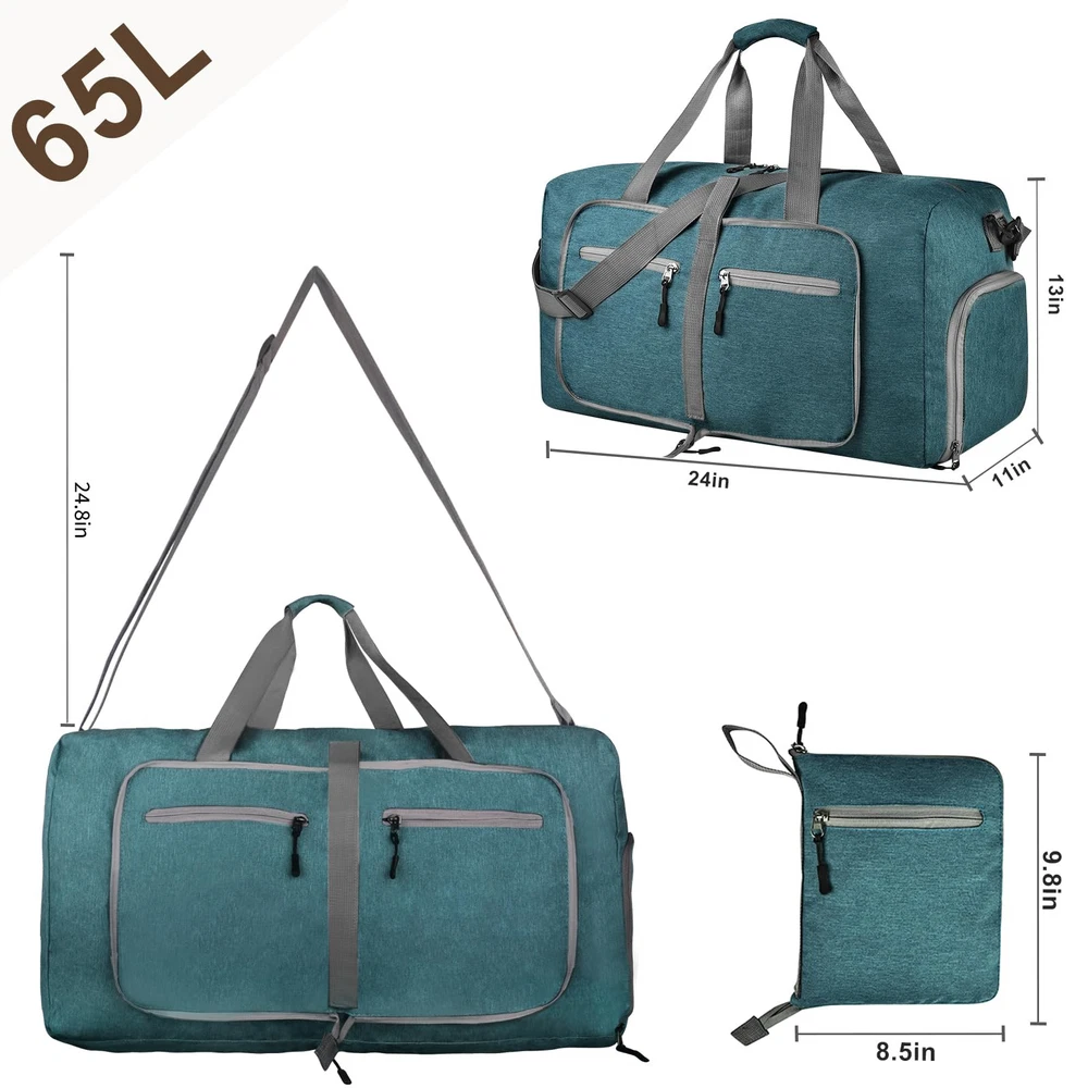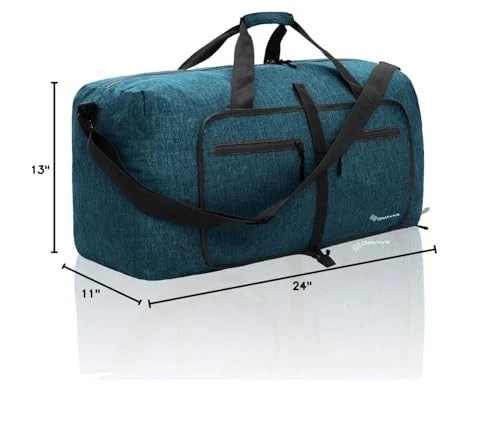 Large Capacity duffel bag(Product Dimensions of unfolded size: 24"*11"*13").Durable and Lightweight packable duffle bag:Made from water repellent& wear resistant&tear resistant heather polyester fabric and premium zippers, the large duffel bag super durable and lightweight. It weighs only 0.9 pounds and folded size only 8"*10" which is very easy to store it. Foldable and Spacious travel bag:The travel organizer bag can be folded into a really small size taking up so little space but opens up to have about 40L capacity of travel bags to use as a luggage bag in case that your suitcase swells. This travel duffel bag is designed to work best with bag packing cubes - to give you an organized lightweight travel experience. Multipurpose:Your good companion for traveling!could be served as a gym duffle/ sports bag / overnight bag / weekend bag / airplane carryon bag / shopping bag/ Just-In Case bag as well.You can even keep the cute duffle bag at home as a dirty laundry bag. Reasonable Design:This luggage duffle bag is featured with internal end-pouch& shoe compartment, multiple pockets, 2 handles, adjustable& removable long shoulder strap and sleeve on the back to slip it over luggage handles to offer you better usage experience.
