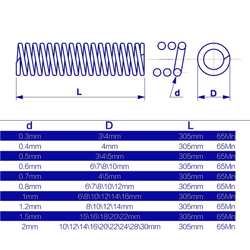 Product Description: ※ Model: Compression spring/Y-type compression spring ※ Material: 65 manganese steel ※ Line warp: 0.3mm /0.4mm / 0.5mm /0.6mm / 0.8mm/1.0mm/1.2mm/1.4mm ※ Length: 305mm ※ Outer diameter: 3mm ~ 30mm (Optional) ※ Surface treatment: blackening ※ Specification: wire warp x outer diameter x length