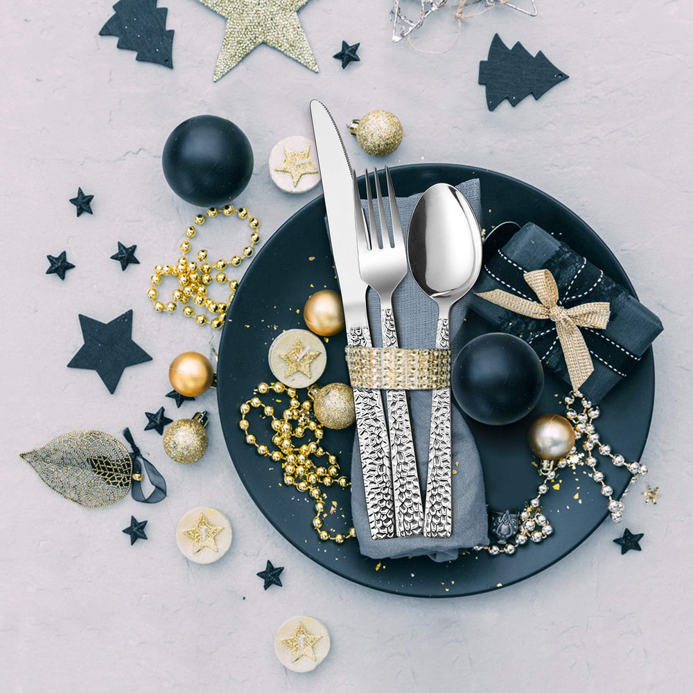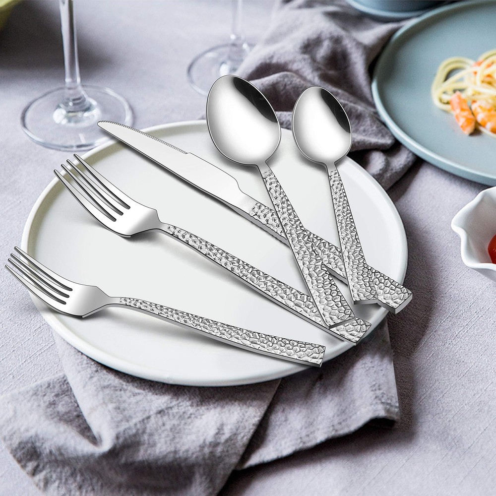 * QUALITY MATERIAL: 65pcs flatware set is made of high quality 18/0 stainless steel which ensures rust resistance and nickel free, High hardness metal won’t bent easily, Healthy and durable for years to come, Dishwasher Safe * SERVICE FOR 12: Comes with 12 Dinner Knives, 12 Dinner Forks, 12 Dinner Spoons, 12 Teaspoons, 12 Salad forks, Additional 5-piece service set includes Serving Slotted Spoon, Serving Spoon, Serving Fork, Pie Server and Butter Knife * HAMMERED DESIGN: Beautiful hammer design creating a luxurious appearance, Modern yet classic, Mirror polish makes these fancy pattern always keep shining, Will not dull, Would match well with your existing plates or other dinnerware * PROPER WEIGHT: These cutlery are of moderate weight, Not too heavy nor too light, Provide a comfortable to hold, and sharp blade makes it easier to cut food, Enhancing the dining experience * MULTI USE:Perfect for your warm family daily use, Nice choice as a gift to your family and friends, Also good for buffets, gatherings, dinner parties, restaurants, weddings, camping, birthday parties