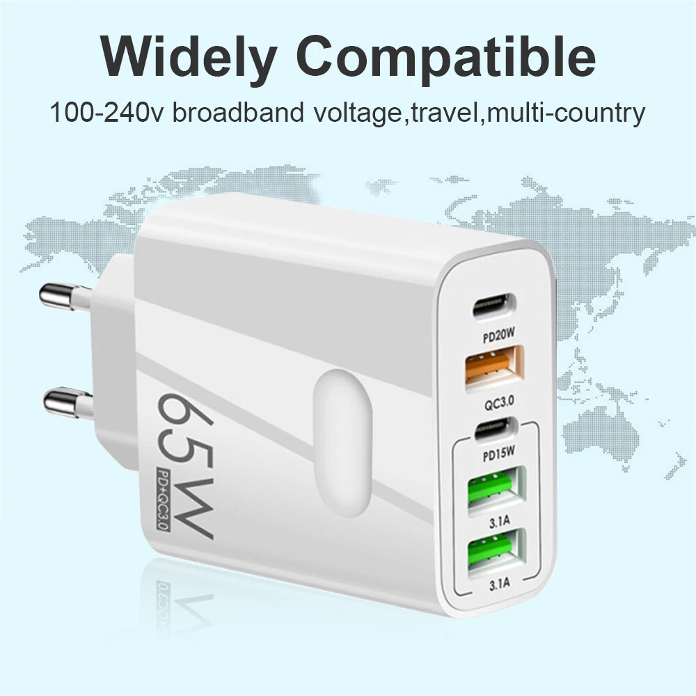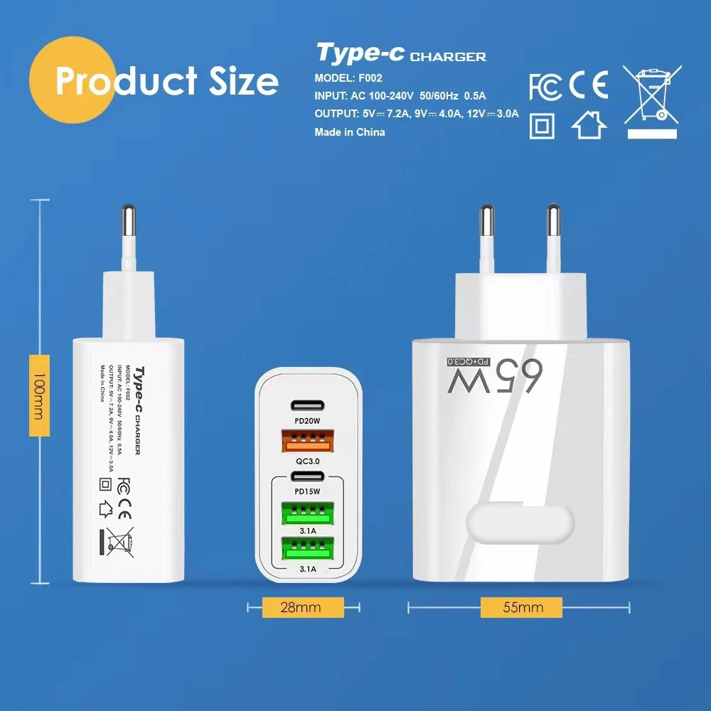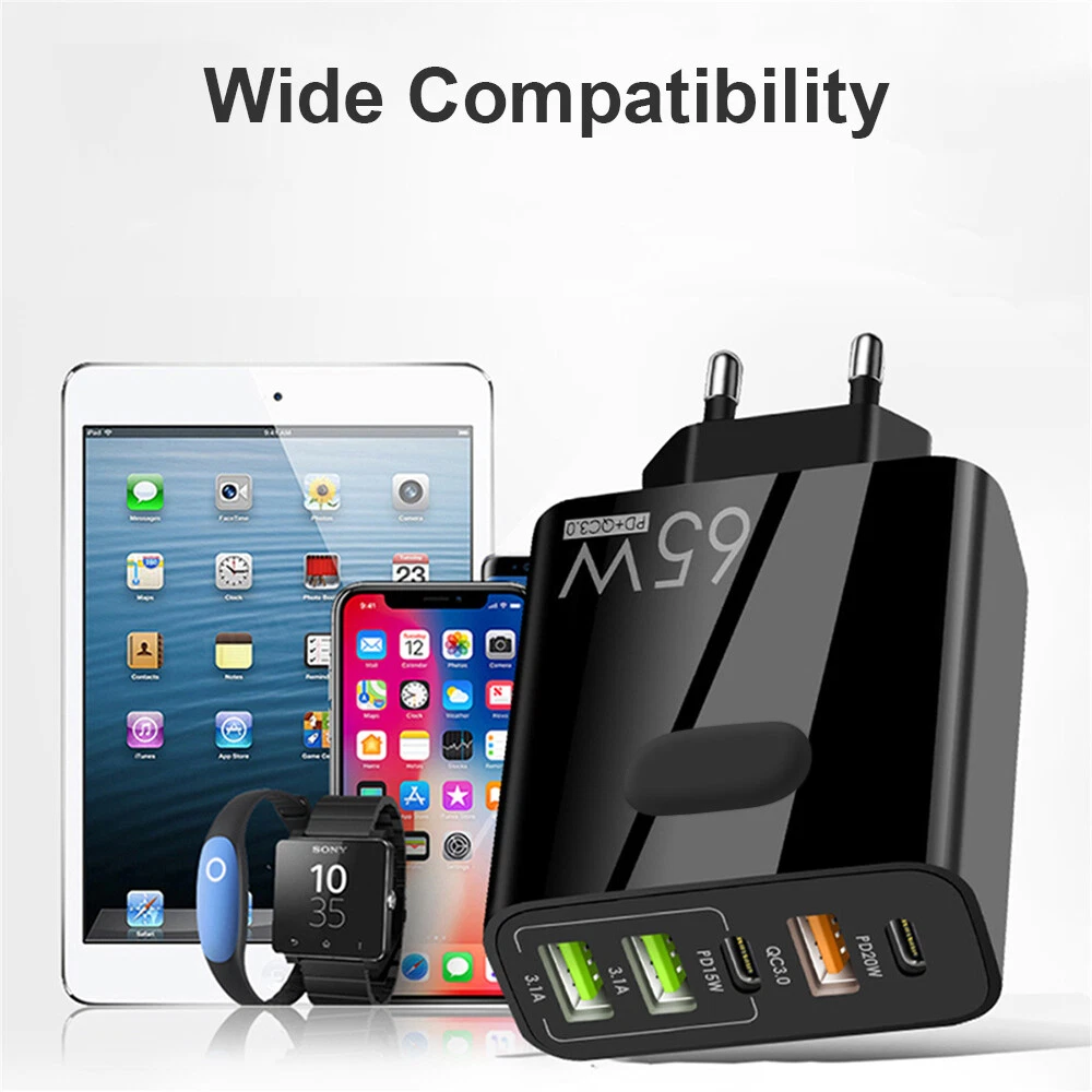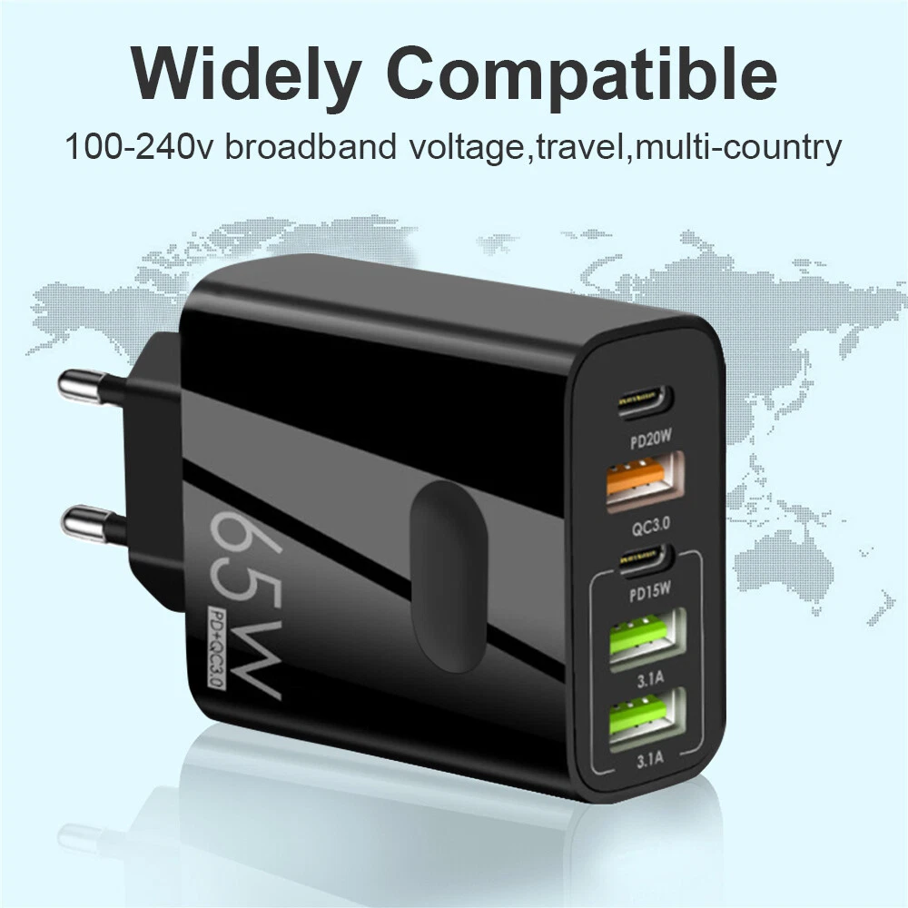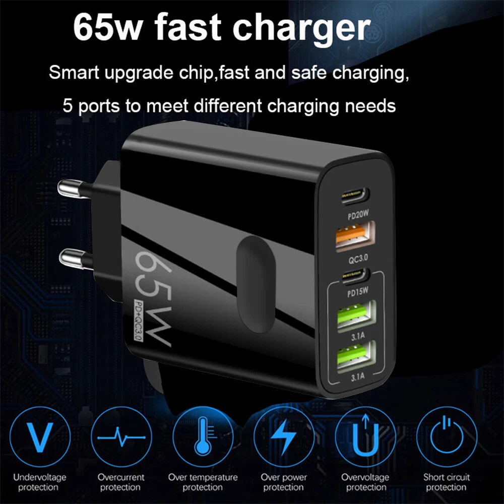 65W PD USB C+A Charger Plug Quick Charge Multi Port Travel Adapter Fast Wall Charger for iPhone Samsung Android Phones Universal Fast-ChargingWith 65W high power output and quick charging protocols support for Apple/Samsung/Huawei/Xiaomi, this usb-c adapter charges your 13” MacBook Air to 100% in just 1.5 hours and iPhones 2times faster than industry standard. Incredibly Small Volume GaN tech concentrates 65W of powerful power in the compact size of a palm, portable enough to carry anywhere. The streamlined Gallium Nitride power system ensures a smaller and lighter charger with higher charging efficiency. Safe & ReliableBuilt-in intelligent chip enables the smart adjustment of output voltage, current and power via HPS technology when multiple devices are charged at the same time, higher charge conversion efficiency, lower temperature, and safe for use. Input parametersAC100-240V 50/60Hz 0.5A; Output parameters5V/7.2A9V/4.0A12V/3.0A; Package Included: 1 x 65W Charger