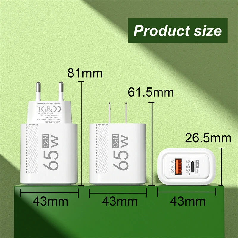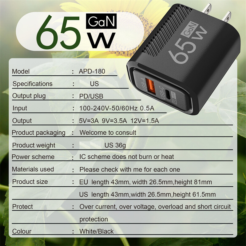 Description: 1. Fully charged, safe to use, with overcharge, overcurrent and overheating protection. 2. Flame retardant material, provide quality service for you and your devices. 3. Safety: This USB charger adopts shell design, not easy to damage. 4. Convenient for travel: With global voltage compatibility, small and portable design, you can charge anywhere. Specifications: Type: Charger Power: 65W Color: Black,White Charger plug: US plug, Warning: This product has 2 plugs with a total power of 65W. When multiple plugs are charged at the same time, the charging speed will be the same as that of a normal charger. If you encounter any problems during purchase or use, please feel free to contact us.