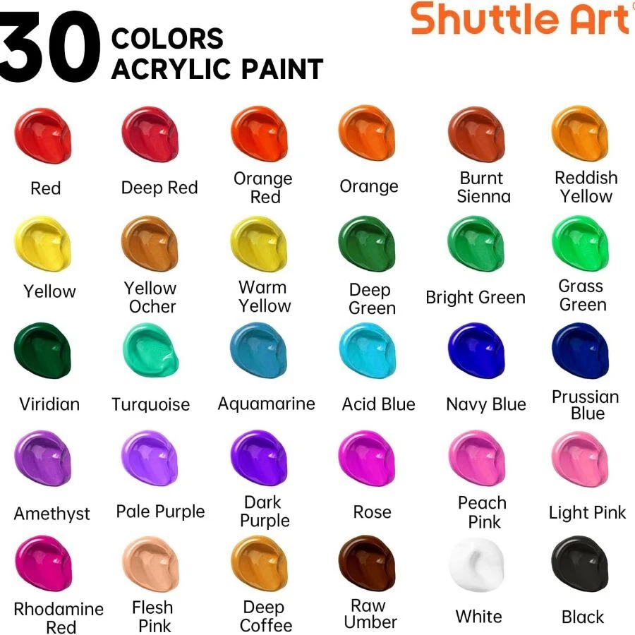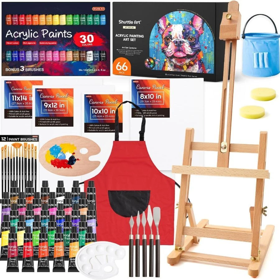 66 PACK COMPLETE SET : Shuttle Art 66 pack acrylic paint set contains 30 colors acrylic paints(12 ml tube) and 1 foldable wooded easel, 12 paint brushes, 5 painting knives, 12 multisize painting canvas, 2 mixing palettes, 1 water bucket, 2 art sponges and 1 art apron. Complete acrylic paint kit includes everything you need for painting PREMIUM QUALITY : Artist grade acrylic paint bring bright colors, thick and creamy texture, as well as incredible consistency to painters. Foldable wooden easel, brushes and mixing palettes are reusable for many years when well-preserved. Conforms to U.S. ASTM D-4236 & EN71-3, non-toxic and acid-free, safe and suitable for all ages PROFESSIONAL PAINT SET : Multi-size and shaped paint brushes, art knives and painting canvas bring more creative possibilities. Adjustable wooden easel make painting much easier and more professional. Water-proof art apron keep your clothes clean. We've got everything for you PREFERRED GIFT : With 30 rich colors acrylic paints, abundant tools and painting accessories, this art painting set is a great starter kit for both kids, adults, beginners, professional artists and anyone who loves art. Great for yourself, or as a gift for someone else On Jan 2, 2025 at 18:14:25 PST, seller added the following information: