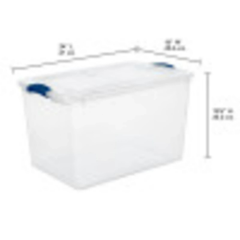 Product details Step up to Sterilite’s versatile 66 Quart Clear Latching Storage Bin and get organized! The clear base and lid let you easily view and locate stored contents from any angle. The color accent latches keep the lid attached to the base, to keep items contained. The recessed lids help bins stack neatly for efficient use of vertical space. This popular size plastic storage container is perfect for clothing, blankets, boots, off-season gear, and bulky items. This is the ideal solution for a variety of storage challenges, helping to bring order to closets, bedrooms, craft rooms, and dorms! Sterilite 66 Quart Latch Box, Clear Plastic Storage Bin with Lid, Blue Latch Outside Dimensions: 24" x 16" x 13 7/8" Interior Dimensions at bottom: 19 1/2" x 13 1/8" x 13 1/8" Clear lid and base for easy identification of contents from any angle Color accent latches keep lid secure and contents in place Recessed lids allow bins to stack neatly to maximize vertical storage space, and the 32 Qt and 66 Qt bins use the same size lid allowing both the shallow and deep sizes to be stacked in same footprint Use good judgment when stacking items, keep heaviest bin at the bottom BPA-free and phthalate-free