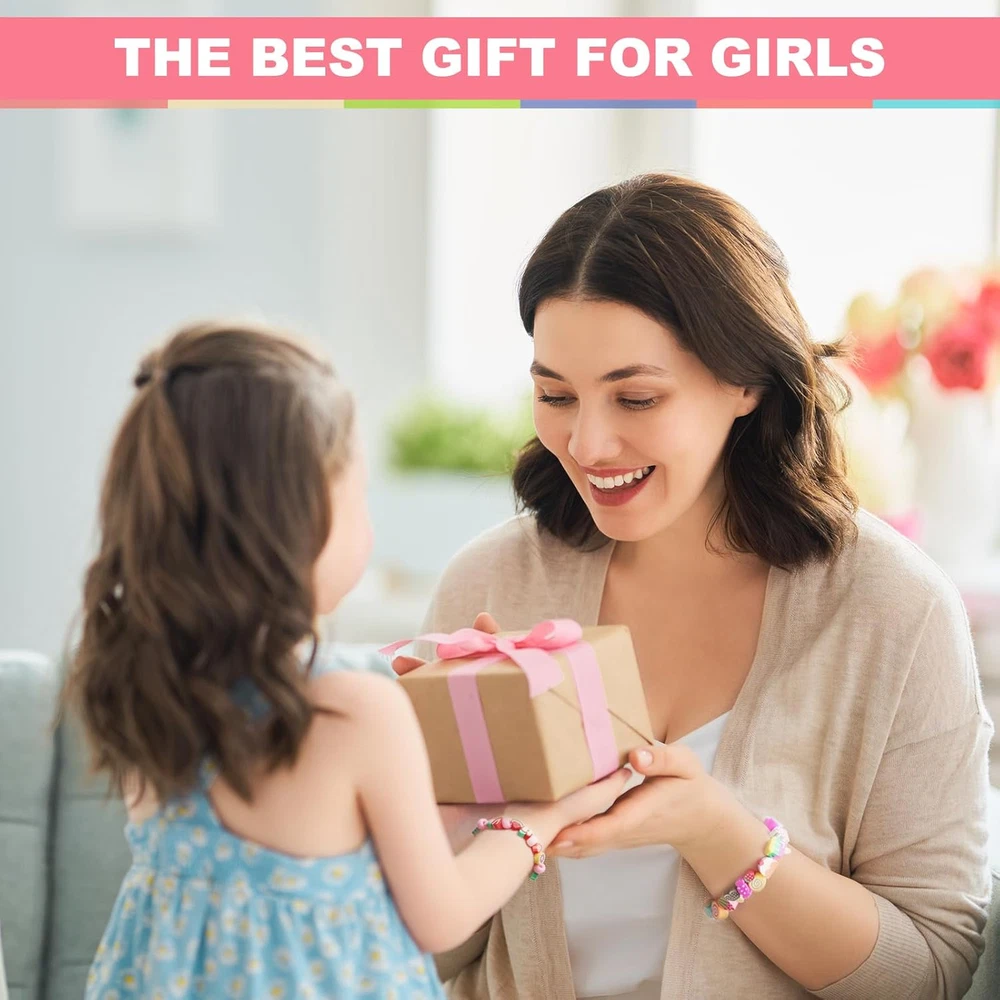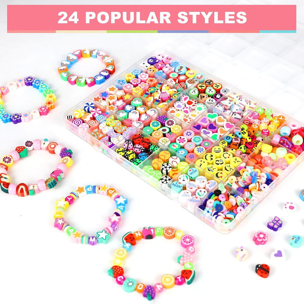 VALUE SET: One box contains 24 styles of polymer clay bead bracelets making kit, including letter beads, pony beads, clay beads, animal, Christmas Halloween, ladybug, flower, love, star, rainbow, fruit, smiley face, candy, butterfly, unicorn, ball beads etc. In addition to a roll of elastic thread, the rich variety provides excellent creativity for your DIY project, satisfying all your handmade desires. Suitable for making jewelry and home decor, unleash your imagination. SUITABLE SIZE: Polymer clay beads are approximately 10mm with a 2mm hole; flat clay beads are approximately 6mm with a 2mm hole; alphabet beads are approximately 4*7mm with a 1mm hole. All beads are stored separately in a 24-compartment plastic box, making them very easy to store and carry. ECO-FRIENDLY MATERIALS: Our beads are made of healthy and environmentally friendly materials that are not easy to fade, comfortable to wear, and of superior quality. Whether you are taking a shower, swimming, or engaging in other water activities, you can wear them with confidence. ENJOY DIY FUN: Clay beads charms are suitable for making bracelets, cell phone charms, necklaces, earrings, eyeglasses chains, key chains, hair braids and so on. Try to use your imagination and explore more uses, you will be impressed by your excellent creativity. NICE GIFT CHOICE: Clay bead bracelet making kit is an ideal gift for your friends, you can also make unique decorations for them, they will love it! Suitable for DIY crafts with kids, cute charms for bracelets can improve their creativity, imagination, color perception, hands-on ability and attention. Product Description Redtwo's polymer clay beads are made from safe materials with great toughness and quality. Ideal for kids and adults who love DIY, whether making bracelets, necklaces, earrings, or other fun projects. This vibrant kit has everything you need to bring your ideas to life! 24 Styles of polymer clay beads offer all the options you need for colorful DIY projects, With 660+ polymer clay beads and accessories, you can create a variety of jewelry and crafts.Made from quality materials, these beads provide flexibility, durability, and safety for your creations.
