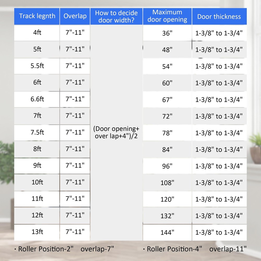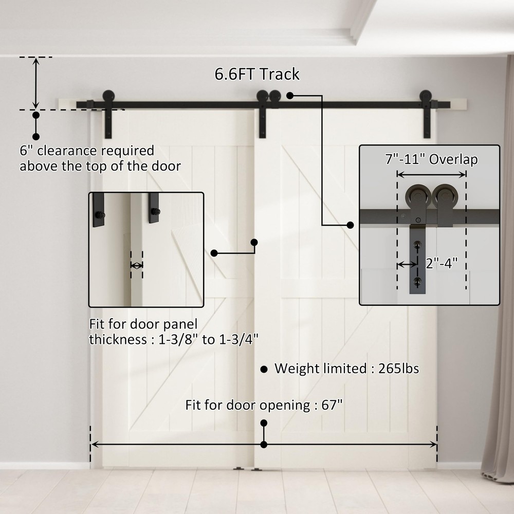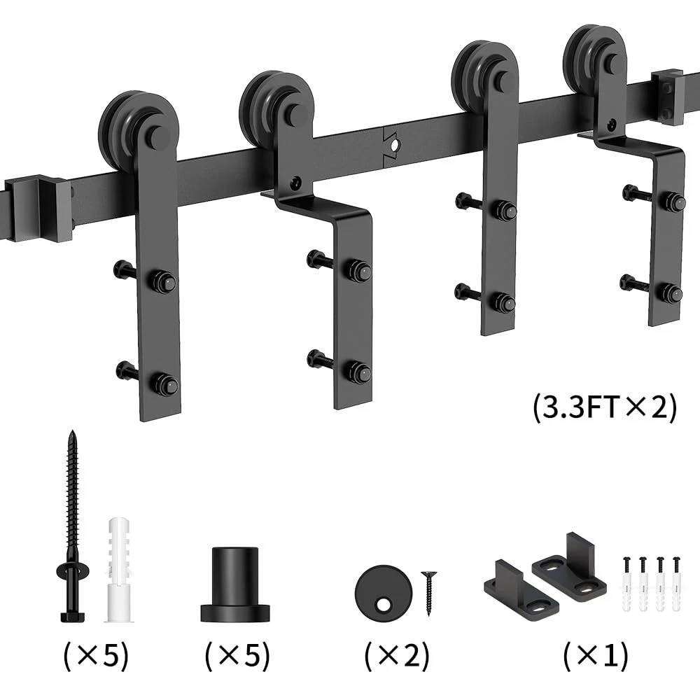 Single Track Bypass Barn Door Hardware Kit-I Shape [Single Track Bypass Barn Door Hardware Kit] Condition: New; Material: Carbon Steel(High Standard); Surface: Black Powder Coated(Anti-Rust); Door weight capacity: 265 lbs; Fit door panel width: Up-39.6"; Door Thickness: 1 3/8" - 1 3/4"; [One Single Track for Bypass System Available] Normally we need to install the bracket for bypass system,however it is not a easy job for most of us . Some Customer were not have enough space between the ceiling and Doors .But now it will not be a problem ,we have upgrade the bypass system and make it can be install on one track . [EASY TO INSTALL] Step by Step Instruction. Our Instruction is listing every step for installation, you can do it step by step, It is very easy when you install the barn door hardware.In case you get any problem or missing parts during installation ,please free feel to . [Package Included] 2*3.3FT Flat Track ,4*Rollers , 2*Anti-jump Pads ,2*Floor Guides ,2*Door Stoppers ,5*Leg Screws ,5*Wall Spacers ,1*Manual [IMPORTANT] "ONLY HARDWARE KIT INCLUDING, BARN DOORS WERE NOT INCLUDED."