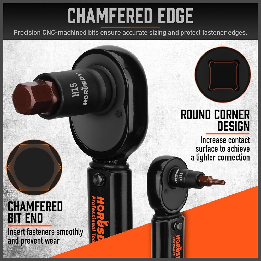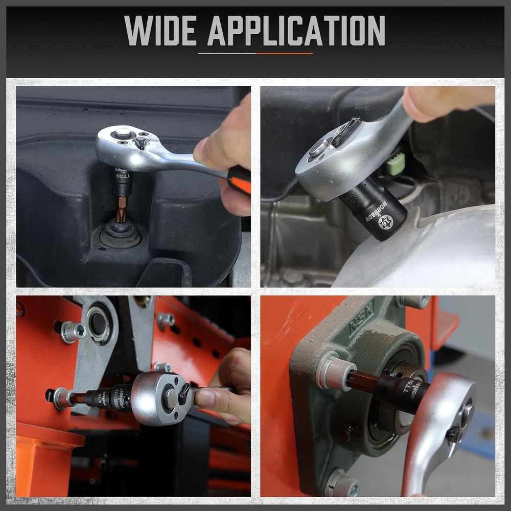 HORDSY 66-Piece Allen & Torx Bit Socket Set - S2 Steel SAE/MM, Star & Female E-Torx Sockets, 4 Impact Socket Adapter About this item PREMIUM QUALITY - Crafted from heat-treated CR-V and S2 alloy steel, our 66-piece Torx bit socket set ensures durability and corrosion resistance, ideal for any automotive mechanic or DIY enthusiast. COMPLETE KIT - This comprehensive set includes T6-T70 star bits, E4-E24 E-Torx, and both metric and SAE hex socket bits, providing the perfect tools for any task, whether using a driver, wrench, or ratchet. ORGANIZED STORAGE - The compact and sturdy case keeps all 66 pieces well-organized and easy to carry, ensuring that your tools are readily accessible wherever you need them. VERSATILE COMPATIBILITY - Perfect for use with manual torque tools, our Torx/Star bit set includes all necessary sizes for bicycles, cars, appliances, lawn equipment, machinery, and any other tasks. EASY IDENTIFICATION - High-contrast laser markings on each socket make size identification quick and accurate, streamlining your workflow and eliminating guesswork in finding the right tool.