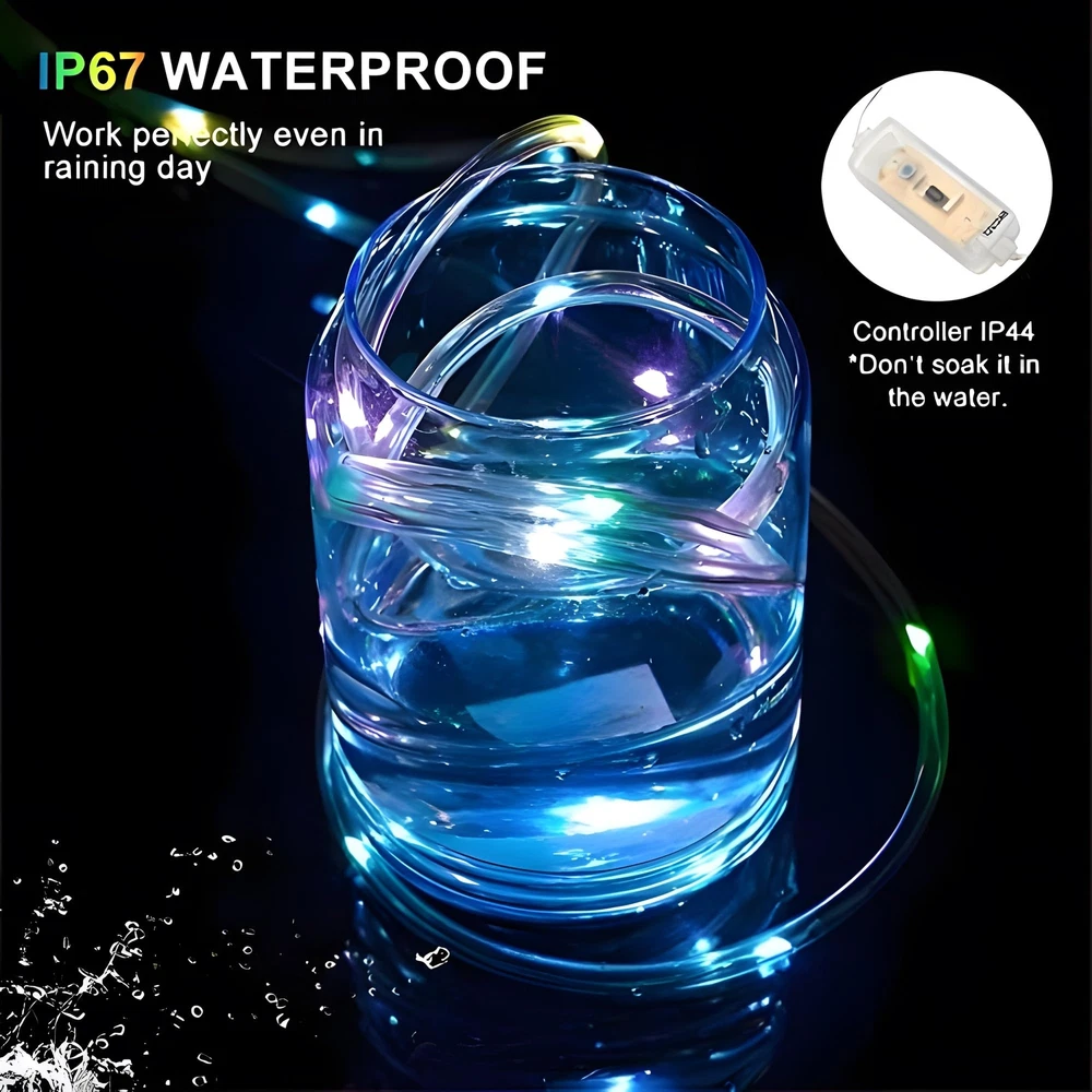16 COLORS CHANGING STRING LIGHTS: With 16 vibrant colors to choose from, our outdoor led lights are perfect for adding a touch of color and creativity to any occasion. Whether you want to set a romantic mood with soft pinks and reds on Valentine's Day, celebrate St. Patrick's Day with festive green, or create a fantastical ambiance with orange and purple for Halloween, these lights meet your requirements. MEMORY & TIMER FUNCTIONS: Our rope lights are equipped with a multifunctional remote that allows for your customization. With the timer function, you can set the lights to automatically turn off after 4, 6, 8, or 24 hours. The remote also allows you to adjust the speed of the 7 lighting modes with the “speed” button. Additionally, the memory function ensures that the lights will remember your last setting even after being turned off by the remote, eliminating the need to reset them every time. VERSATILE LIGHTING MODES:With 7 lighting modes to choose from, you can easily set the perfect ambiance for any occasion. The available modes include Fade, Jump, ASYN Fade, ASYN Jump, In Waves, Strobe, and Twinkle. With upgraded color options available, you can brighten up your Christmas decorations with multicolored modes. If you're decorating for July 4th, simply press the multicolor button twice to switch to the red, white, and blue lighting modes. IP67 WATERPROOF: Our led rope lights are designed to withstand various weather conditions, including rain, wind, snow, and fog, making them an ideal choice for outdoor & indoor decorations. Whether you're hosting a party, celebrating Christmas, Halloween, Thanksgiving, or any other special occasion, our rope lights are a perfect addition to your decor. WIDELY INDOOR & OUTDOOR USED: The IP65 waterproof rating of these led rope lights outdoor waterproof makes them suitable for a wide range of indoor and outdoor uses. You can wrap them around a tree, backyard fence, or porch for a festive touch, or use them to decorate your living room or bedroom. They're also great for outlining your deck, window, door, pathway, or walkway. EASY TO INSTALL: The sturdy yet thin covering makes it easy to wrap the lights around any surface or object. Additionally, our colored rope lights are lightweight, making them easy to maneuver and install. The lightweight design allows for simple installation using either clear packing tape or clips.