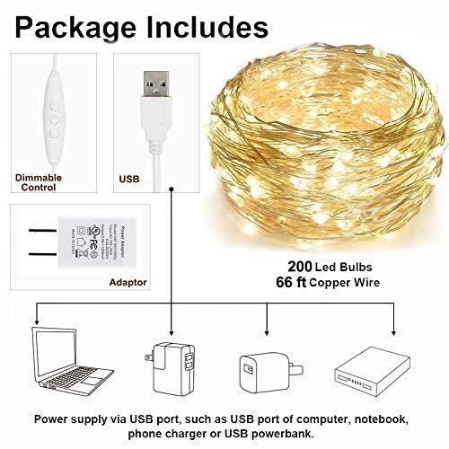 66ft USB Fairy Lights with 200 LEDs - Copper Wire & Adapter Powered