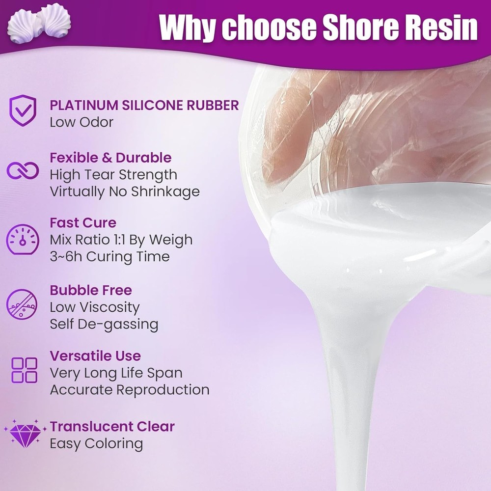 Silicone Mold Making Kit,66oz Platinum 66.01 OZ, Translucent Product Details Brand: SHORE RESIN Specific Uses For Product: Casting, Art, Craft Material: silicone rubber Compatible Material: Resin, Wax, Gypsum, Soap, Candle, Polymer Clay Item Form: Liquid Special Feature: Silicone moulds are non-toxic and odourless Color: Translucent Item Package Quantity: 1 Item Volume: 66 Fluid Ounces Specific Gravity: 0.95 Kilograms per Cubic Meter Viscosity: Low Full Cure Time: 3 Hours Water Resistance Level: Waterproof Unit Count: 1.0 Count Manufacturer: HUIZHOU JINCHENG COMPOSITE MATERIALS CO.,LTD Product Dimensions: 5.51 x 5.12 x 7.32 inches Item Weight: 4.12 pounds Item model number: 818AB-F Batteries required: No Included Components: Instruction Guide Import: Imported 【Premium Platinum Silicone Rubber – 15A Medium Hardness】 Our platinum silicone rubber is specially formulated for mold making kits, offering superior elasticity and tear resistance at 15A hardness. This liquid silicone cures into a durable, flexible silicone rubber mold ideal for repeated use in resin and craft projects. 【Simple 1:1 Mixing Ratio for Easy Use】 This silicone kit includes Part A and Part B with a precise 1:1 mixing ratio by weight, making the silicone mold making process straightforward. Mix thoroughly for 3 to 5 minutes to achieve a smooth, bubble-free liquid silicone perfect for beginners and professionals. 【Generous 66oz Volume for Multiple Projects】 Each set contains 66oz of high-quality silicone rubber, enough for creating multiple resin molds or custom silicone molds for jewelry, crafts, and more. Perfect for hobbyists and small businesses looking to expand their creative possibilities. 【Translucent & Flexible Mold Material】 The translucent nature of the platinum silicone rubber allows easy detection of air bubbles during the silicone mold making process. Once cured, the mold offers excellent flexibility and detail capture, ensuring professional-quality silicone rubber molds every time. 【Versatile Mold Making Kit for Various Applications】 Our mold making kit is compatible with epoxy resin, UV resin, wax, soap, and clay. Whether you're crafting jewelry, resin art, or DIY home decor, this silicone kit helps turn your creative ideas into reality with ease and precision. 【24/7 Support for a Hassle - Free Experience】 We prioritize your satisfaction. Our 7×24 - hour support team is ready to assist with any questions about silicone molds, resin molds, or liquid rubber usage. Whether you need technical guidance for mold making or help with resin kits, we provide prompt solutions. Shop confidently, knowing we’re your reliable partner for all silicone and resin crafting needs.