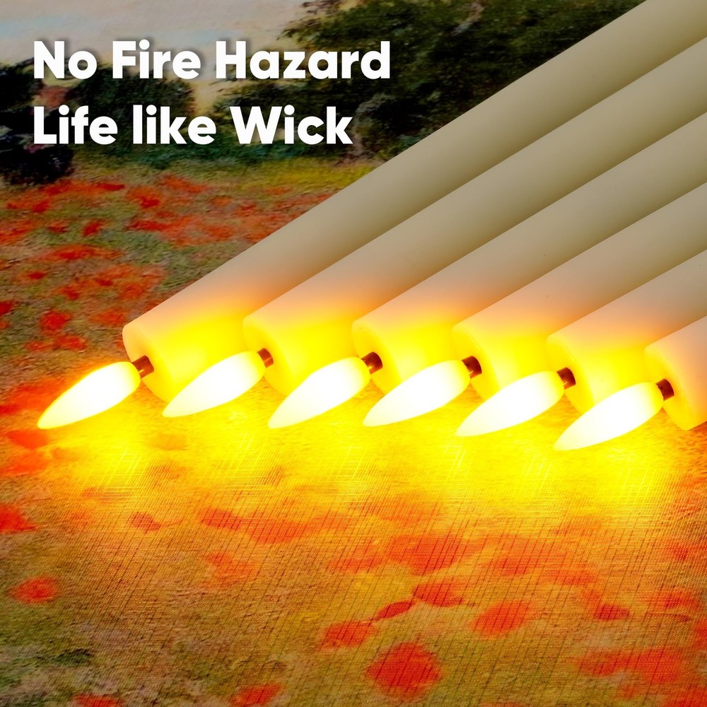 LED flameless taper candles battery operated with automatic timer remote Realistic flame and Appearance:These realistic LED taper candles are made of plastic that is unmelted and won't crack or deteriorate over time, the underside of the flame is adorned with melted and dripping wax, the 3D flame design with flickering warm yellow light makes the candle even more lifelike and perfectly mimics a real burning taper candle. Remote Timer Dimmer: has customized all the functions you need. (1). 2 light modes, simulate flickering flame light or steady light. (2). The 2-4-6-8 hours timer function saves your time to turn these flameless candlesticks on and off at the same time every day. (3) Create the warmest lighting effect through the dimmer to make it brighter or softer depending on the mood you looking for. Safety LED Battery Powered: Powered by 2 AAA batteries (Not Included), these flameless candles taper are fireless, dripless, and smokeless, never worry about your kids or pets getting hurt when using these led taper candles, LED candlesticks provide a safe alternative to traditional taper candles. Height 6.7”* Diameter 0.78”: The 6.7-inch window candle height is perfect for windowsills, fireplaces, and dining tables. Creating a romantic or warm atmosphere can become the best adornment. It will be perfect decorations for weddings, christmas or thanksgiving. Package and Service: Each package contains 6 pcs led taper candles, 2 pcs 10-key remote. Each battery powered taper candle is thoroughly and rigorously tested before sale, Avoid using them in high-temperature or high humidity environments. If any problems show up, please our Customer Support Team, we will always be at your service.