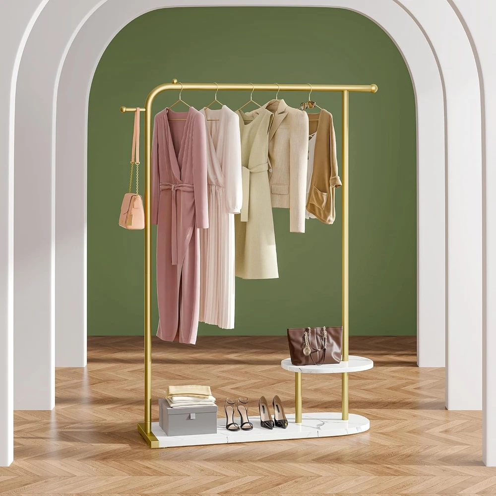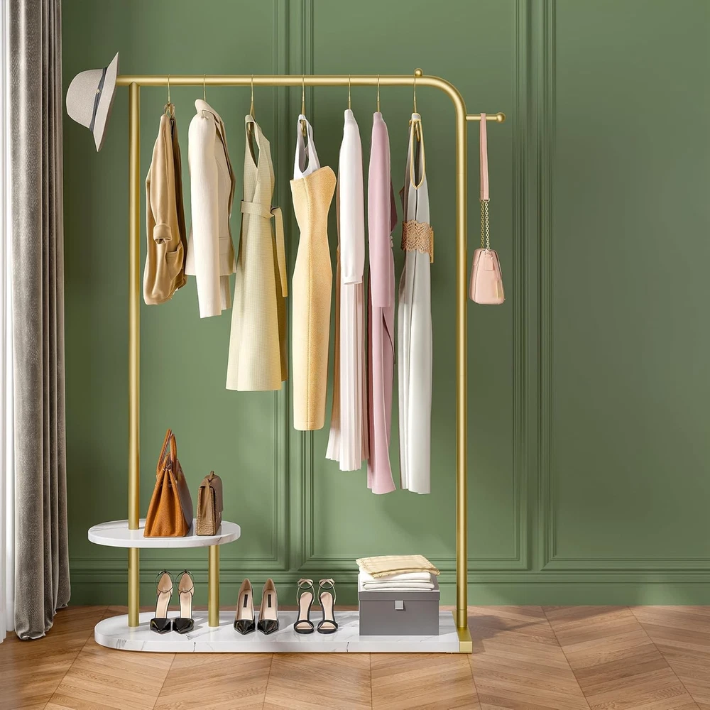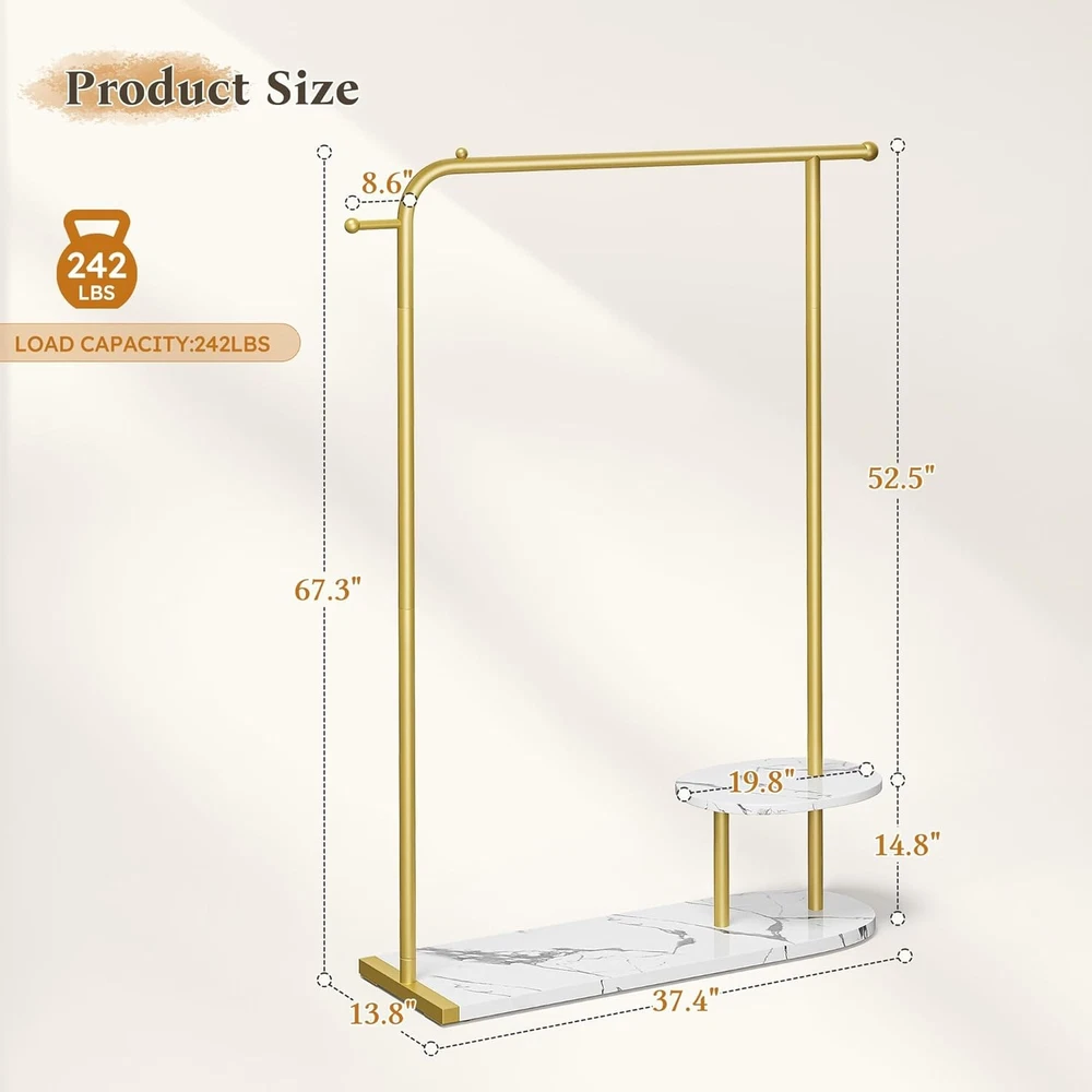 Product Description Modern Gold Clothing Rack with Two-tier Storage Less Clutter, More Living 3-in-1 Storage Solution Can it hold heavy winter coats? Yes, the gold coat rack can hold heavy winter coats, as it has a load capacity of 242 pounds. What is the height of this coat rack? This golden clothing rack stands at 67.3 inches tall, making it suitable for garments of all lengths — even long dresses fit with ease. Is the base made of marble? Not quite — it’s made from 2.5cm-thick PB board, which is not only lightweight and durable but also scratch-resistant and ideal for everyday use. Where can this gold clothing rack be used? Whether in your home or a boutique, this rack’s sleek and modern design blends effortlessly with any décor — adding a stylish and luxurious touch wherever it goes. On Aug 6, 2025 at 21:08:13 PDT, seller added the following information: