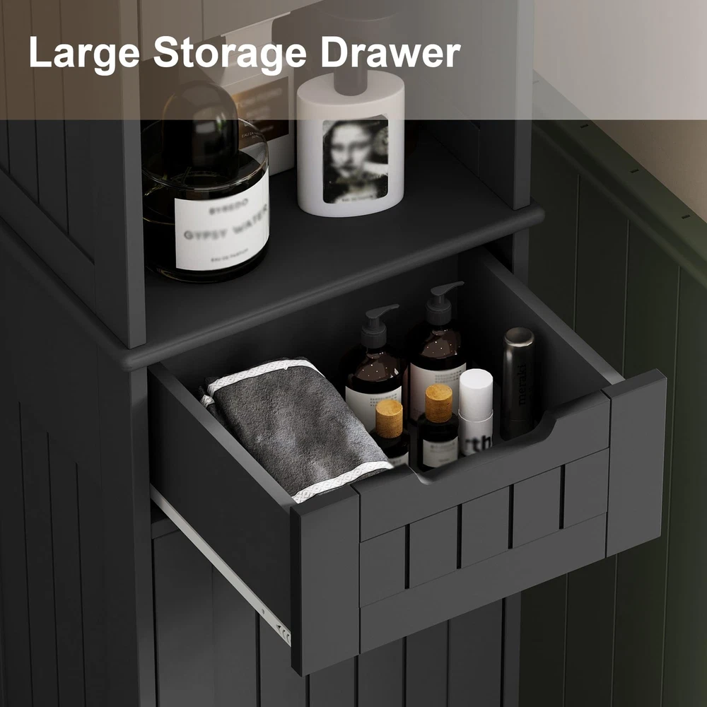 Tall Bathroom Storage Cabinet Freestanding adopting a high and low partition design, organize your personal belongings in an orderly manner. The adjustable shelves will easily adapts to the height of the items, and the fresh design will become a decoration for the room 【Use Every Inch For Storage】:Tall bathroom cabinets freestanding design 2 doors with adjustable shelves, which simultaneously meet the storage needs and sizes of items in the high and low areas. The slim bathroom storage cabinet has an accessible open storage space and small drawers with grooves can help store miscellaneous items, without the need to bend down, allowing the countertop to bid farewell to dirt and clutter. A reasonable and orderly storage design will maximize your vertical storage area 【Freestanding Multifunctional Cabinet】: Bathroom linen cabinet size is:15.7W*11.8D*67H, compared to the bulky size of a spacious cabinet, choosing a tall and thin cabinet can make your room appear larger, flexible, and convenient, making it more roles in the family. A narrow storage cabinet could as a living room cabinet for personalized customized space, a kitchen cabinet storage place for dishes and seasoning, and small spaces can also bring happiness 【Minimalist Bathroom Design】: Classic minimalism, the bathroom floor cabinet has top curved carving, a door panel like a small door paired with round silver handles, warm and elegant, unified pull wire design around the cabinet to showcase details, not too prominent in the room, allowing more light to pass through the surroundings, making it the best choice for bright bathrooms 【Comfortable and Safe】: Narrow tall bathroom cabinets are made of high-quality MDF board, coated with waterproof coating on the surface, durable construction measures long lasting performance. 360-degree opening and closing angle cabinet door, unrestricted access, bottom hollowed-out design away from damp ground, equipped with an anti-tipping device to protect your and your family's safety 【Easy to assemble】: Due to its simple design, labeled accessories, and detailed instructions, you can get a practical freestanding storage cabinet tall narrow cabinet easily and quickly
