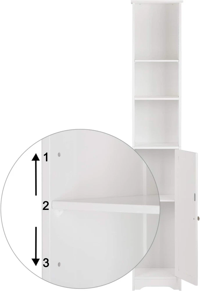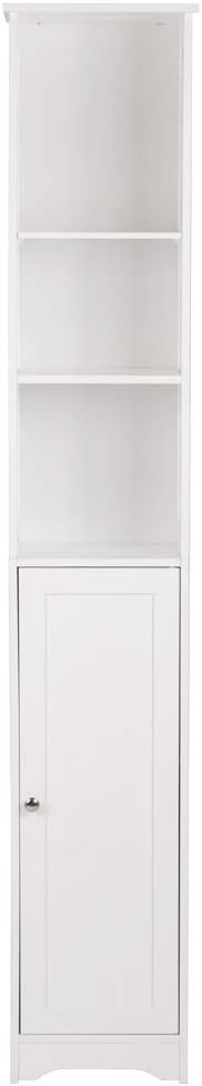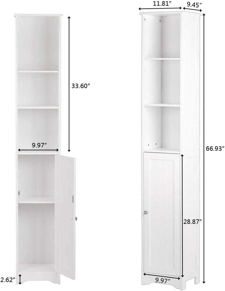 Narrow Cabinet, 67" Tall Slim Bathroom Storage Cabinet 12" Wide White Skinny Linen Cabinet with 3 Open Shelves Single Door Adjustable Shelf Space Saving Corner Pantry Product Description About this item Tall Narrow Cabinet-- This vertical pantry cabinet is not limited to the bathroom. It can be used in various rooms, such as the bedroom for skincare products and cosmetics, the living room for craft supplies, the kitchen for kitchen supplies, and the office for file organization. Skinny Cabinets for Tight Spaces-- This narrow storage cabinet is perfect for small spaces, as it can be assembled in a corner without taking up much floor space. Keep your belongings organized behind the door and on the 3 open shelves. Ample Storage Space-- With enclosed Adjustable Shelves and 3 open shelves, this tower cabinet provides plenty of space to store towels, soap, tissues, and other decorative items. Keep your bathroom supplies neatly organized. Adjustable Shelf Height-- The Storage Cabinet features an adjustable shelf with 3 different heights, allowing you to customize the storage space according to the size of your items. Meet your different storage needs effortlessly. Easy Assembly and Reliable Customer Service--This slim cabinet unit is easy to assemble with included instructions and mounting hardware. If you have any questions or need assistance, our 24-hour customer service and 12-month warranty are here to help. Slim Line Storage Cabinet - Perfect for Maximizing Your Space! Are you looking for a stylish and space-saving storage solution? Look no further! Our 11.81" x 9.45" x 67" narrow cabinet is designed to optimize your living space while adding a touch of sophistication to your home. Crafted from high-quality P2 MDF material, this cabinet is both durable and eco-friendly. Specification Dimensions: (11.81 x 9.45 x 66.93)" / (30 x 24 x 170)cm (L x W x H) Storage Room Dimensions: The First/The Second Layer: (10.12 x 9.45 x 9.25-14.57)" / (25.7 x 24 x 23.5-37)cm (L x W x H) The Second Layer: (10.12 x 9.45 x 10.43)" / (25.7 x 24 x 26.5)cm (L x W x H) Door Dimensions: (10.12 x 29.33)" / (25.7 x 74.5)cm (L x W) Weight: 21.16 lbs / 9.6kg Space-Saving Design: With its slim profile, this cabinet easily fits into tight spaces, making it ideal for small apartments, bathrooms, or anywhere you need extra storage without sacrificing room aesthetics. Space-Saving Design: Three Open Shelves: The three open shelves provide ample room for displaying your favorite decor, books, or essentials. Keep your items organized and within easy reach. Space-Saving Design: Adjustable Shelf: The cabinet features a versatile interior with an adjustable shelf behind the stylish door. It offers three different height options, making it adaptable to your changing storage needs. Whether you want a tall, medium, or short cabinet, it's a breeze to adjust. Elegant Door: The cabinet door adds a touch of elegance to your space, concealing items you prefer to keep hidden. The door is designed for smooth and quiet operation. Upgrade your home organization with our Slimline Storage Cabinet today. Its sleek design, durable construction, and flexible storage options make it a must-have for any modern home. Maximize your space while enhancing your decor!