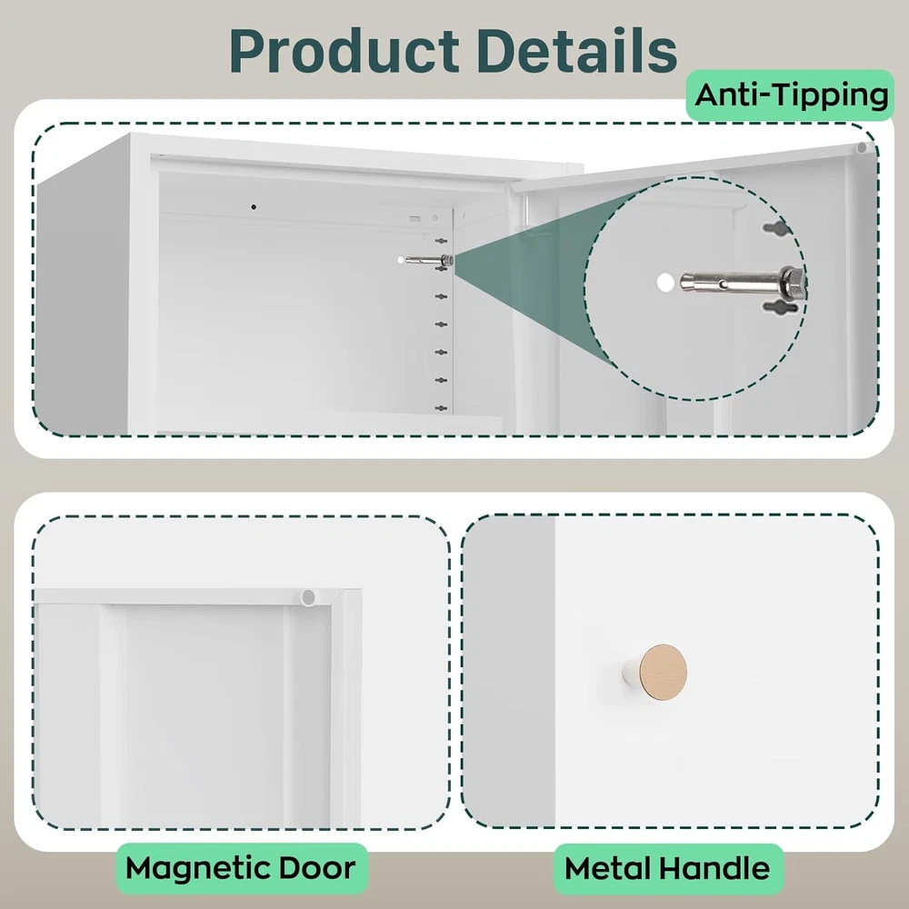 Product Description About this item Space Saving:Narrow bathroom storage cabinet Dimensions: 67"H x 15.7"W x 11.8"D. The vertically slim 15.7"W mordern storage cabinet is perfect for placement at the sink or toilet. 67"height provides plenty of vertical storage space, which not only utilizes upper space wisely but also takes up very little space, making it ideal for small areas in the bathroom or any other tight corners of the home. Multi-functional Storage:White tall bathroom cabinet has 2 closed storage cabinets and 2 open storage space and a drawer for a total of 7 tiers of storage, total weight capacity 1000 lbs.Optimal compartmentalization of cosmetics, cleaning supplies or kitchen pantry items. The pantry cabinet's 4 adjustable shelves allow you to customize the storage space to fit your storage needs, storing everything from tall bottles to towels. Separate closed drawer store toothbrushes and other cleaning items to keep it clean and sanitary. Unique Magnetic Door Design:With gold handles bathroom organizers and storage cabinet with built-in magnetic design of the door, not only can keep the item of the cabinet hygienic and neat, to isolate the air pollution; but also can keep the door closed at all times to protect privacy. The bathroom storage unit is ideal for shared bathrooms or homes with children/pets. Sturdy Material:Narrow storage bathroom cabinet are made of sturdy cold rolled steel construction with reinforced steel frames that not only securely hold heavy items, but also provide great stability and safety during use. Kitchen cabinet powder coated exterior is very easy to clean. Without smell metal storage cabinet is suitable for most homes to use with confidence. Easy Assembly & Customer Service:The narrow free standing storage cabinets is very easy to assemble, with all the parts in the package clearly numbered, easy to follow instructions, and an assembly video. Once assembled, you can easily organize everything in the space for a seamless transition from the bathroom to the kitchen, laundry room or entryway.We offer friendly customer service, if you have any questions, we will give you a satisfactory answer within 24 hours. Maximize your bathroom, kitchen, or laundry room with slim white metal cabinet.Features 4 adjustable shelves & drawer for customizable organization.Magnetic door secures items discreetly,while gold handles add elegance.Space-saving narrow design holds essentials vertically,perfect for tight corners. Bathroom narrow cabinet organization for every need.Top Cabinet: Secure private items out of sight.Open Shelf: Quick access to daily essentials like towels.Drawer Storage: Hide hygiene products neatly.Bottom Cabinet: Store spare supplies effortlessly. Tidy Hidden Storage : Narrow storage cabinet deep drawer keeps small items. No more cluttered counters. Flexible Space, Your Way : Adjust shelves to fit shampoo bottles or cleaning sprays. Custom layouts adapt as your needs change! Anti-Tipping Kit : Secure to walls on tall bathroom units. Strong Magnetic Door : Closes softly yet firmly. Premium Metal Handles : Gold finish adds refined style. Bathroom Storage Cabinet – Designed for Convenience