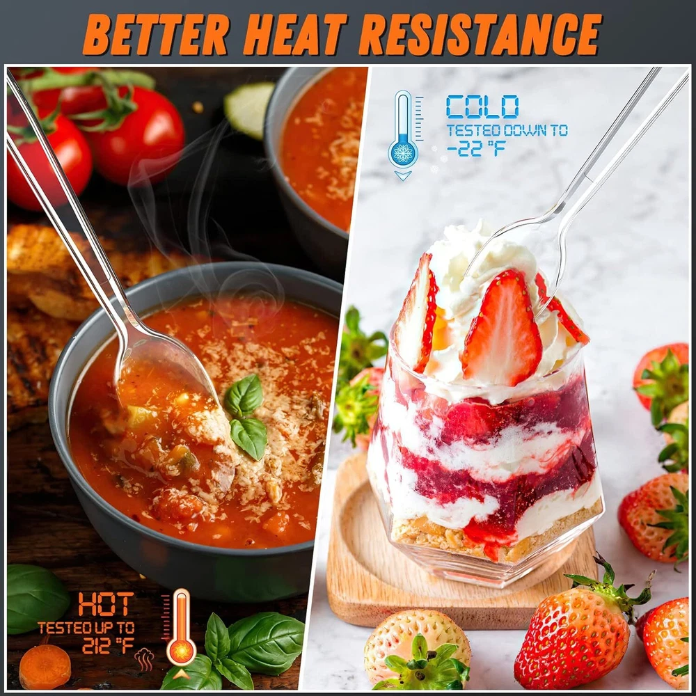 6.8" Clear Plastic Spoons Heavy Duty with Heat Resistant & 84 Count, Product Details Item Weight: 408 Grams Number of Pieces: 84 Is Dishwasher Safe: No Material Type Free: BPA Free Product Dimensions: 6.77 x 1.34 x 0.71 inches Item Weight: 14.4 ounces Manufacturer: Dipoo Country of Origin: China Item model number: S13304 Color: Clear Material: Polystyrene Brand: Dipoo Style: Spoons Product Dimensions: 6.8"L x 1.1"W 【Premium Material】: Our clear plastic spoons are made of heavy weight food-grade polystyrene, totally BPA-free & Toxin-Free. Premium material lead your healthy life. 【Durable & Heavy-duty】: Edge thickening design makes our spoons plastic disposable much more durable than others and won't bend easilly. They are perfect for any type of heavy, hard or dense food, you can enjoy your meals without worrying of dropping food. They are safe, Smooth edge design won't scratch your skin. 【Heat Resistance】: Upgraded material contribute to our plastic spoons better heat-resistant, Heavy duty spoons has been tested from -22°F to 212°F. You can enjoy your delicious food with our plastic spoons, for hot food or cold food. 【Size & Weight】: 6.8 inches length, 1.3 inches width & 0.16oz weight spoons are much more suitable for your families and friends. These sturdy spoons have smooth edges and easy to use. 【Party Necessary】In a wedding, picnic, banquet, large dinner, party, or other event with lots of guests, you can use our cutlery to have almost all kinds of meals, such as pasta, desserts, salads, snacks, fruit and favorite meats. Ultimate convenience for your party preparation and clear up.