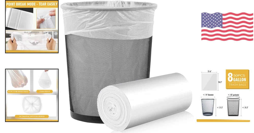 6-8 Gallon White Trash Bags - Bathroom, Bedroom, Office - Unscented - 50 Count ‹ › ‹ › ‹ › ‹ › ‹ › ‹ › ‹ › ‹ › 6-8 Gallon White Trash Bags -Bathroom, Bedroom, Office -Unscented -50 Count Features: MEDIUM TRASH BAG - 21.6" x 26.3" (55cm X 57cm) Fits round trash cans ≤ 14" diameter, height ≤ 21.20" and rectangular wastepaper baskets ≤ 43" girth and ≤ 21.20" height. Premium material - Made of pure HDPE material Odorless, non-breakable, more durable and more environmentally friendly. Translucent design - Allows easy viewing and identification of package contents to aid separation. Multi-purpose - Perfect addition to household cleaning supplies Compatible with most 6-8 gallon trash cans for bathrooms, living rooms, offices, bedrooms, kitchen and laundry rooms. 100% customer satisfaction - 12-hour customer support Benefits: Convenient size for various trash cans and wastepaper baskets Premium material ensures durability and environmental friendliness Translucent design allows for easy identification of contents Perfect for use in bathrooms, bedrooms, offices, and more Compatible with most 6-8 gallon trash cans Customer satisfaction guaranteed with 12-hour customer support Why choose our 6-8 Gallon White Trash Bags? Don't settle for flimsy, low-quality trash bags that tear easily and leave a mess. Our 6-8 Gallon White Trash Bags are made of premium HDPE material, ensuring durability and strength. With a convenient size that fits most trash cans and wastepaper baskets, these unscented bags are perfect for use in bathrooms, bedrooms, offices, and more. The translucent design allows for easy identification of contents, making sorting and disposal a breeze. Plus, with our 100% customer satisfaction guarantee and 12-hour customer support, you can buy with confidence. Upgrade your trash bags today and experience the difference! Add our 6-8 Gallon White Trash Bags to your cart now and say goodbye to flimsy, unreliable trash bags forever! Shipping Free & Fast Shipping - We offer free shipping to most of the USA with a normal delivery time of 3-7 days. However, due to the current situation, additional delivery time (up to 3 weeks) may be required for some items. Alternative Carriers - We may use alternative carriers (e.g. USPS, FedEx, UPS, etc.) to ensure your package arrives safely and on time. Due to the use of multiple carriers, we are unable to provide a tracking number automatically. Handling Time - Orders are processed and shipped within 1-2 business days of receiving cleared payment. Shipping Restrictions - Shipping to Alaska, Hawaii, Puerto Rico, Guam, and other US territories may incur shipping charges or delivery restrictions. Please contact us before ordering, or your order can be refunded/cancelled. State Restrictions - There may be restrictions based on your state of purchase. For example, certain items may not be shipped to California due to state regulations. Contact for Tracking Updates - If you require tracking updates or have any concerns about the delivery of your order, please feel free to contact us, and we will be happy to assist you. Return 30-Day Hassle-Free Returns - We want you to be completely satisfied with your purchase. If you are not, you can return the item within 30 days of receiving it for a full refund or exchange. Easy Return Process - To start a return, simply contact us and we will provide you with a prepaid return shipping label and detailed instructions. Restocking Fee - There are no restocking fees for returns. However, the buyer is responsible for return shipping costs if the return is not due to a seller's error. Refund Processing Time - Refunds will be processed within 5 business days of receiving the returned item in its original condition. Payment We accept all major credit cards, PayPal, and Apple Pay for your convenience. Your payment information is secure and encrypted to ensure a safe and seamless transaction. Please complete your payment within 3 days of purchase to avoid any delays in shipping. Feedback Your feedback is extremely important to us. We strive to provide the best products and customer service possible. If you are satisfied with your purchase, please take a moment to leave us a positive review. If you have any concerns or issues with your order, please contact us before leaving negative feedback. We are committed to resolving any problems and ensuring your satisfaction. Contact Us If you have any questions or concerns, please feel free to reach out to our customer support team. You can contact us through the eBay messaging system. We are available Monday to Friday, 9:00 am to 5:00 pm EST, and we will do our best to respond to your inquiry within 24 hours. Thank you for supporting our small family business!