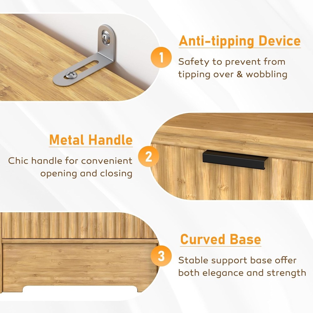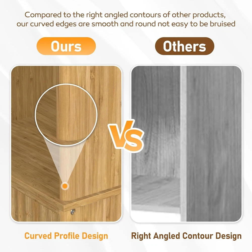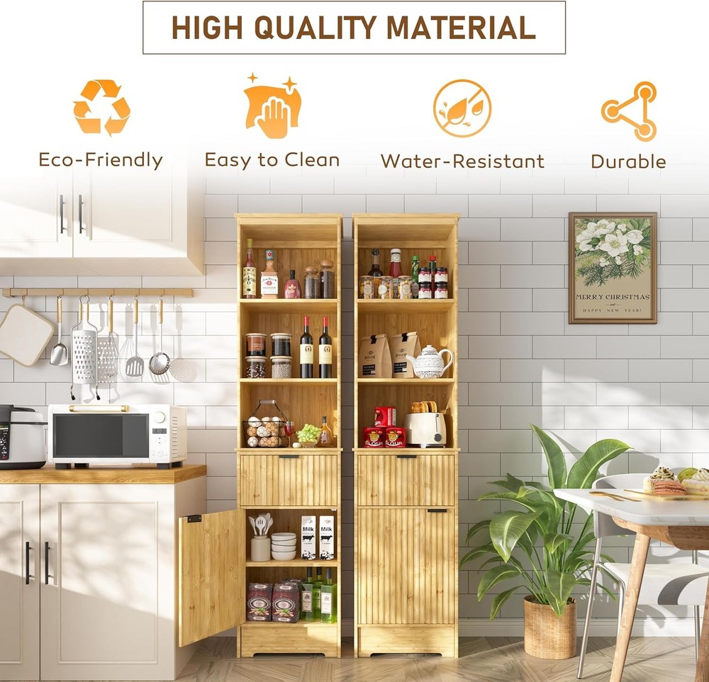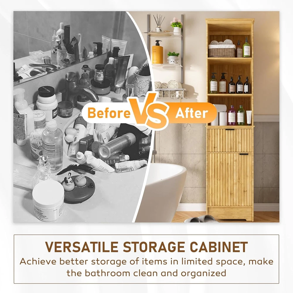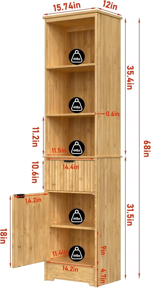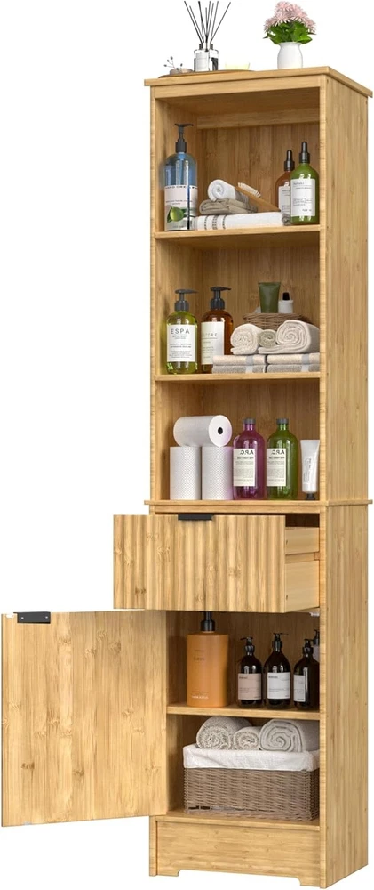 Product Description About this item • Spacious Multi-Surface Storage: Store towels, toilet paper, and essentials effortlessly with three open shelves, one large drawer and one enclosed cabinet. The floor space of 15.74"W x 12"D maximizes space in bathrooms or kitchens while keeping items organized • Premium Bamboo Durability: Made from preminum bamboo, harder than wood, 30% lighter weight. This cabinet is not only durable but also eco-friendly. Its natural material is resistant to moisture, suitable for long-term use in the bathroom environment • Safety First Design: Wall-mounted anti-toppling system included (hardware pre-drilled) and rounded edges prevent injuries. This feature is especially crucial in homes with children or pets, offering peace of mind by preventing accidental toppling and enhancing overall safety • Versatile Use: This Bamboo Freestanding Storage Cabinet is a perfect choice for small place, providing extra storage. This Storage cabinet can also be used in the living room, kitchen, laundry room, dining room to help you organize personal belongings • Space Optimized Dimensions: Overall size: 15.74" W x 12" D x 68" H; Overall open shelves size: 14.4" W x 11.5" D x 35.4" H; Cabinet interior size:14.2" W x 11.4" D x18" H; Each shelfs load capacity: 44lbs