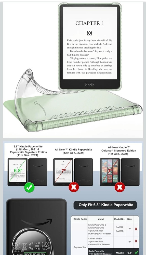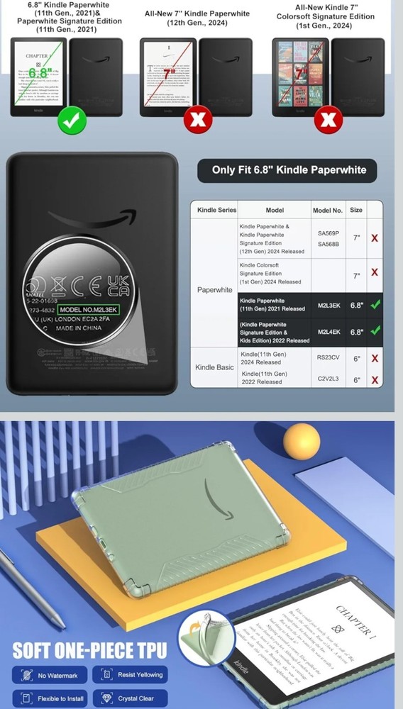 6.8" Kindle Paperwhite (11th Generation-2021) and Kindle Paperwhite Signature Edition, Ultra Clear Soft Flexible Transparent TPU Skin Bumper Back Cover Shell, Clear The product is a set of two protective shells or skins designed specifically for the 6.8" Kindle Paperwhite (11th Generation-2021). Made by the brand MoKo, these clear shells provide a secure fit to protect your device from scratches and impacts. The shells are specifically designed for the Kindle Paperwhite, ensuring a perfect fit and easy access to all ports and functions. Perfect for keeping your device safe while on the go.