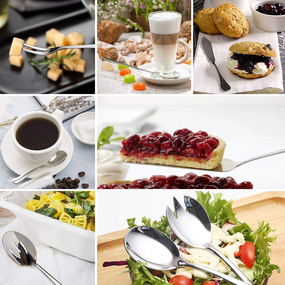 68 Pieces Set Service for 12: Including 12 dinner knives, 12 dinner forks, 12 dinner spoons, 12 tea spoons, 12 salad forks, Comes with 8-piece matching serving set, save the trouble of choosing serving utensils, Meet your daily dining needs. Make entertaining easier High Quality Material: Made of premium quality 18/0 stainless steel with no harmful substances, nickel free, healthy and rust-proof for daily use, Sturdy enough to serve you for many years, Serrated knife blade cut foods and meat thoroughly. Very smooth and shiny, not easy to collect stains, super easy to care, reducing your troubles Durable and Comfortable Holding: Solid construction not easy to bend after heavy use, Sturdy enough and great value for daily use, Not too heavy and didn't feel flimsy when holding in hand, Ergonomically designed for size and weight for easier daily use, Rounded edges without rough spot for holding comfortably Classic & Elegant Design: Mirror polished, smooth and shiny, never need to be polished. Classic and elegant design without complicated patterns disturbing your table setting. Its sleek and simple looking can match ANY tableware. This set is a must-have basic silverware for the family SUPERIOR SERVICE: Perfect basic set for daily use. Its elegant and classic appearance is applied to various occasions, hotels, restaurants, weddings, parties. It's also a very decent gift. Quality --Please feel free to us if you are not satisfied with our products, our excellent after-sales team will provide you with a satisfactory reply