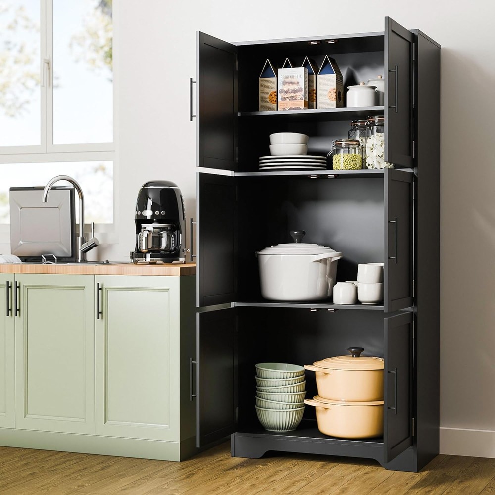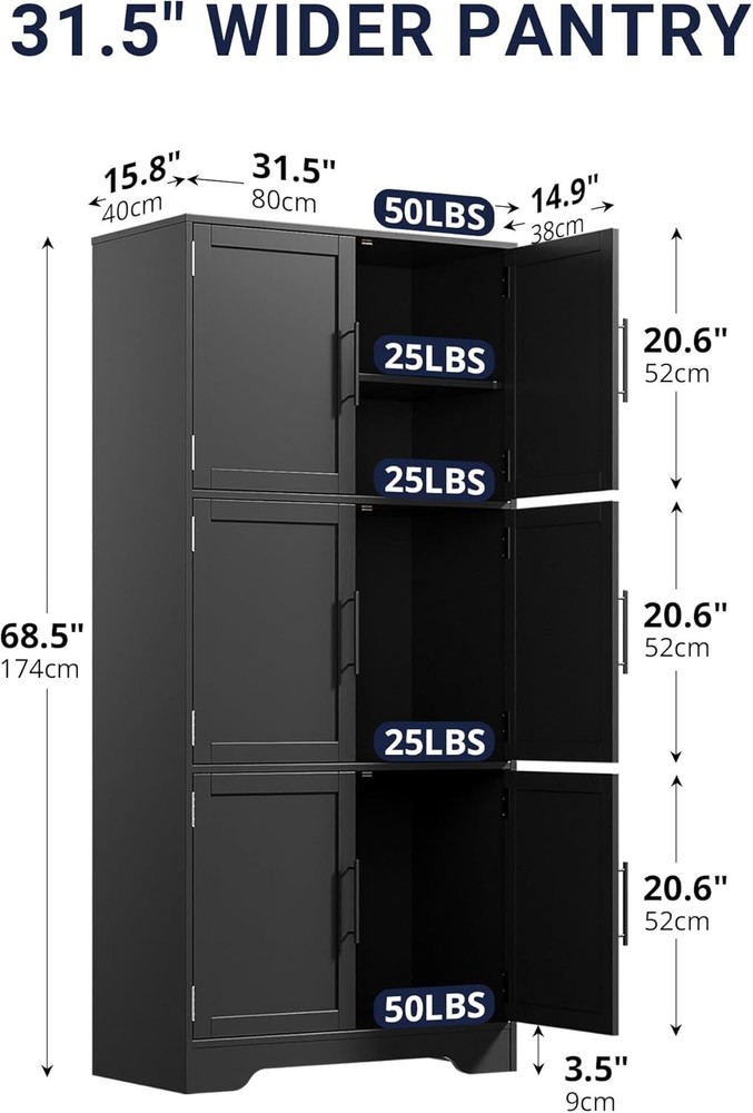 Product Description About this item Sturdy & Durable Construction: The kitchen pantry cabinet is made of premium engineered wood with a 44 lbs weight capacity per shelf. Whether storing heavy cookware or daily essentials, this cabinet with doors and shelves ensures stability and durability for years. Adjustable & Functional Shelving: Measuring 15.8"D x 31.5"W x 68.5"H, this hutch cabinet features 3 shelves, one of which is adjustable, allowing you to customize your storage space. Easily adjust the removable shelf to fit items of different sizes, making it a perfect cabinet organizer for your home. Modern Cabinet for Every Room: Upgrade your home organization with this tall kitchen pantry cabinet! It provides ample space to store kitchen essentials, dinnerware, or pantry items. Whether in the kitchen, living room, bedroom, or bathroom, this pantry cabinet meets all your storage needs. Anti-Tip Device for Safety: Our pantry storage cabinet comes with an anti-tip kit that secures it to the wall, preventing accidental tipping. The six metal handles provide a comfortable grip, making it easy to access your stored items. Easy to Assemble: Our linen cupboard includes detailed instructions and numbered parts for hassle-free assembly. If you encounter any issues, we will provide you with a satisfactory solution. Easier Living, Better Life Previous page Next page Previous page Next page