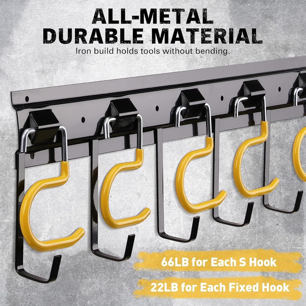 ALL-METAL DURABILITY - Built entirely from iron, this garden tool organizer boasts exceptional strength and stability. Unlike typical ABS hooks, our heavy-duty garage storage solution withstands the weight of shovels, rakes, and more without bending or breaking. VERSATILE ORGANIZATION - This all-in-one garage tool organizer features 20 adjustable, non-slip coated hooks, 24 fixed metal hooks, and 8 V-angle hooks, accommodating a wide range of tools such as mops, brooms, shovels, and rakes. With 16 heavy-duty screws and 16 durable dowels, it ensures stability and keeps your space tidy and accessible. ADJUSTABLE DESIGN - The garage tool organizer wall mount comes with adjustable hooks that can be easily repositioned to fit your needs. Perfect for organizing various tools, it adapts to different sizes and shapes, providing flexible garage storage solutions. LONG-LASTING RUST PROTECTION - Designed for both indoor and outdoor use, this garage organizer features anti-corrosion coating to withstand harsh conditions. Enjoy a tool organizer that resists rust and aging, ensuring long-lasting performance in any setting. EASY INSTALLATION - Quickly set up your garage tool organizer wall mount with included ABS nails, screws, and dowels. This garage organizer installs securely on any wall, making setup a breeze and saving valuable time. Product Description