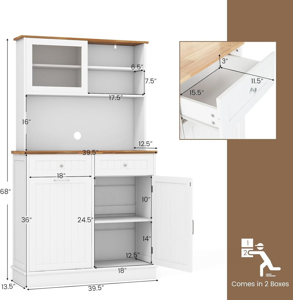Product Description About this item Multifunctional Hutch Cabinet: 68” tall buffet cabinet combines the functions of closet, bar, T tilting garbage cabinet, storage cabinet and so on. Can be used as hutch cabinet, kitchen island, buffet sideboard, coffee bar cabinet, laundry basket. Large & Sorted Storage Space: Featuring storage hutch, 2 drawers and bottom cabinet, the pantry cabinet provides versatile storage options for your kitchen supplies. Plus, wide rubber wood countertop with cable management hole is a convenient spot to keep appliances with reach. Hidden Garbage Holder: This kitchen hutch cabinet features a hidden 10-gallon holder to conceal the waste’s unpleasant odors and prevent pets from digging up trash. Can not only this tilt out trash bin cabinet serve to be a waste bin in the kitchen, but also be used as a laundry basket in the laundry room, a recycle bin, a pet food bin in the living room. Note: Trash Bin is not included. Use with Convenience: The 3-position adjustable shelves in the food cabinet can maximize the storage capacity of upper and bottom cabinets, ensuring efficient utilization of space. In addition, the sliding tempered glass cabinet allows for more storage convenience. Plus, provides cable management holes for organizing cords. High Reliable Structure: Thickened board with tight connection casts a firmly constructed kitchen cupboard. When set against the wall, the kitchen hutch with trash can storage hold in place with anti-tip devices to prevent rocking or tipping. Description: Say goodbye to a messy and smelly kitchen! This kitchen pantry cabinet features a hidden 10-gallon garbage holder, allowing you to conveniently dispose of waste while keeping it out of sight. With a spacious countertop and drawers, you will get ample storage space for essentials. The adjustable shelves provide flexibility to accommodate your storage needs for various items. Besides, the sliding tempered glass cabinet not only adds display options but also protects your belongings. Meanwhile, specially designed with anti-toppling device, the floor trash cabinet is stable enough to hold kitchen utensils without wobbling.This modern tall kitchen cupboard can be used as recycling cabinet, pet food storage cabinet and laundry sorted cabinet, providing versatility and convenience. Features: 10 gallon trash cabinet can keep pets away from waste and hide smell Rubber wood countertop is sturdy and durable for a long life span Storage cabinets with 3-position adjustable shelves fit different sized items Sliding tempered glass cabinet for easy access 2 drawers provide ample classified space for kitchen supplies Secure the trash can cabinet with anti-toppling device for higher stability Cable hole keep the messy wires hidden at the back Equipped with sturdy metal hinge for 30°max opening angle Smooth metal slides make it convenient to push in and pull out Widely use as a trash cabinet, laundry sorter or recycle bin Specifications: Color: White + Natural Material: MDF, Rubber Wood, Tempered Glass Overall Dimensions: 39.5" x 13.5" x 68" (L x W x H) Upper Storage Cabinet Interior Dimensions (Each): 17.5" x 6.5" x 7.5" (L x W x H) Countertop Dimensions: 39.5" x 12.5" x 16" (L x W x H) Left Side Cabinet Panel: 18" x 24.5" (L x H) Right Side Cabinet Upper Storage Compartment: 18" x 12.5" x 10" (L x W x H) Right Side Cabinet Lower Storage Compartment: 18" x 12.5" x 14" (L x W x H) Drawer Interior Dimensions: 15.5" x 11.5" x 3" (L x W x H) Weight Capacity in Total: 300 lbs Net Weight: 89 lbs Max Opening Angle: 30° Package Includes: 1 x Tilt Out Trash Cabinet 1 x Instruction