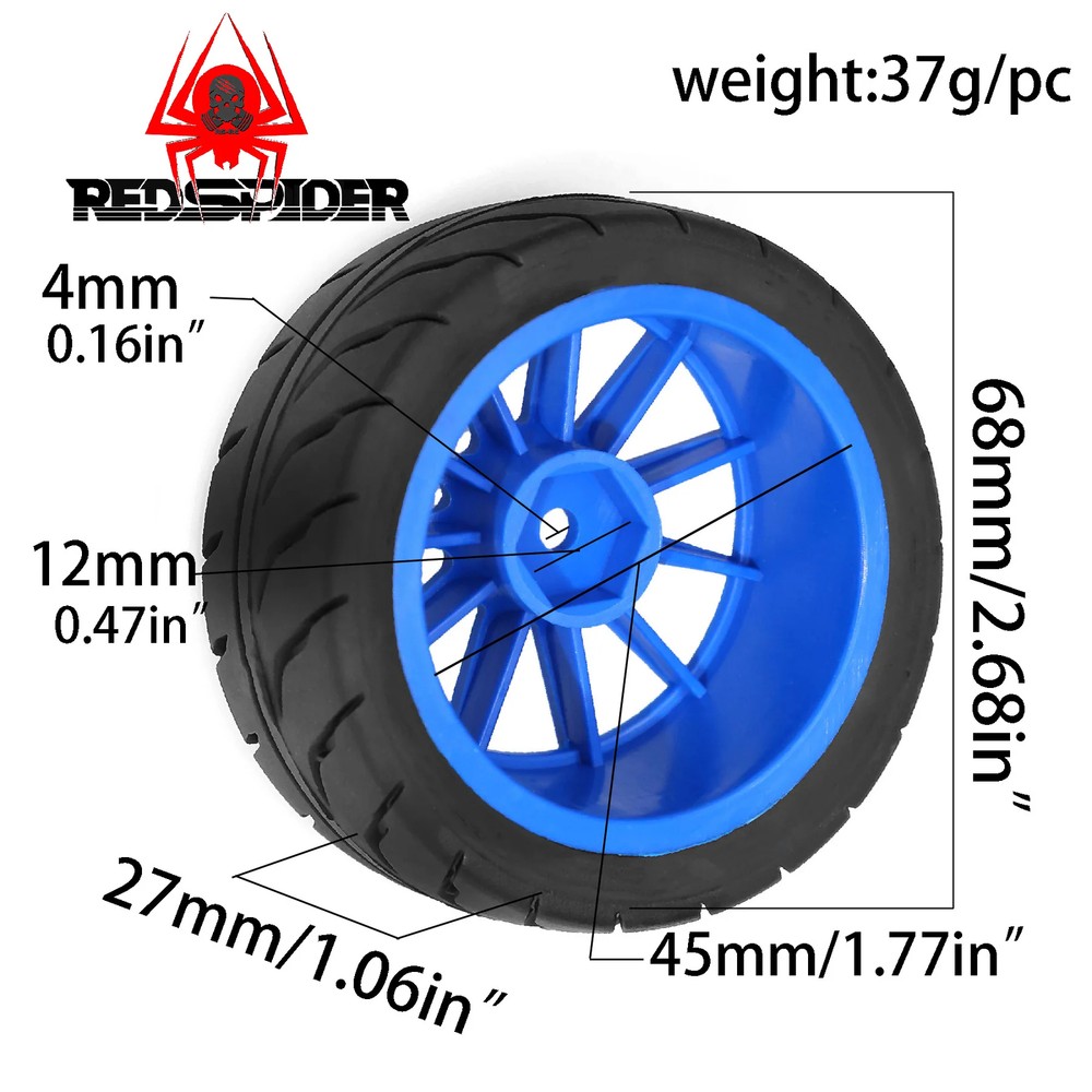 68MM 1/10 On Road Tyres 12mm Hex Wheels Rims for Tamiya TT01 TT02 XV01 TA06 PTG2 HPI KYOSHO HSP 1/10 Scale RC On-Road Car 4PCS ️ Product Data: Tyre OD: 68 mm (2.68 in) Tyre Width: 27 mm (1.06 in) Wheel ID: 45 mm (1.77 in) Drive Hex: 12 mm ️ Packaging: 4PCS (Rims + Tyres) NOTICE: The wheels and tires are not glued together and must be glued before use. Please carefully check the tire size before purchase, whether it is the same as your model tire size, and confirm it again before payment, so as not to return the refund, thank you, wish you a happy shopping.