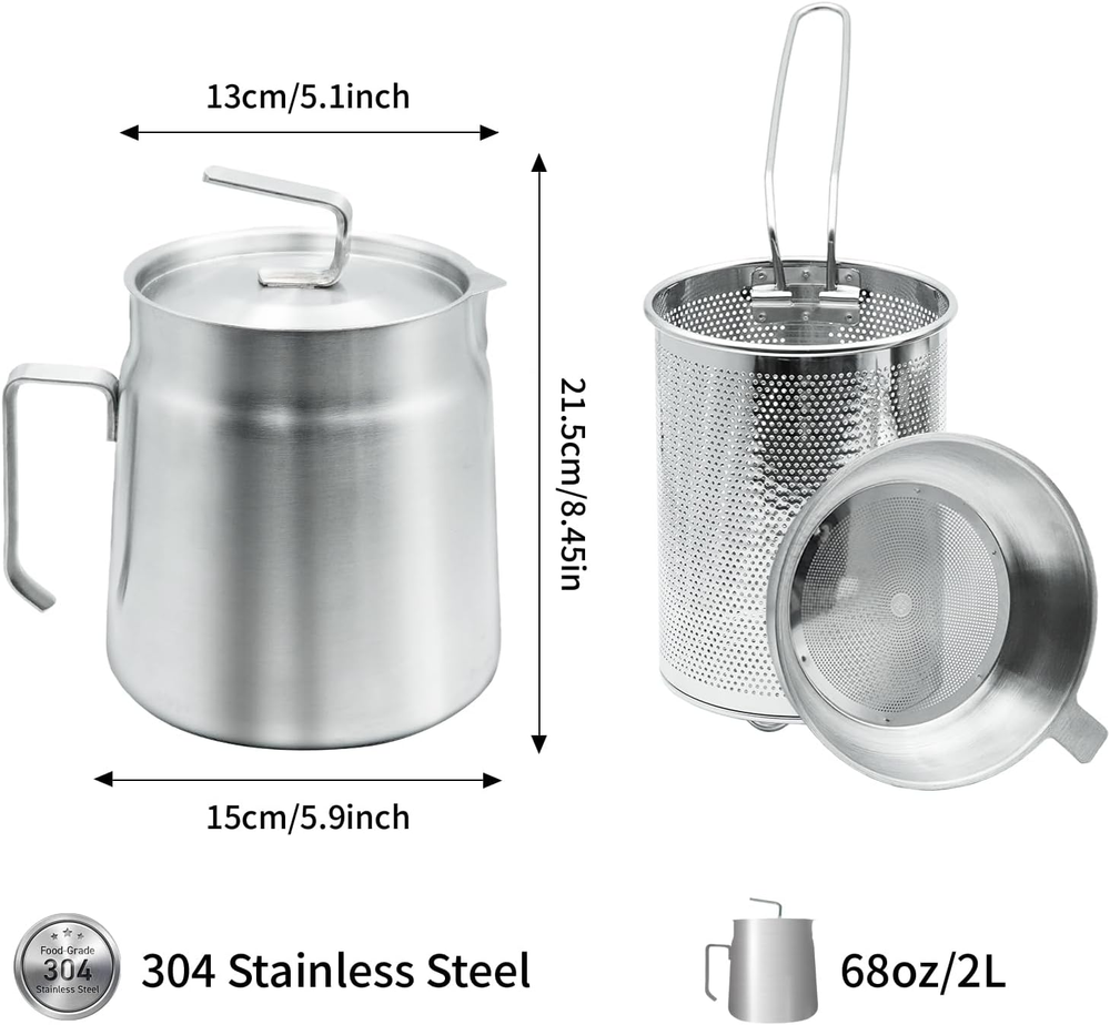Store New Arrivals Add to Favorite View Feedback Contact 68Oz Stainless Steel Oil Filter Pot with Deep Fryer Basket - Kitchen Large Capacity Versatile Oil Strainer Vessel and Bacon Grease Saver for Cooking Grease Description Capacity 4.3 Pounds Color Sliver Material Stainless Steel Item Weight 1.77 Pounds Is Oven Safe Yes Finish Type Uncoated Product Dimensions 5.7"D x 5.71"W x 8.45"H Coating Description Uncoated 【Food-Grade 304 Stainless Steel】All parts of our grease container for kitchen is made of SUS304 stainless steel, durable and safer than plastic for storing cooking oil, bacon grease, or frying leftovers. 【Large 68oz (2L) Capacity】With a capacity of either 2 liters/68 ounces, this bacon grease container with strainer is designed to handle a large amount of oil. It simplifies storage of various types of grease and oils, making it suitable for homes and restaurant kitchens alike. 【2-in-1 Multifunctional Design】This stainless steel oil filter combines three essential functions: refining used oil, storing filtered oil, and serving as a cooking container - reducing waste effectively. 【Enhanced Oil Filtration】This cooking oil filter features a built-in fine mesh filter that effectively captures dirt and debris. The filter has a handle so it can be lifted more easily, leaving your cooking oil clean and clear. 【Easy to Use】The stainless steel oil separator for cooking is equipped with a leak proof spout and an ergonomic handle, making pouring easy and effortless. The detachable frying basket handle design makes it more convenient to take and place food. Product description Elevate Your Cooking Experience Streamline Your Kitchen with Smart Oil Management Discover the versatility of our 68oz stainless steel oil filter pot. Combining durability with generous capacity, it excels at filtering and storing oils, preparing gourmet dishes, and streamlining your kitchen's oil management. Focus on details for your kitchen-(Swipe horizontally to view details) The size of the oil filter pot Name: 304 oil filter deep frying pot (with baking basket) Material: 304 stainless steel Capacity: 2.0L/68oz Size: 5.7*5.2*8.45 Inch Upgraded frying basket The new generation of baskets features an extended handle and is removable for better hand protection. It is designed with a small buckle that can be set up in the oil filter to drain the grease. Delicate spout The smooth spout and special deflector design make this oil filter full of practicality and design aesthetics. Comfortable and secure handle The handle part adopts a new design, the open handle is more conducive to holding, reinforced and welded, firm and durable. Delicate filtration This steel pour fryer enhances your oil refining efficiency with a built-in fine mesh strainer. The strainer includes a handle, making it easy to lift for cleaning and maintenance. A wealth of application scenarios await your unlocking Boil the soup Deep-fry Filter the oil residue Oil storage containers Trustworthy As a sincere wish 1. Improved Oil Refining Efficiency 2. Large-Capacity Stainless Steel Oil Strainer Pot 3. Premium Stainless Steel Material 4. Easy to Use 5. Multi-Functional Kitchen Tool More kitchenware accessories Add to Cart Add to Cart Add to Cart Add to Cart Add to Cart Add to Cart Customer Reviews 4.6 out of 5 stars 181 4.6 out of 5 stars 42 4.8 out of 5 stars 41 4.8 out of 5 stars 41 4.8 out of 5 stars 46 4.8 out of 5 stars 46 4.2 out of 5 stars 30 Price $23.99 $ 23 . 99 $24.99 $ 24 . 99 $19.99 $ 19 . 99 — $19.99 $ 19 . 99 $19.99 $ 19 . 99 $29.99 $ 29 . 99 material stainless steel silicone silicone silicone silicone silicone water-absorbing stone Function filtering, oil storage, frying Air Fryer Liners Heat Resistant Heat Resistant Heat Resistant Heat Resistant drying feature multi-functional reusable with a cookware holder with a cookware holder with a cookware holder with a cookware holder Quickly drain the water Usage scenarios Home and kitchen Home and kitchen Home and kitchen Home and kitchen Home and kitchen Home and kitchen Home and kitchen style Modern trendy design Modern trendy design Modern trendy design Modern trendy design Modern trendy design Modern trendy design Modern trendy design ABOUT US We offer the best prices around on high quality products. Our E-store includes media such as books, movies, music and games while offering electronics, toys, sporting apparel, clothing, tools, general home, garden items and more. SHIPPING We are always working hard to ensure your package arrives as soon as possible. Please understand that some factors like weather, high postal traffic, and the performance of shipping companies are outside of our control. We offer free shipping to the lower 48 states and ship within 2 business days of payment, usually sooner. We do not accept P.O. Boxes. Please provide a physical address. For shipping outside of the continental USA, we only use eBay's Global Shipping Program.The item is shipped to KY and then sent to the rest of the world. International customers are responsible for all duties and taxes. Continue to check out in order to calculate costs for shipping the item to your country. Messages regarding eBay's Global Shipping Program MUST be directed at eBay EXCLUSIVELY. RETURNS We offer a 30-Day Return Policy on items which you are not completely satisfied with. You have the option for a full-refund or an exchange of the item. No returns are available on items shipped outside of the USA. PAYMENT We accept PayPal. CONTACT US This page content is yet to come Please ad us to your favorite seller and visit again later Thank You CUSTOMER SATISFACTION We try our very best to make sure every customer is completely satisfied. If there's a problem, message us! We're happy to help. WE ACCEPT Copyright © 2021 AutoDS. | All Rights Reserved